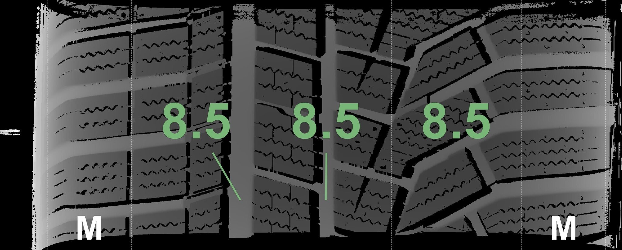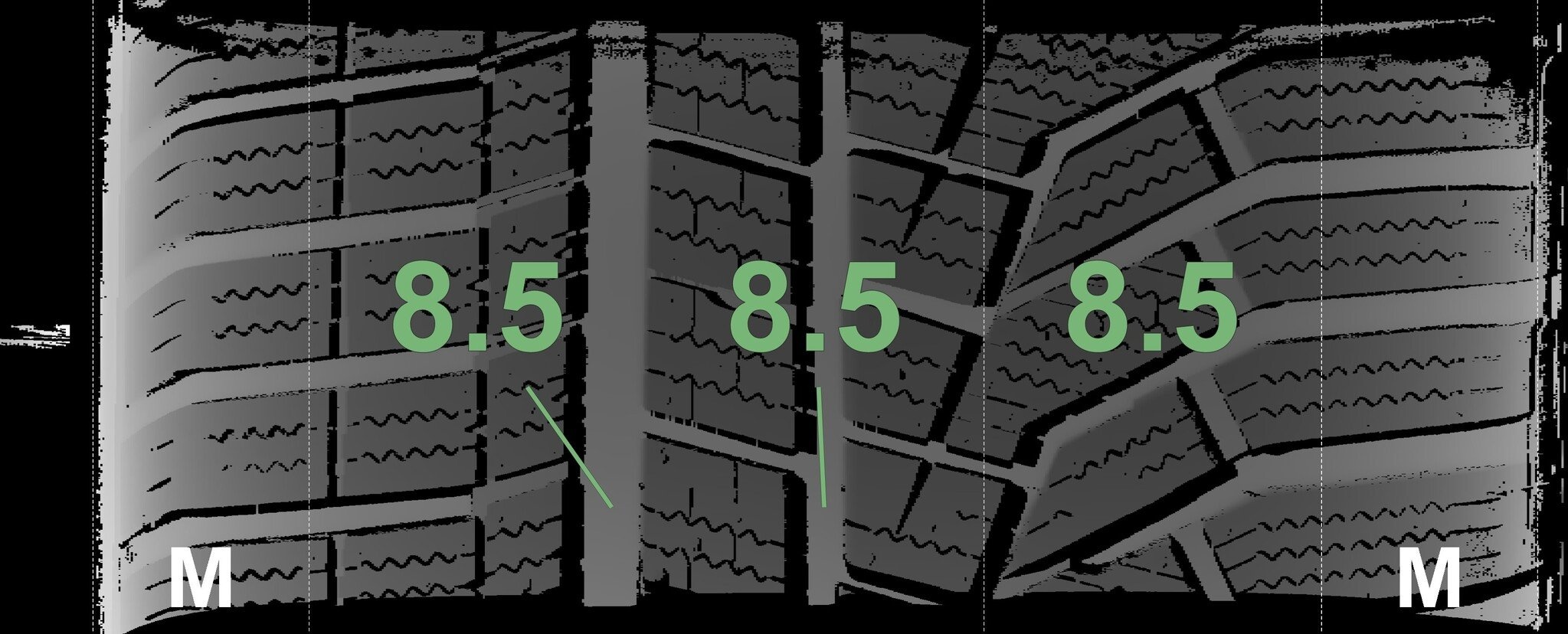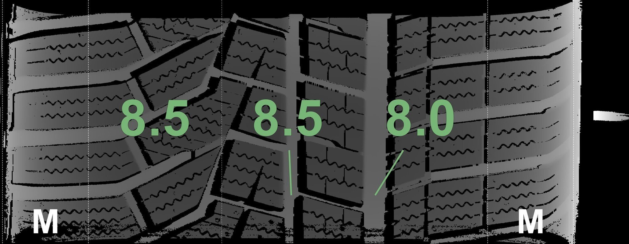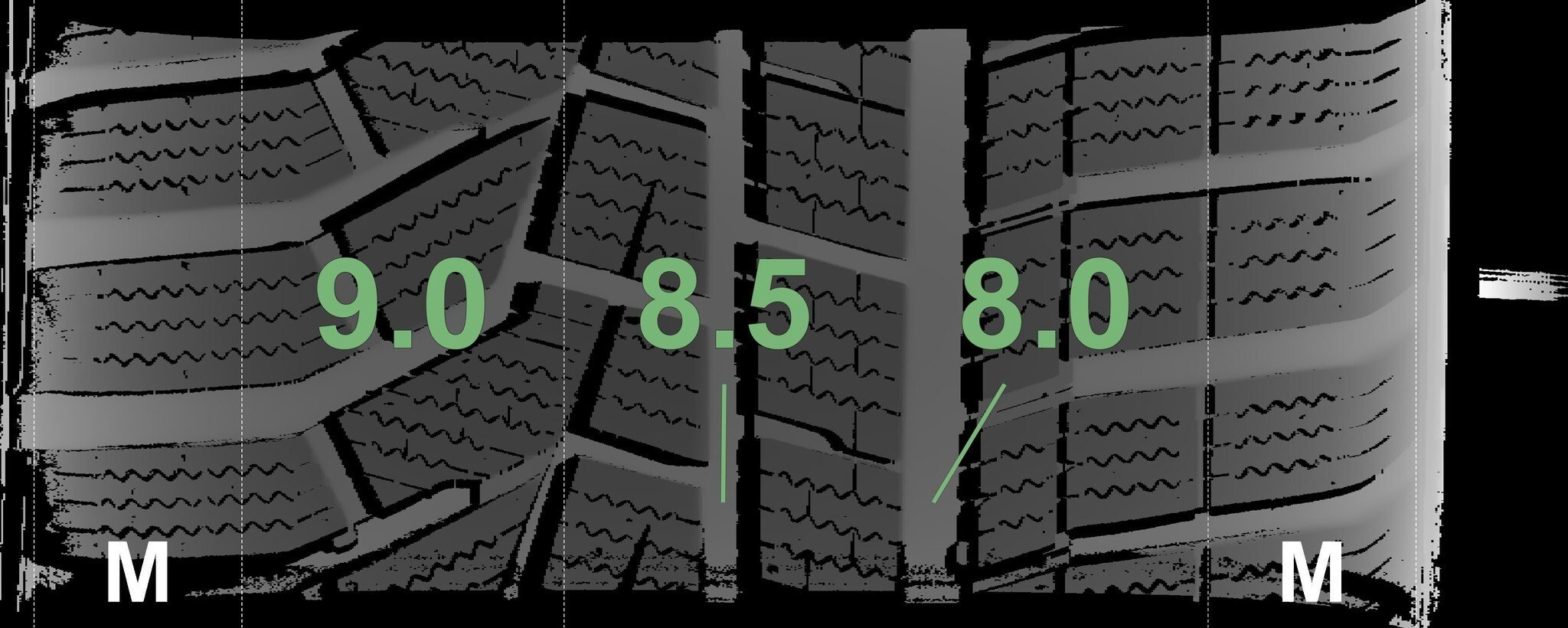 De gemeten profieldieptes en de details van de velgen zijn hierboven weergegeven.