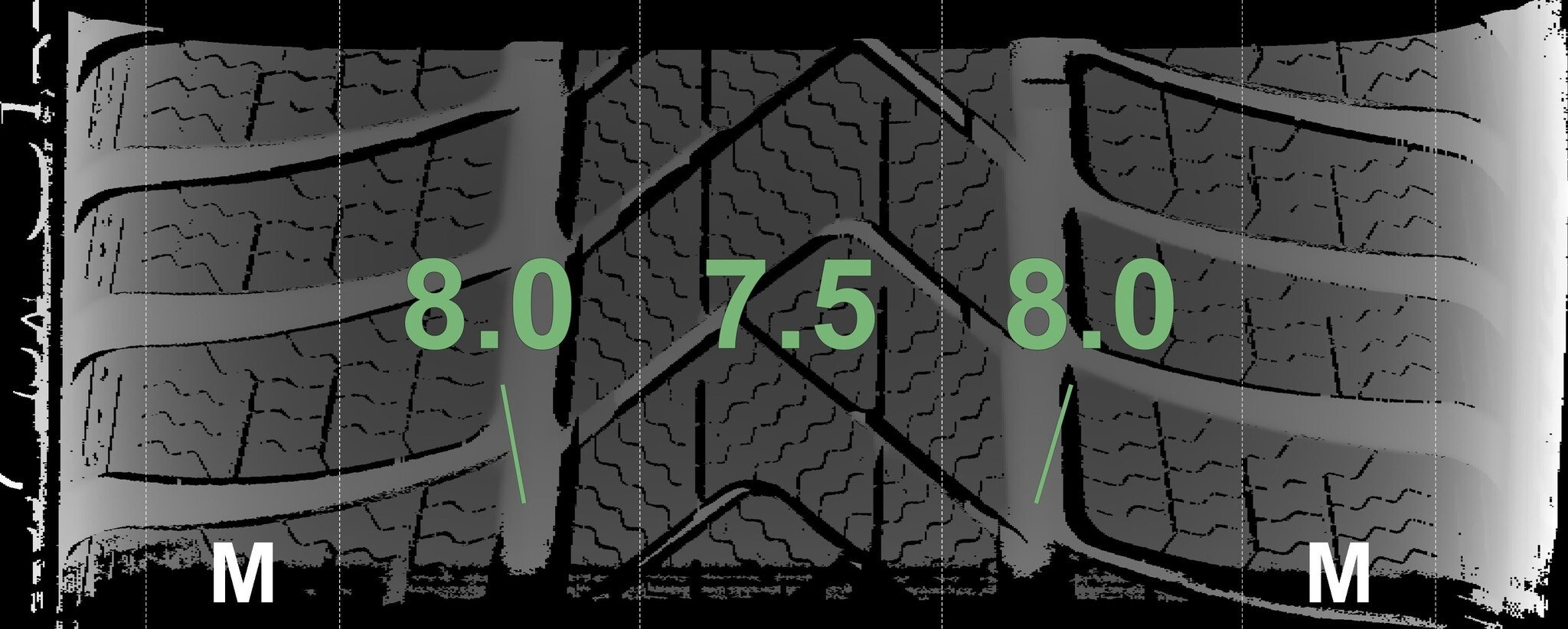 De gemeten profieldieptes en de details van de velgen zijn hierboven weergegeven.
