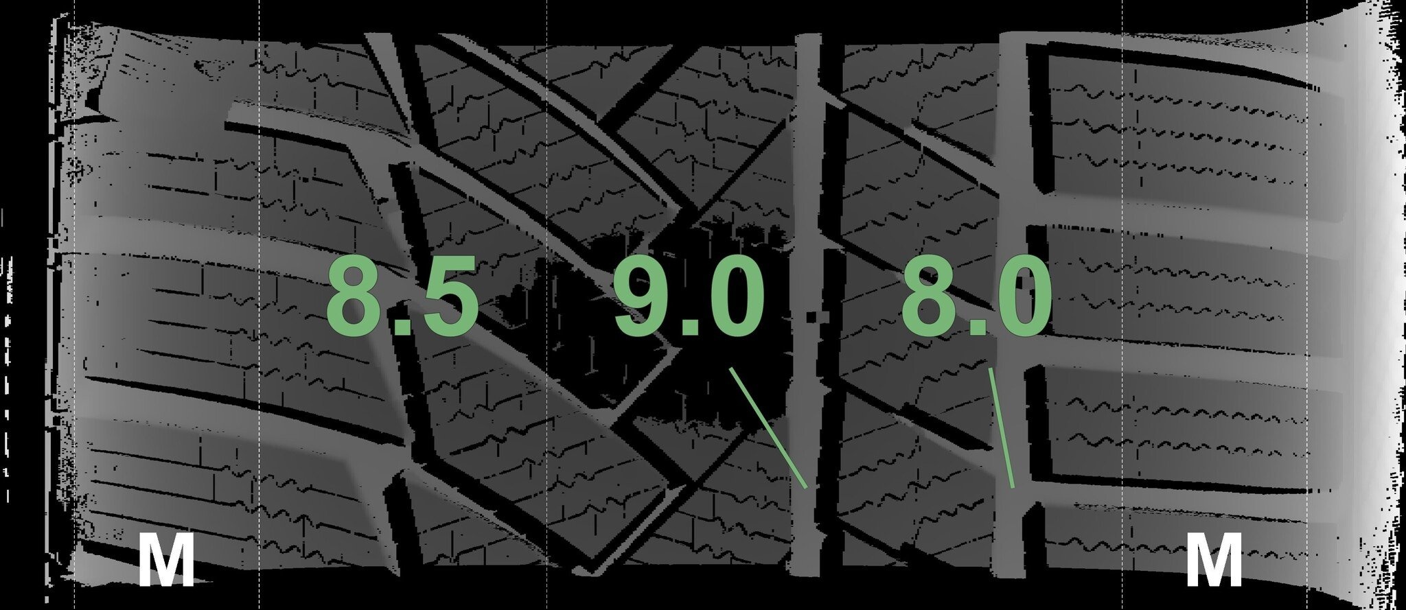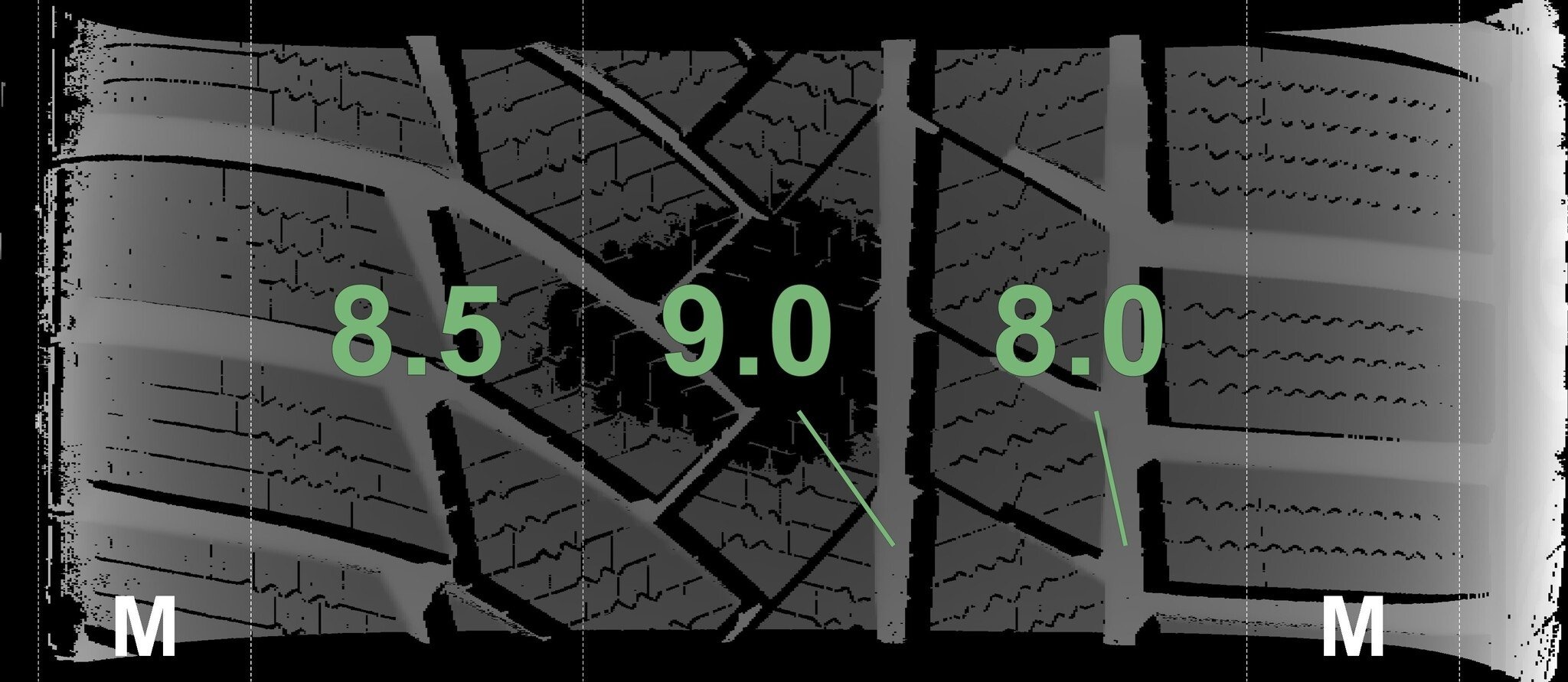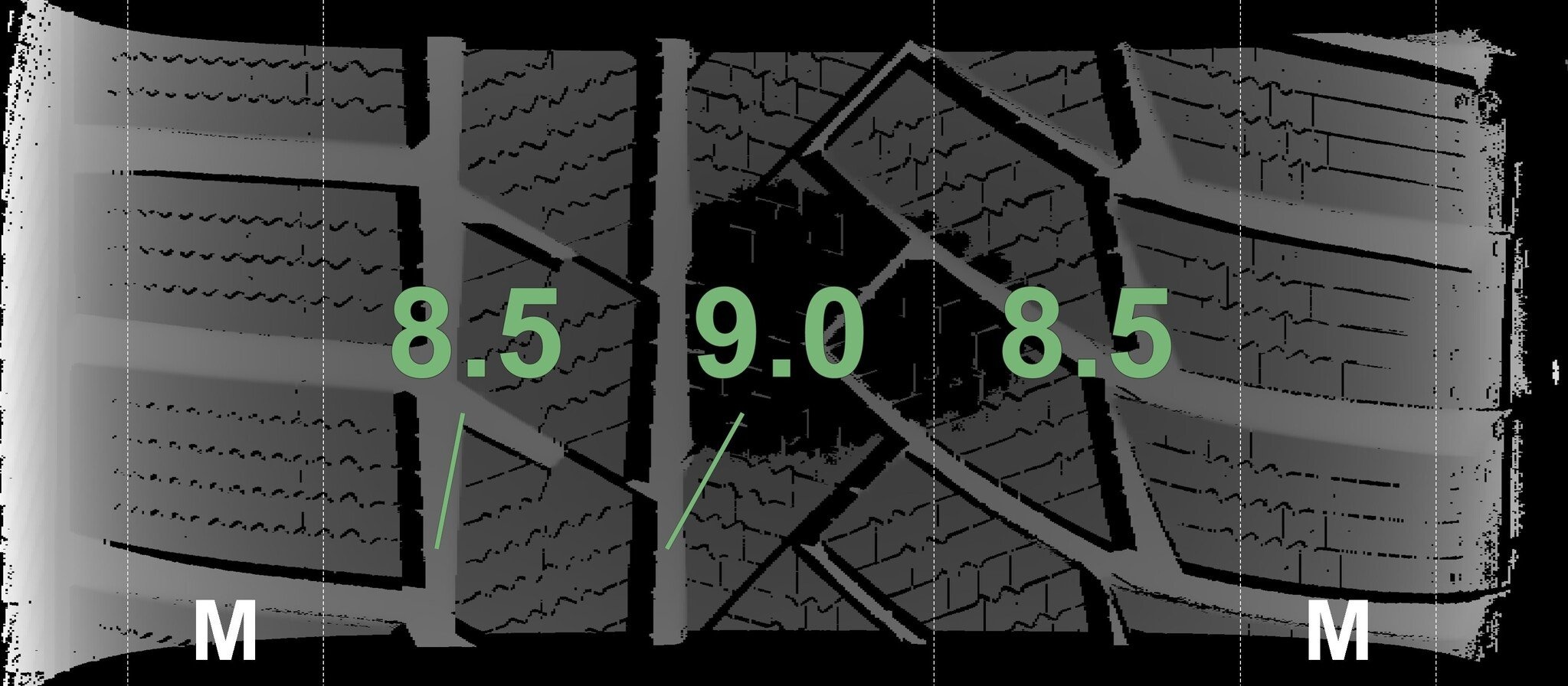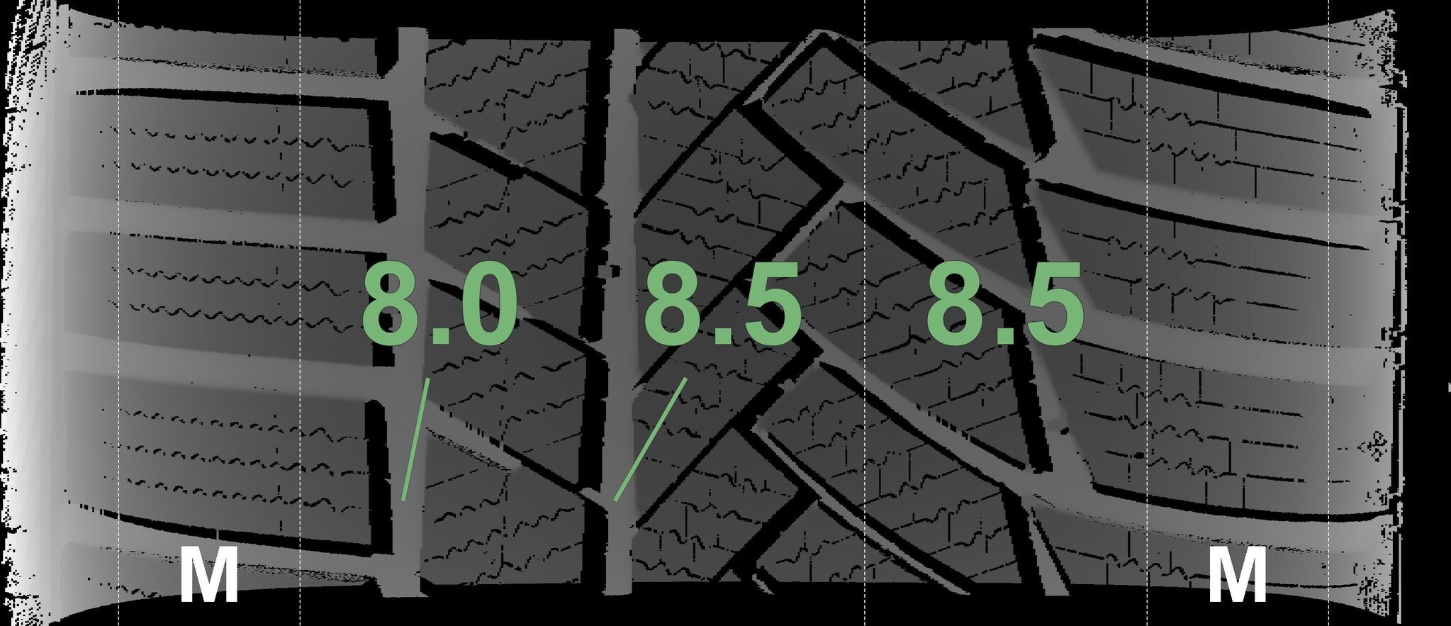 De gemeten profieldieptes en de details van de velgen zijn hierboven weergegeven.