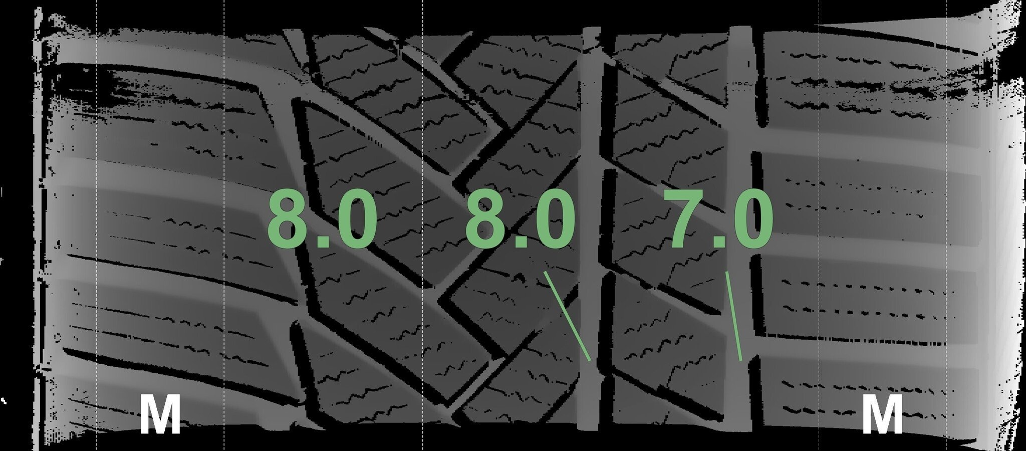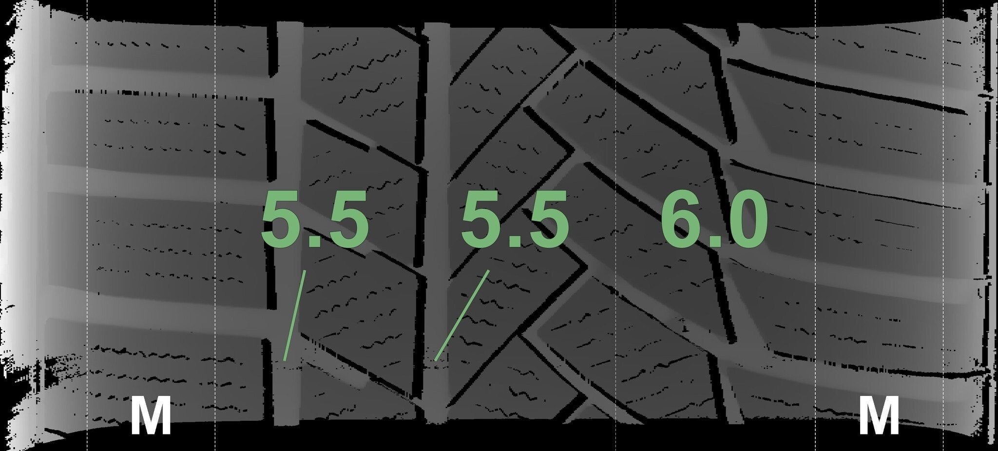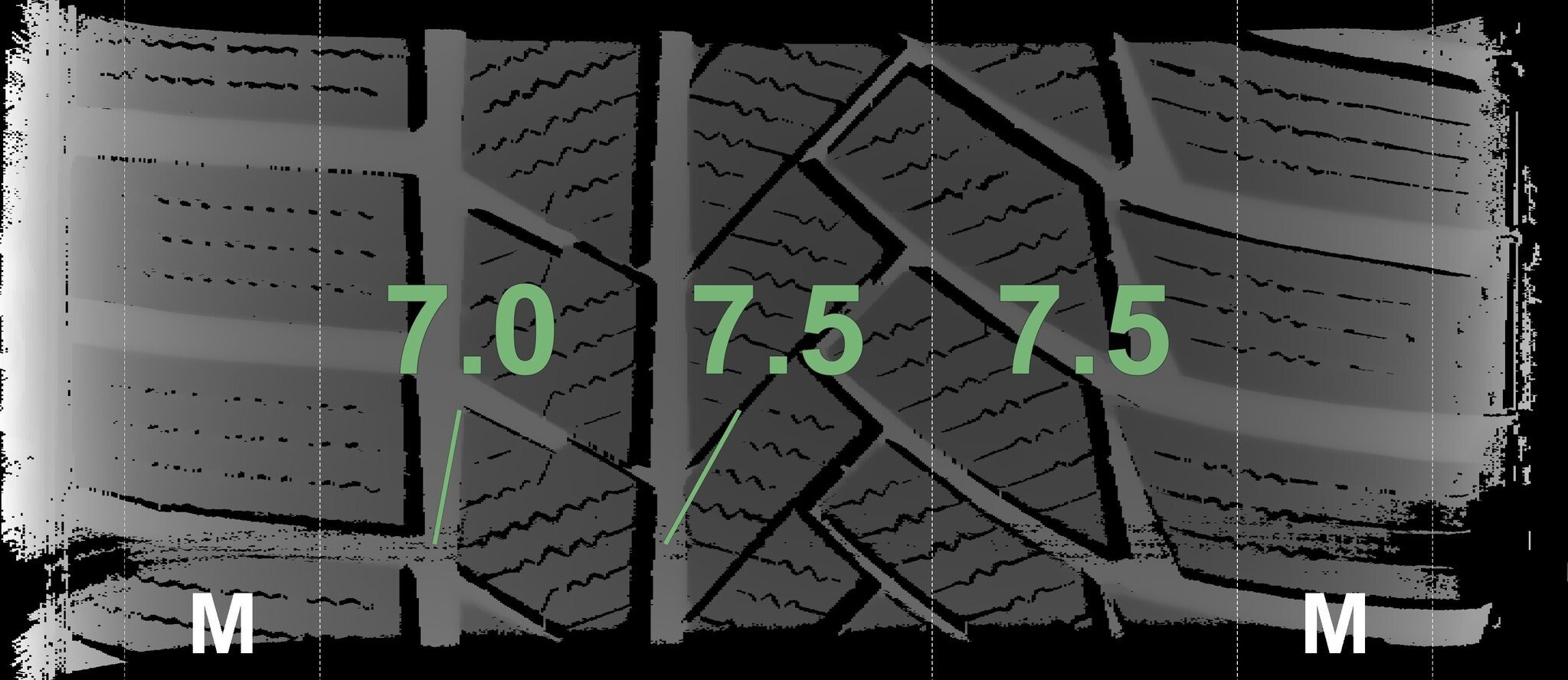 De gemeten profieldieptes en de details van de velgen zijn hierboven weergegeven.