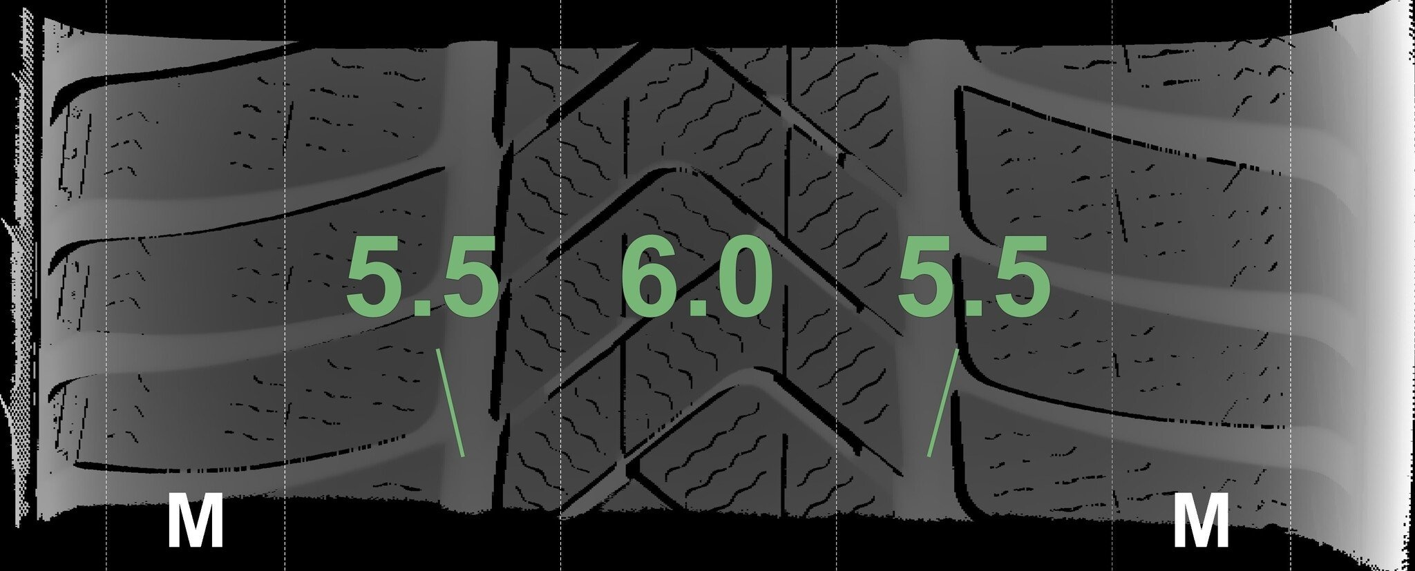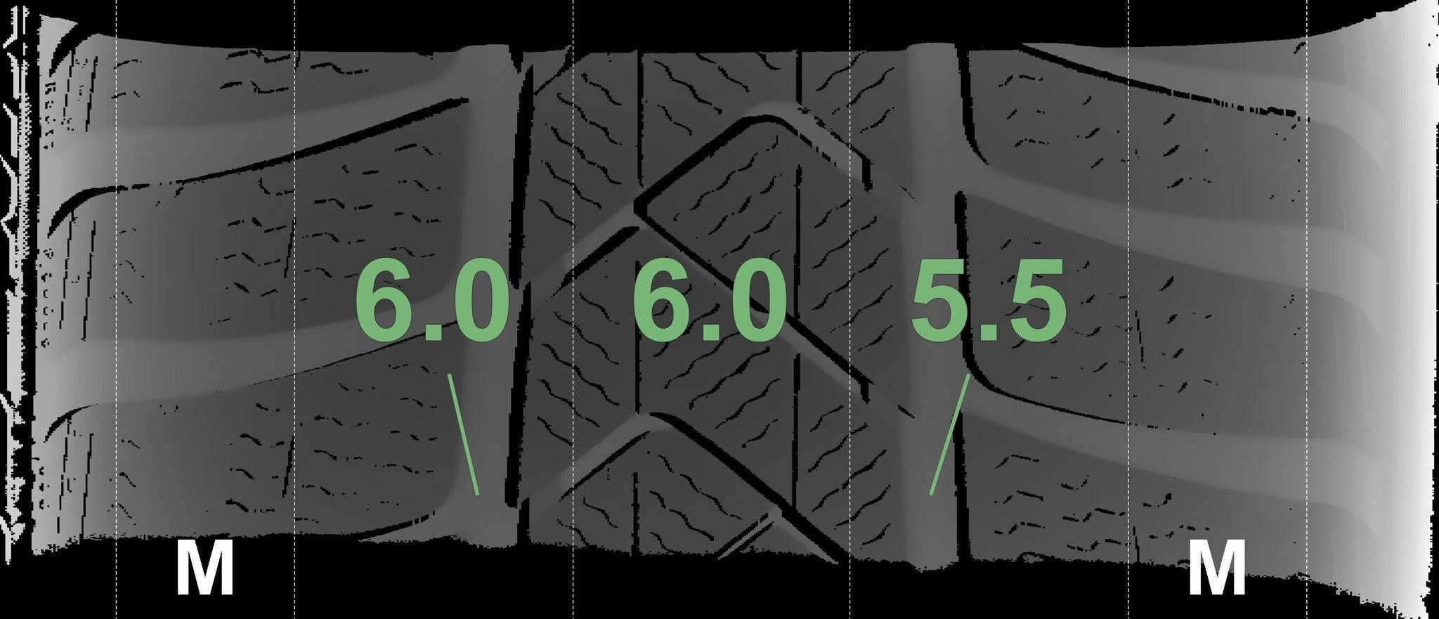 De gemeten profieldieptes en de details van de velgen zijn hierboven weergegeven.
