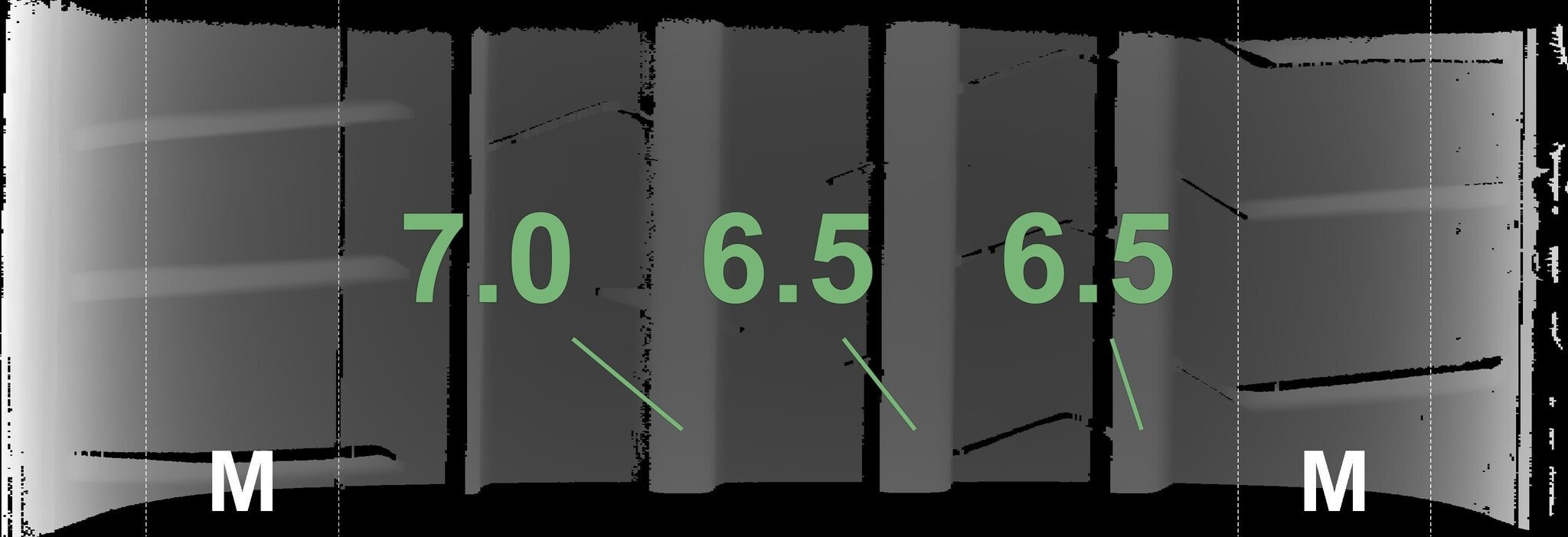 De gemeten profieldieptes en de details van de velgen zijn hierboven weergegeven.