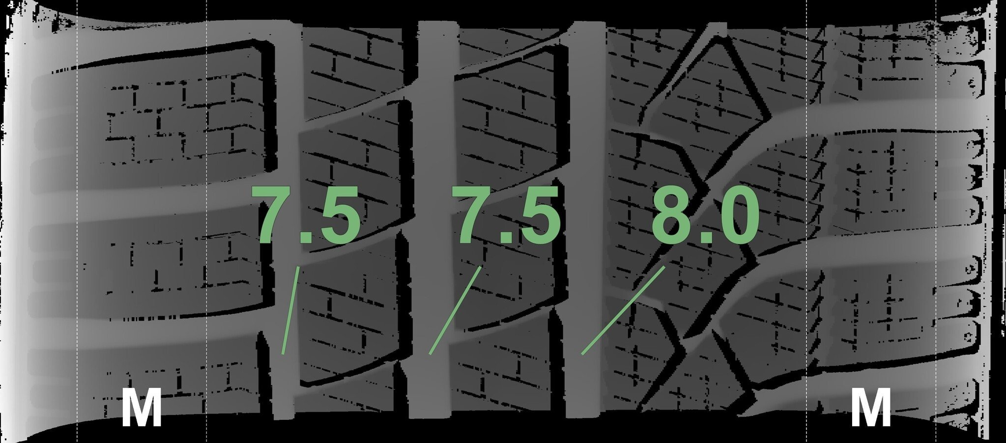 De gemeten profieldieptes en de details van de velgen zijn hierboven weergegeven.