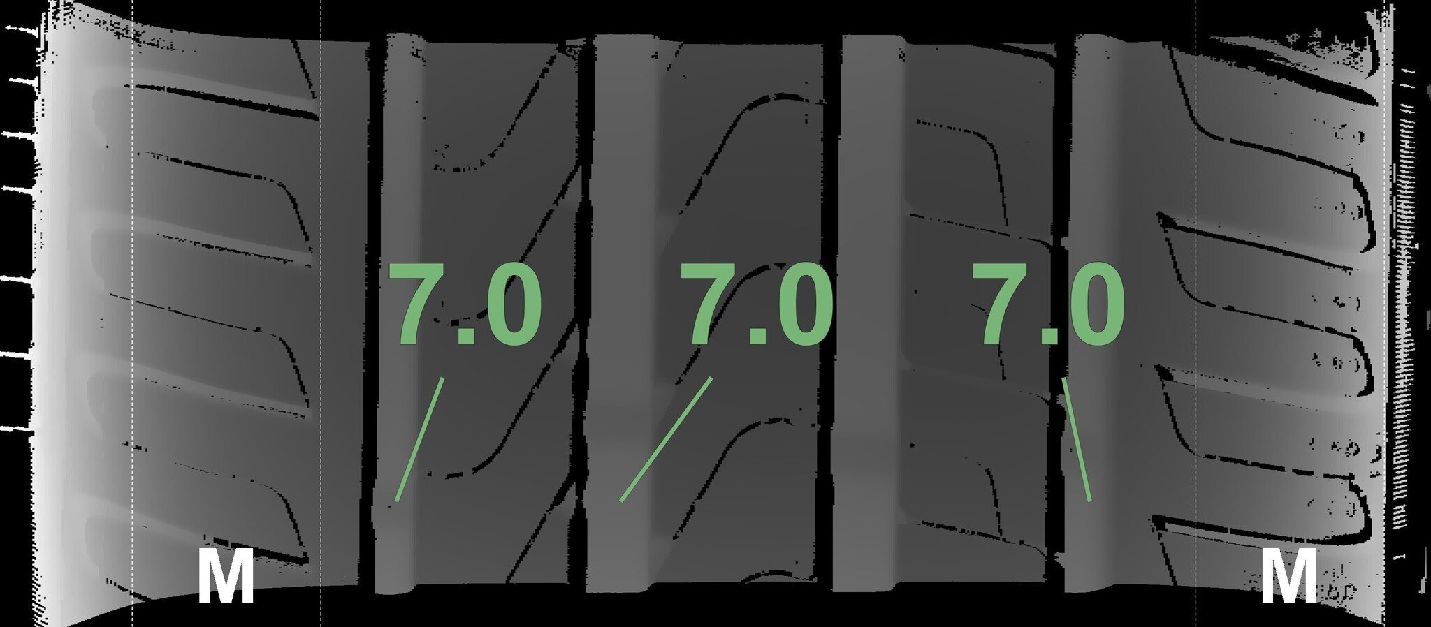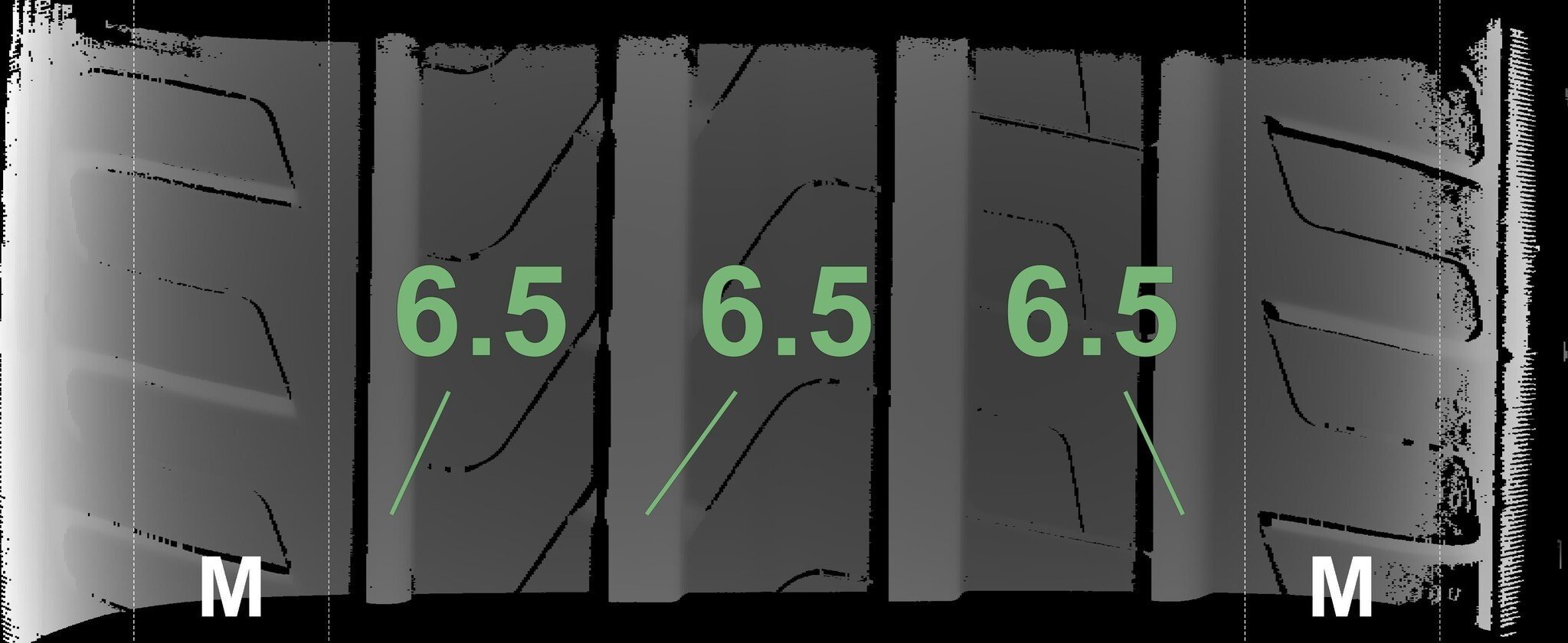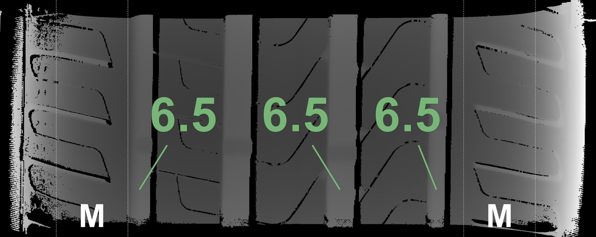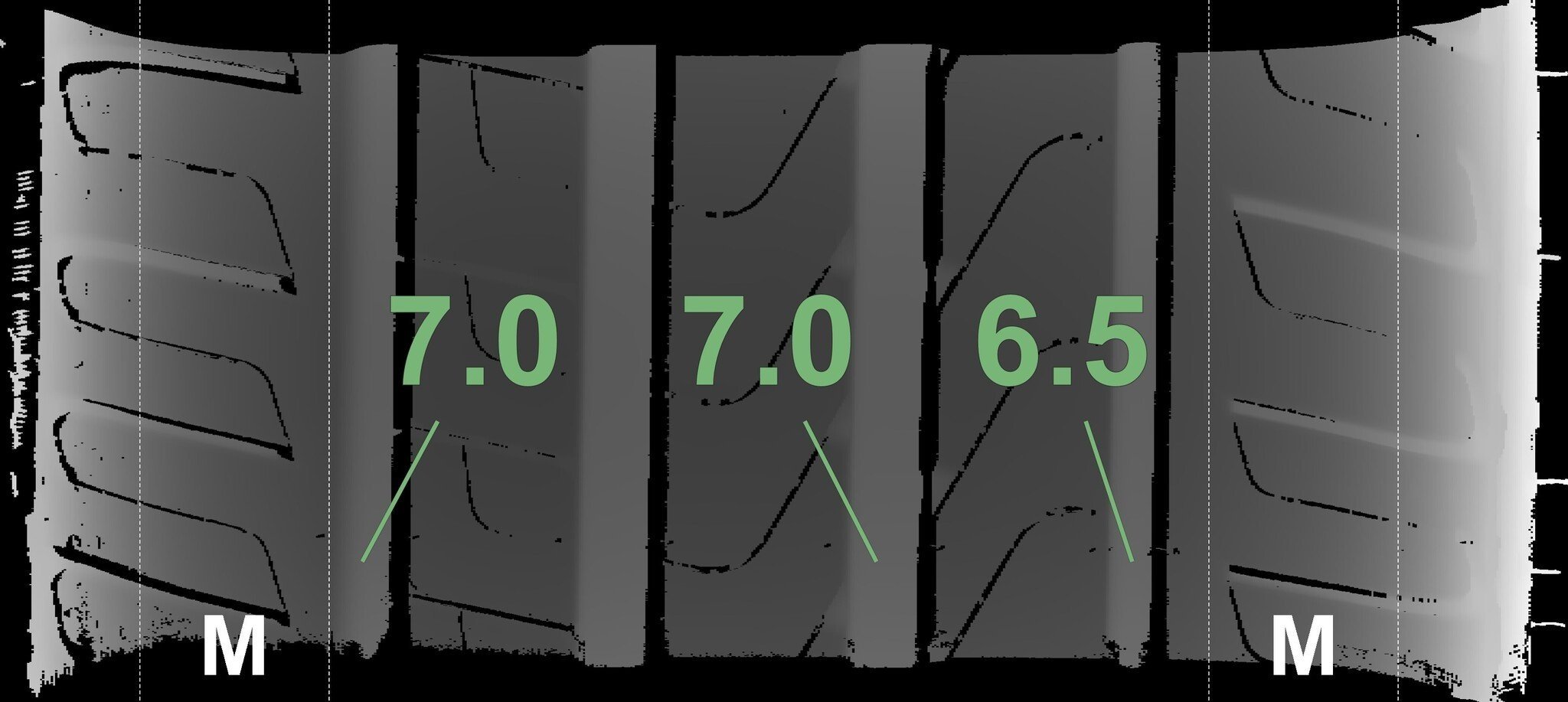 De gemeten profieldieptes en de details van de velgen zijn hierboven weergegeven.