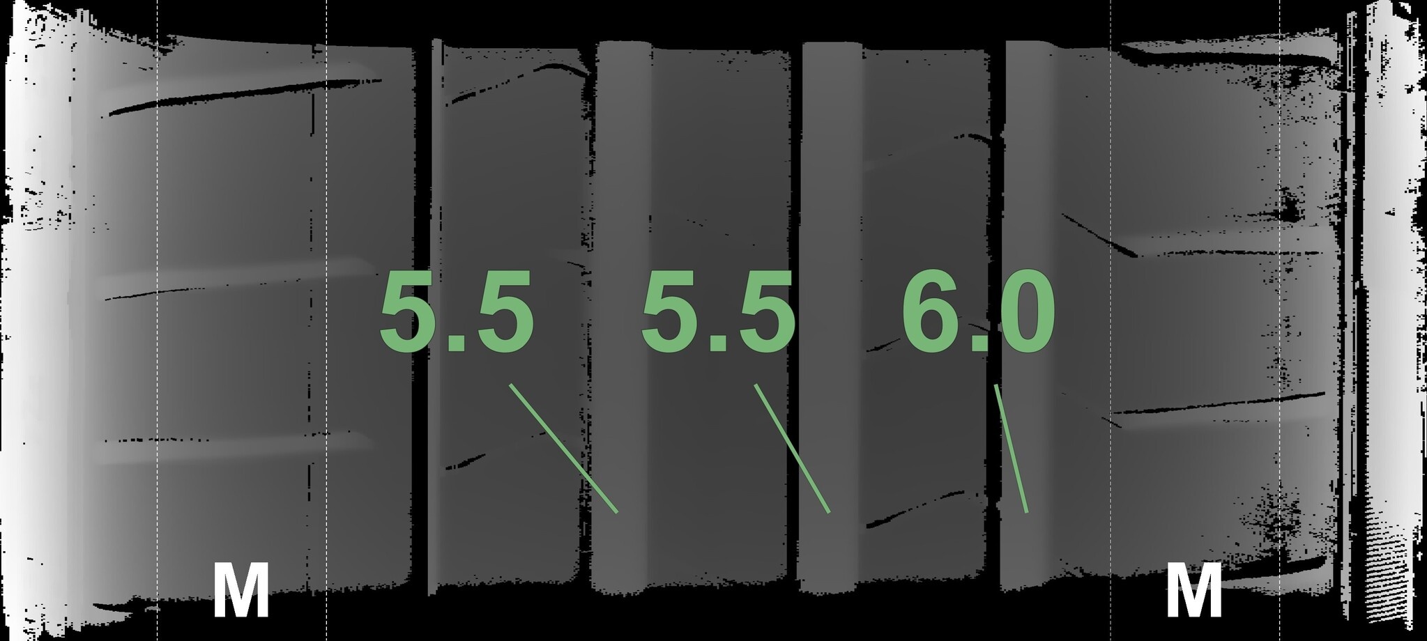 De gemeten profieldieptes en de details van de velgen zijn hierboven weergegeven.