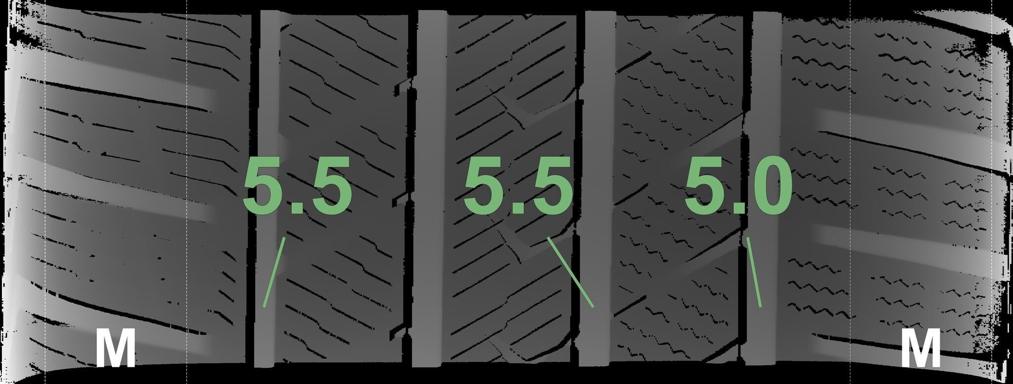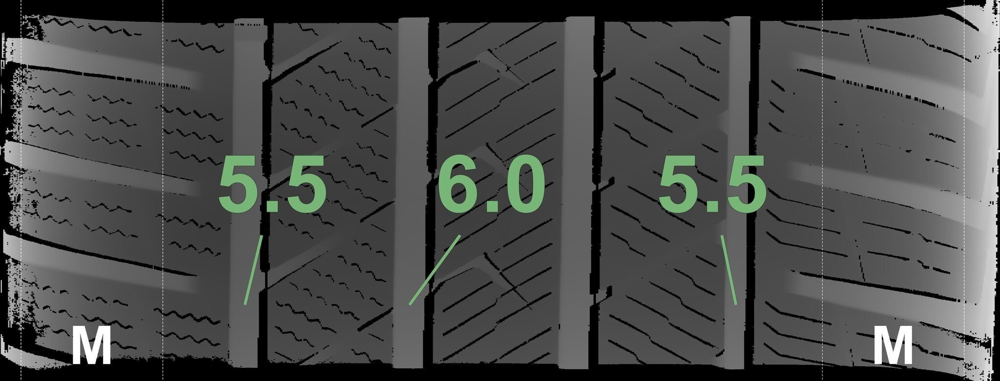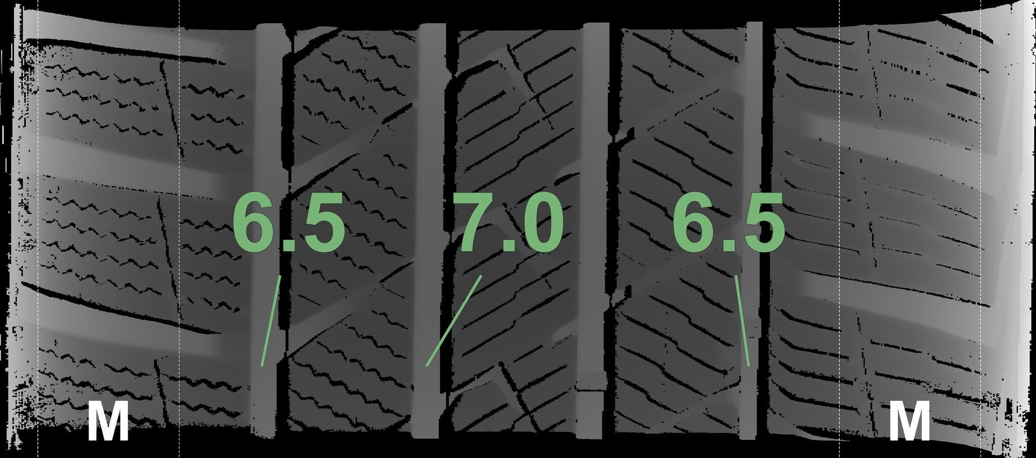 De gemeten profieldieptes en de details van de velgen zijn hierboven weergegeven.