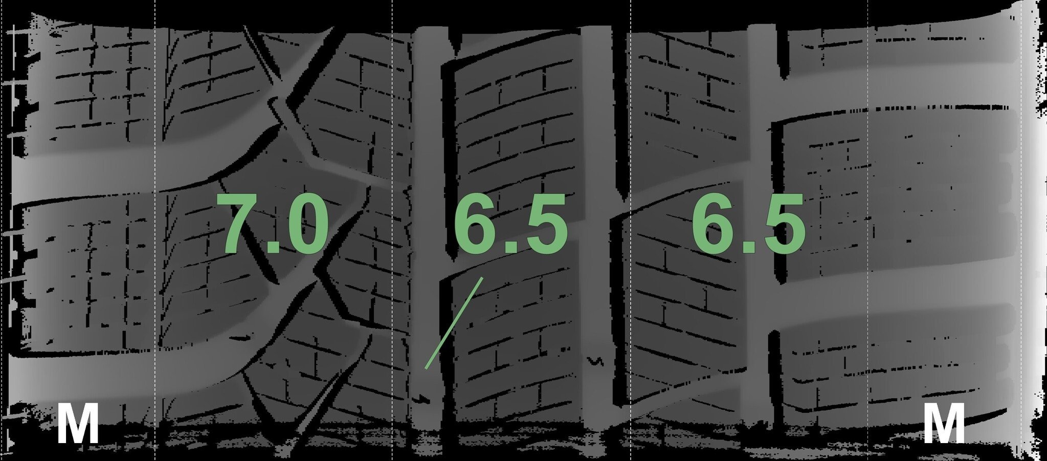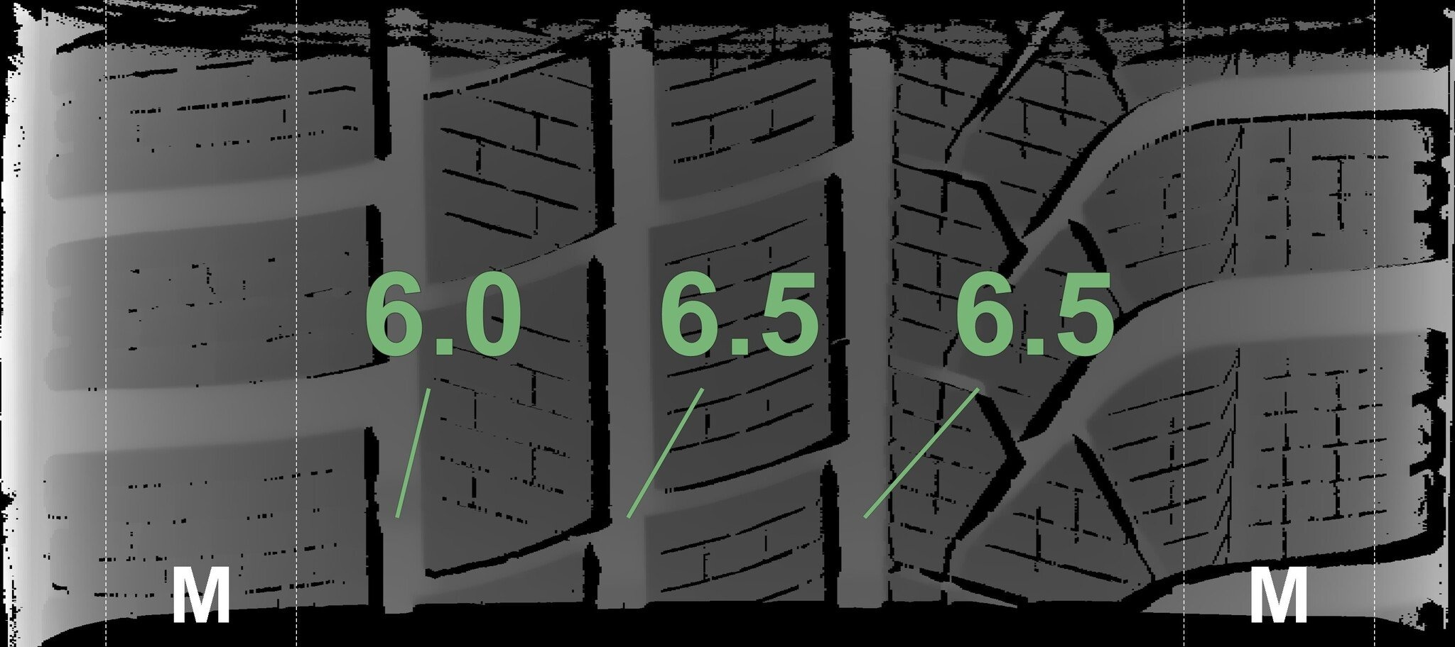 De gemeten profieldieptes en de details van de velgen zijn hierboven weergegeven.
