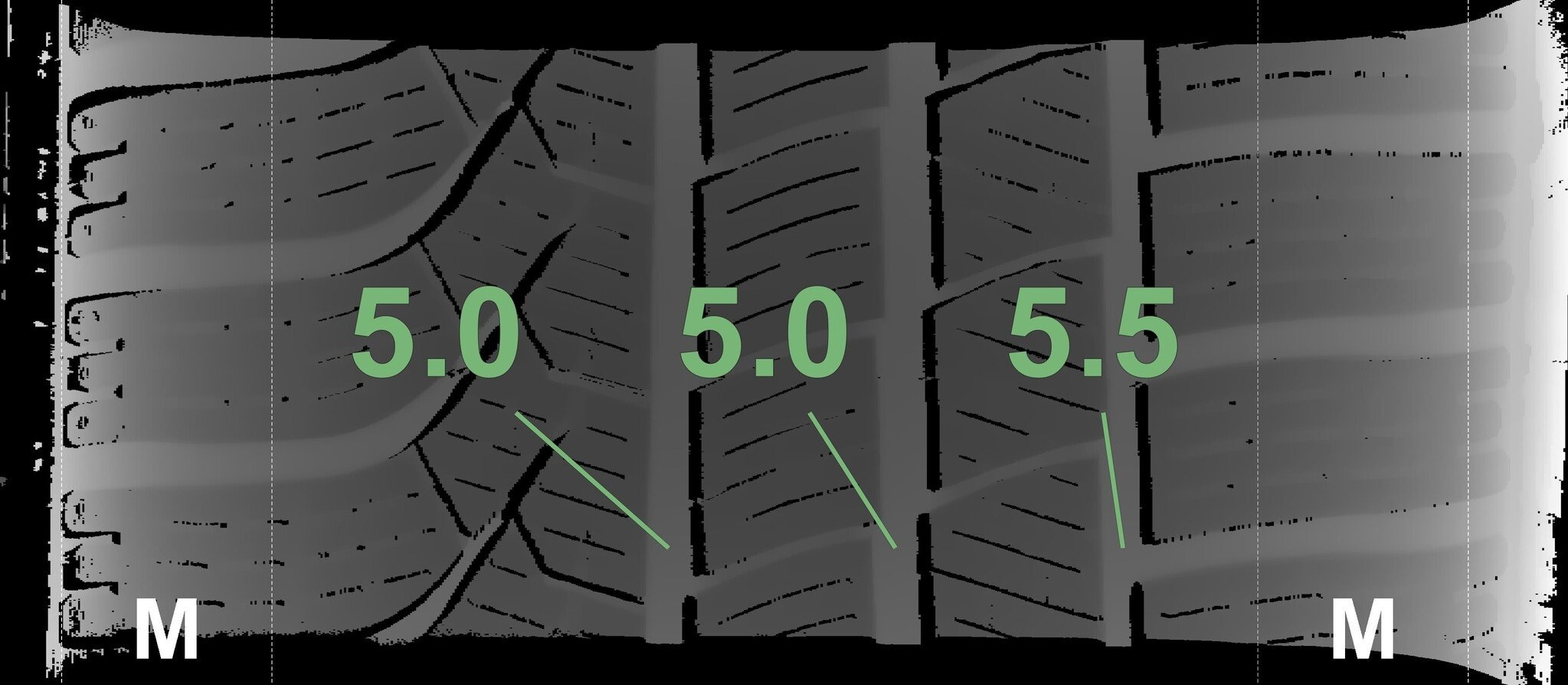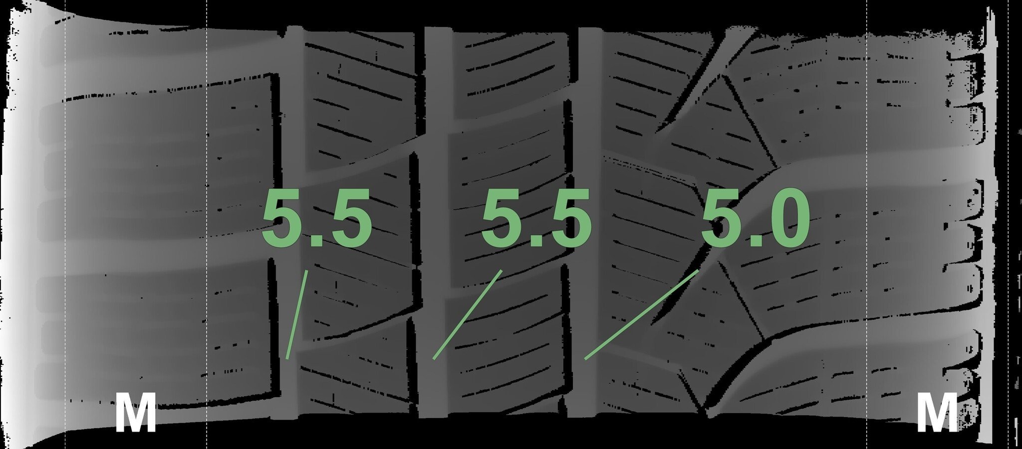 De gemeten profieldieptes en de details van de velgen zijn hierboven weergegeven.