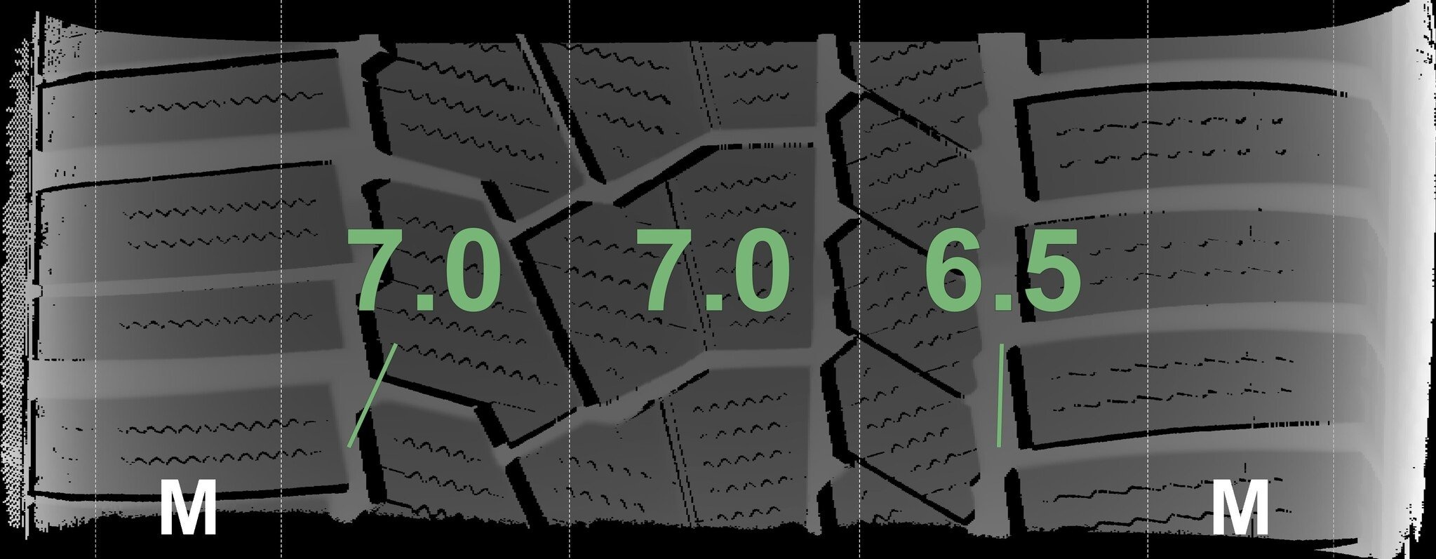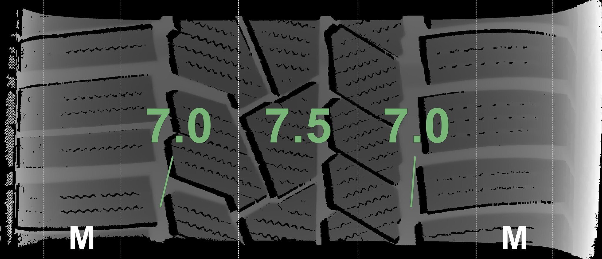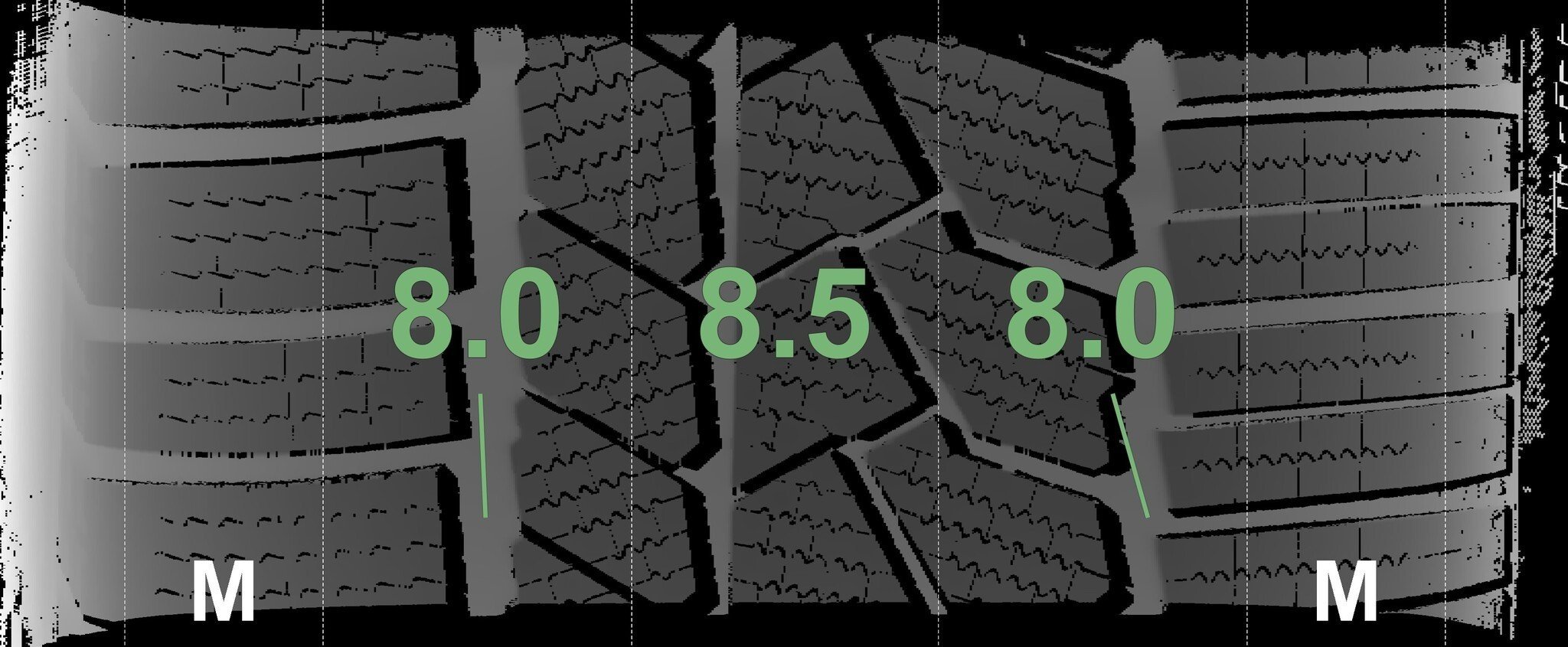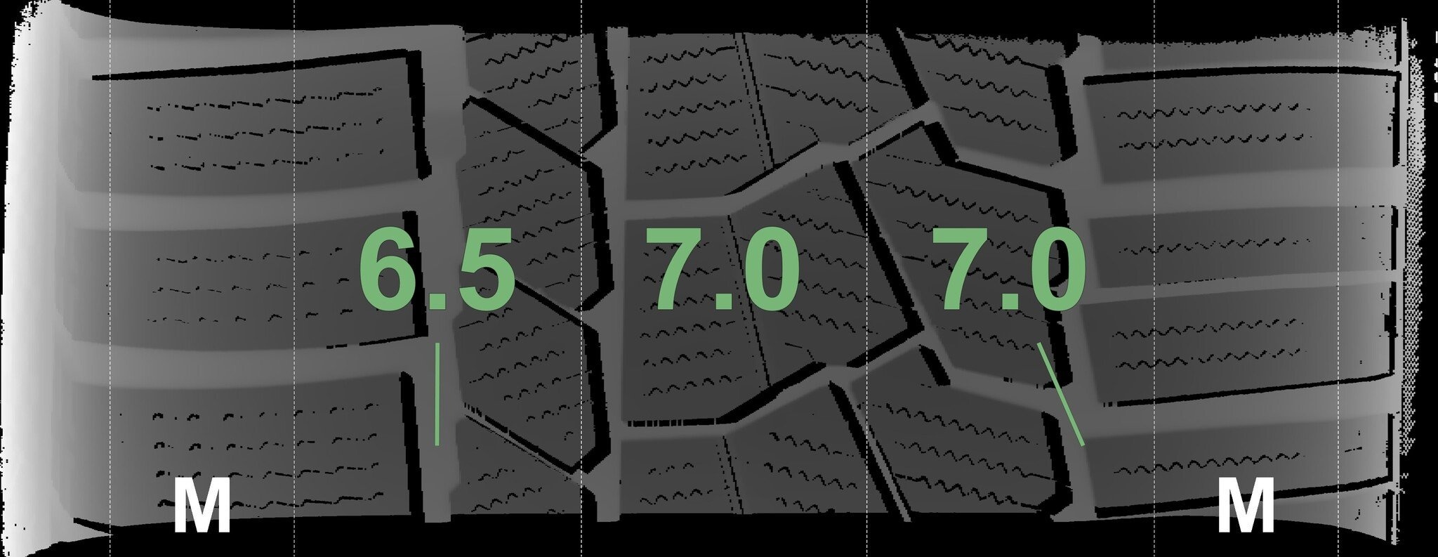 De gemeten profieldieptes en de details van de velgen zijn hierboven weergegeven.