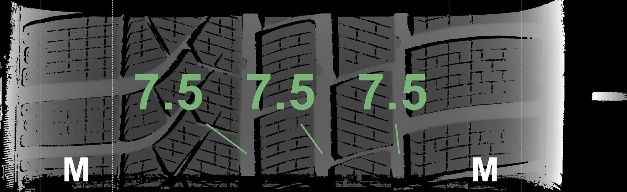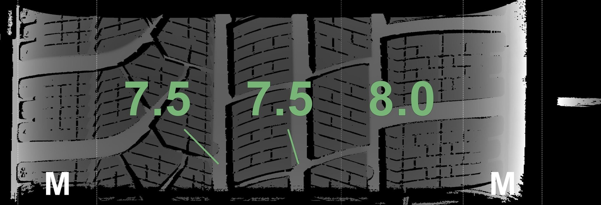 De gemeten profieldieptes en de details van de velgen zijn hierboven weergegeven.