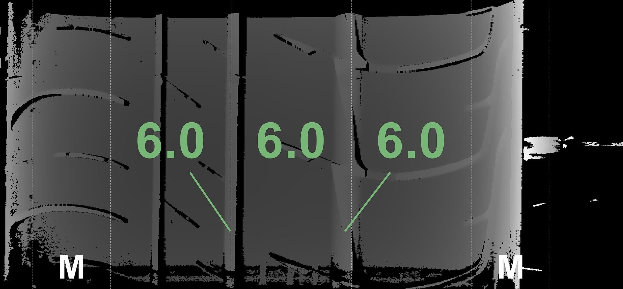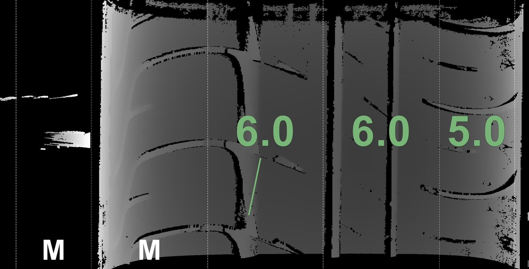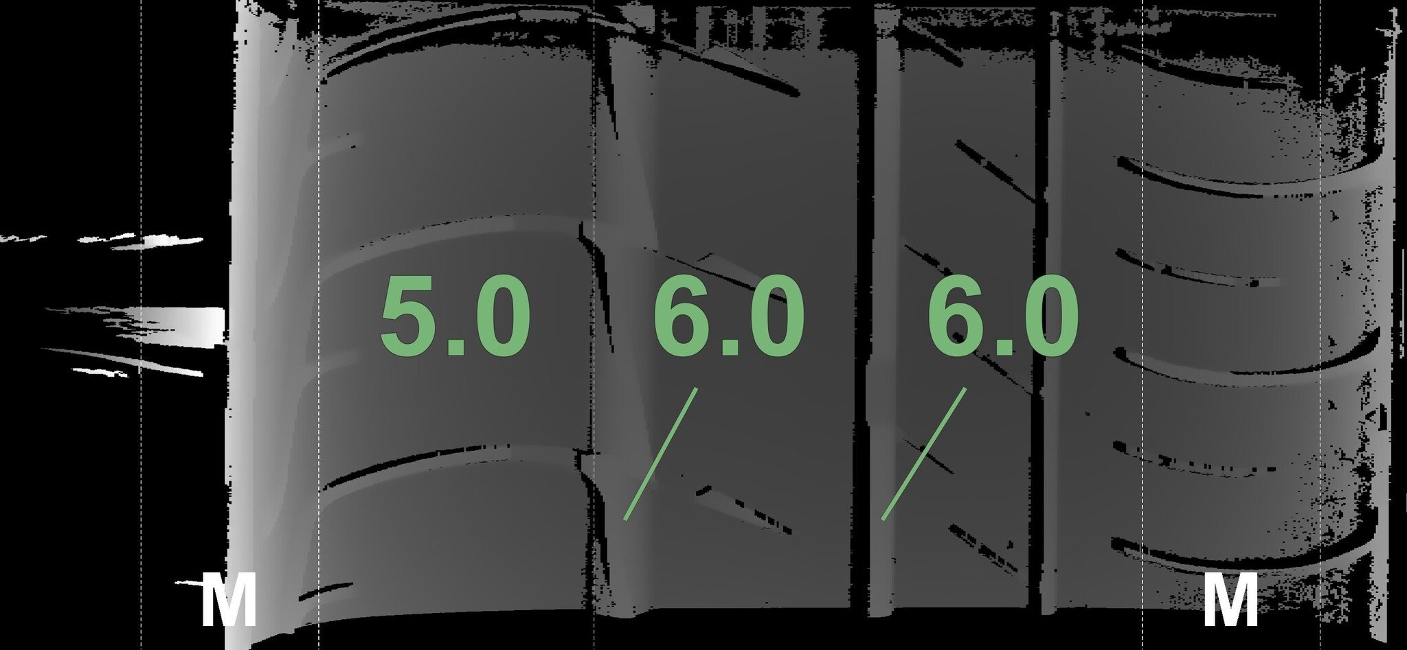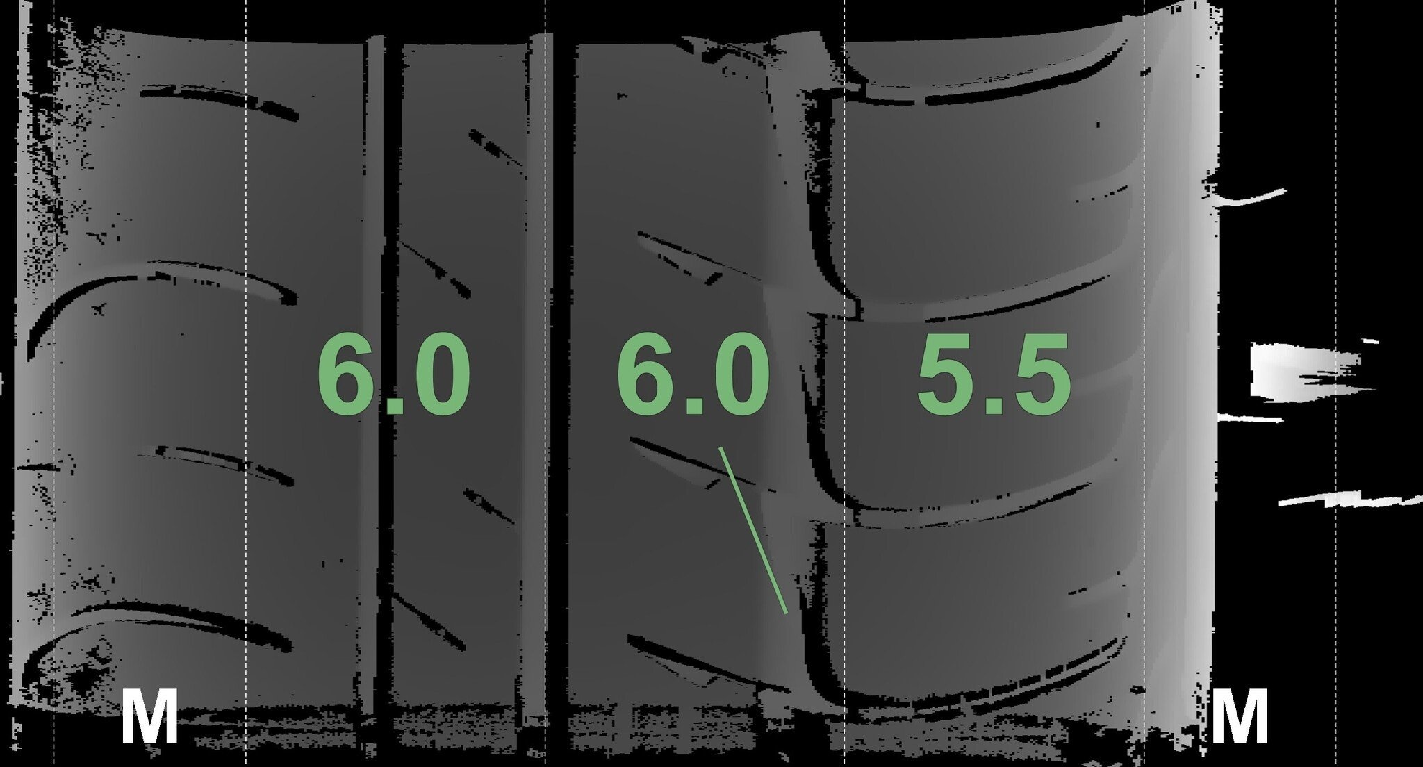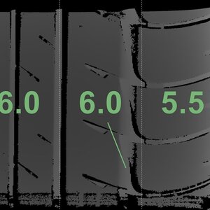 De gemeten profieldieptes en de details van de velgen zijn hierboven weergegeven.