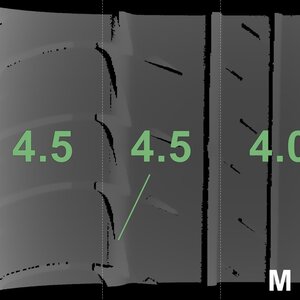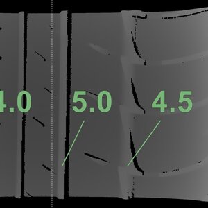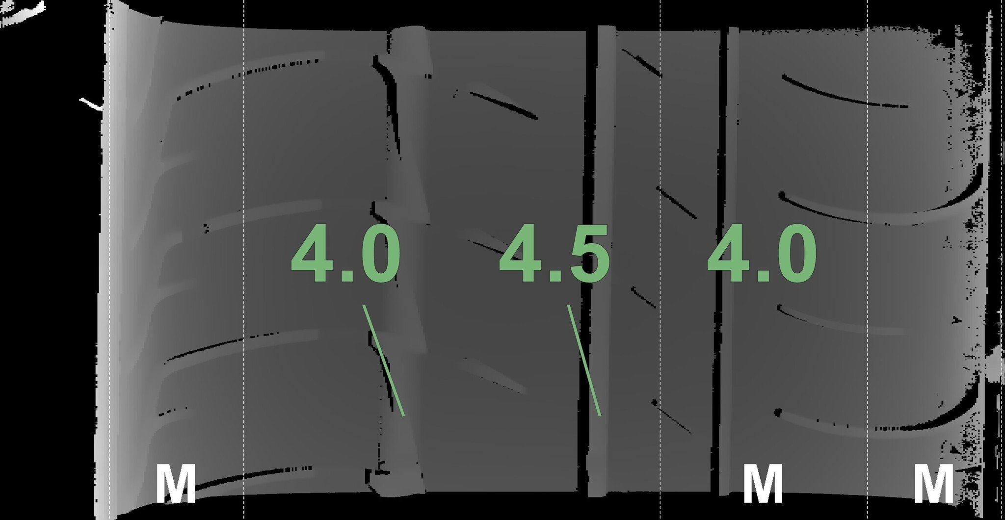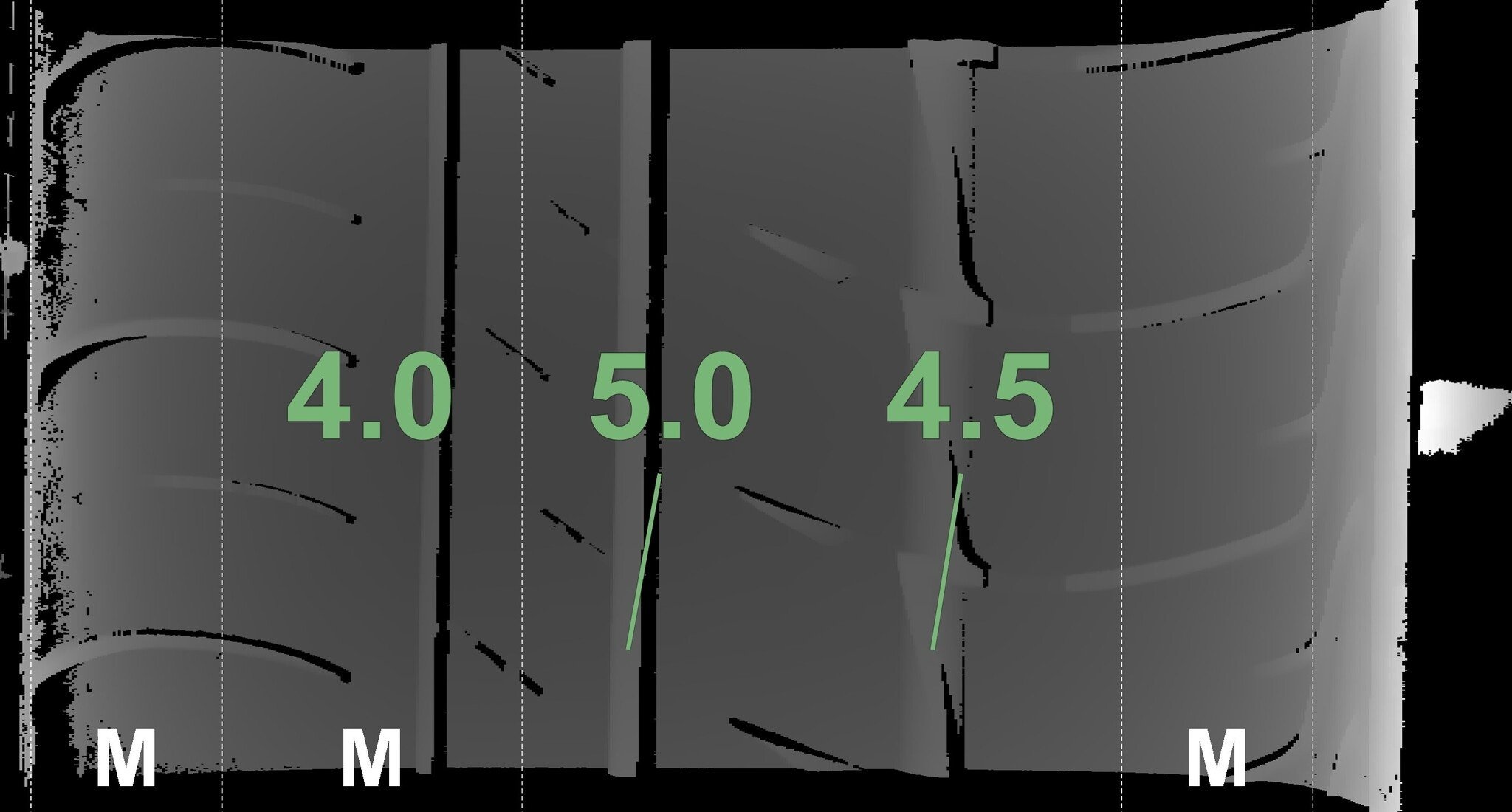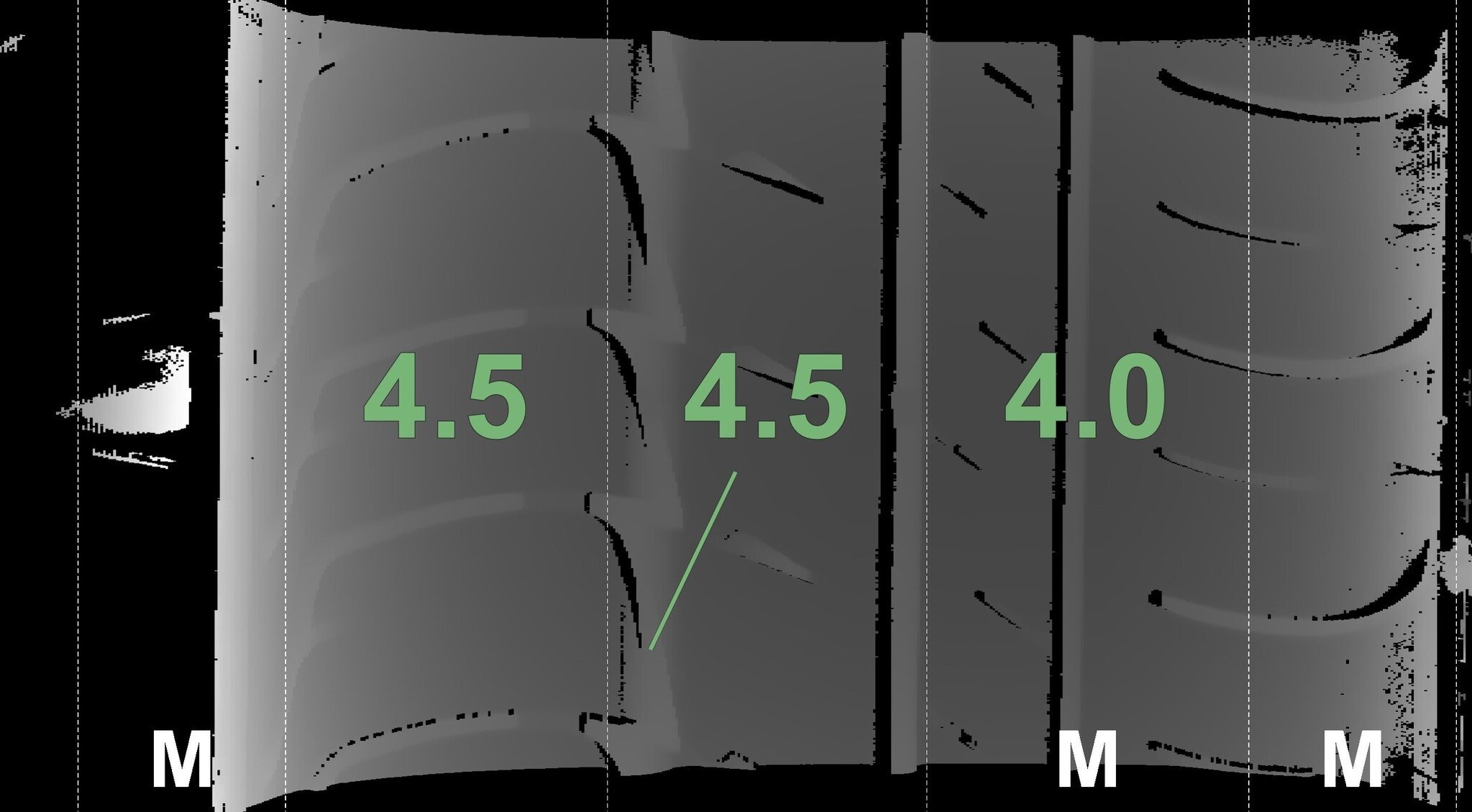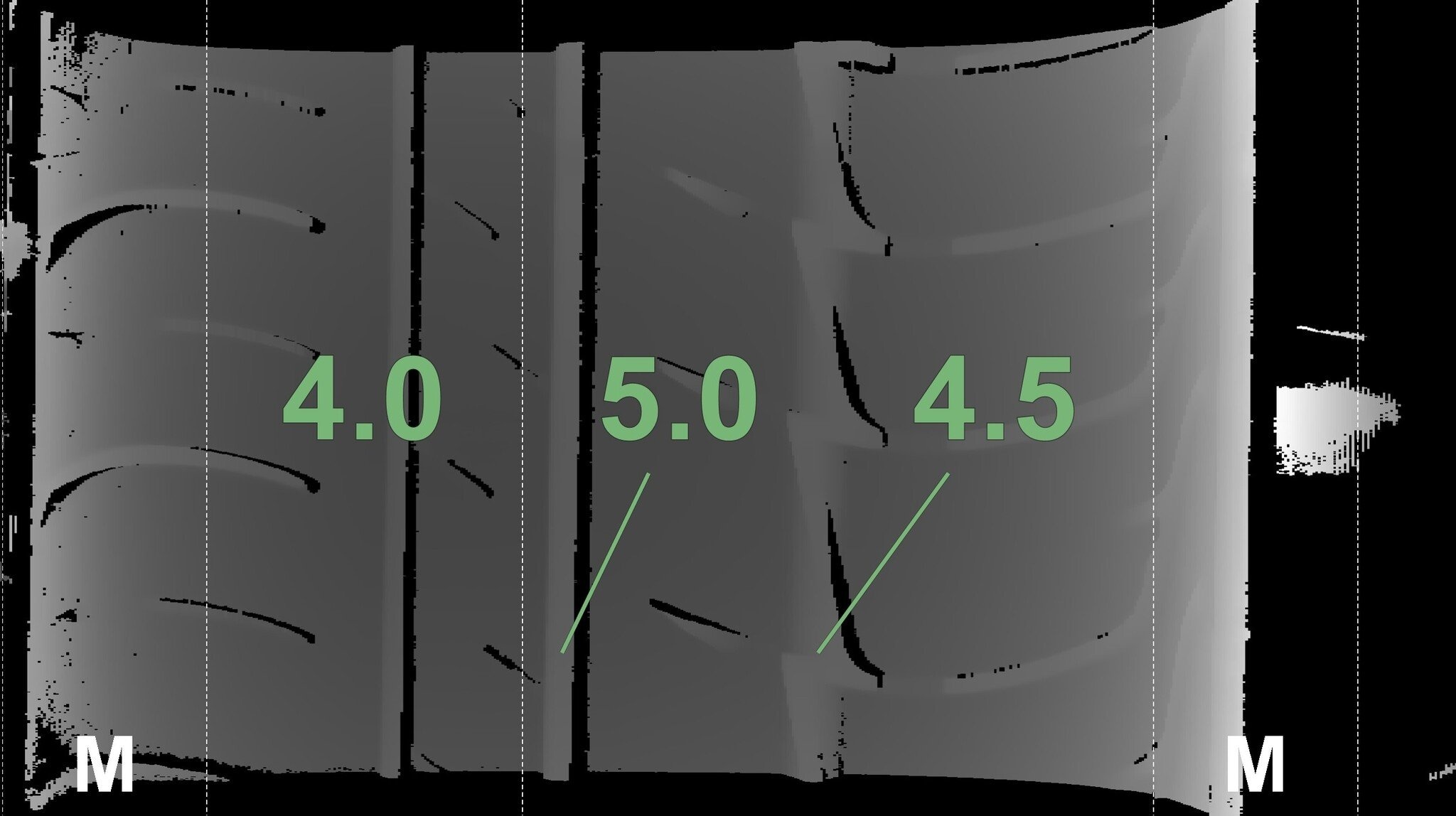 De gemeten profieldieptes en de details van de velgen zijn hierboven weergegeven.