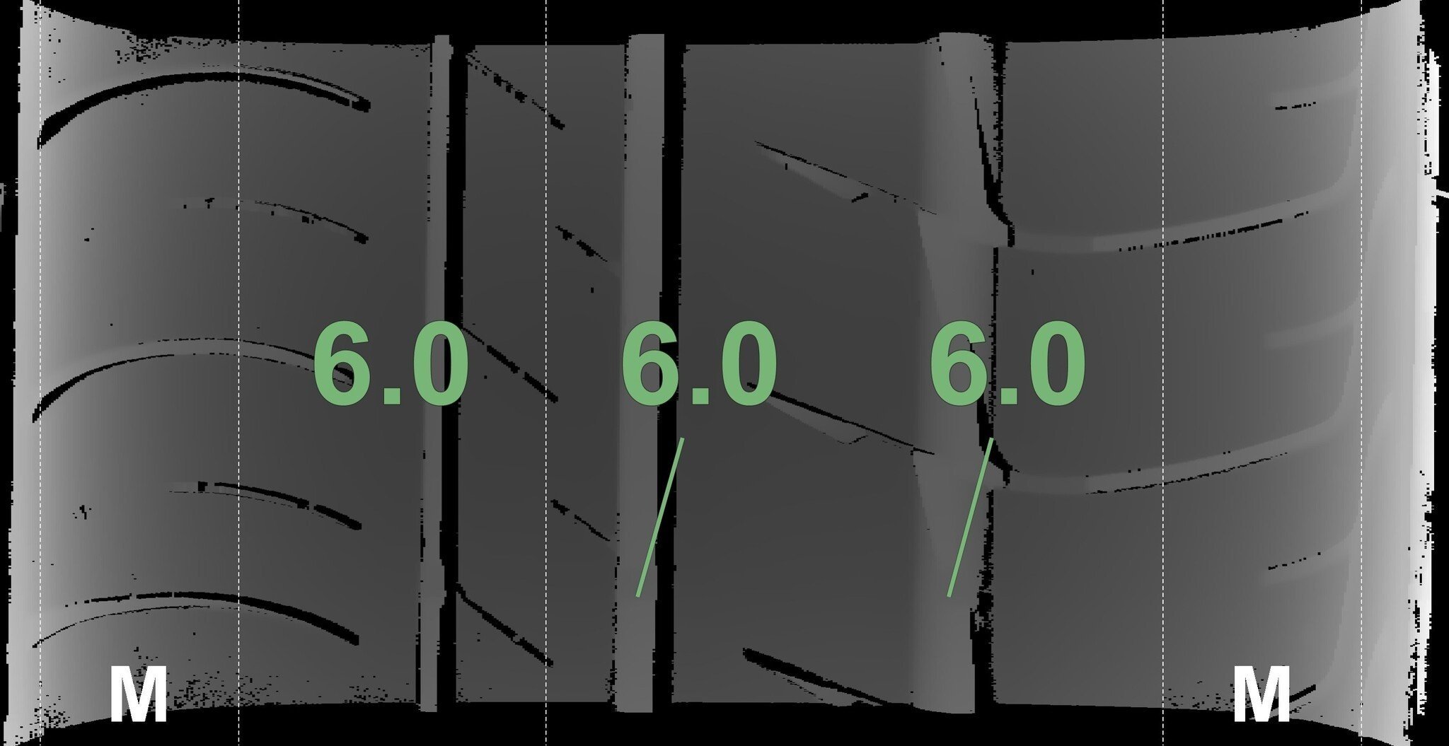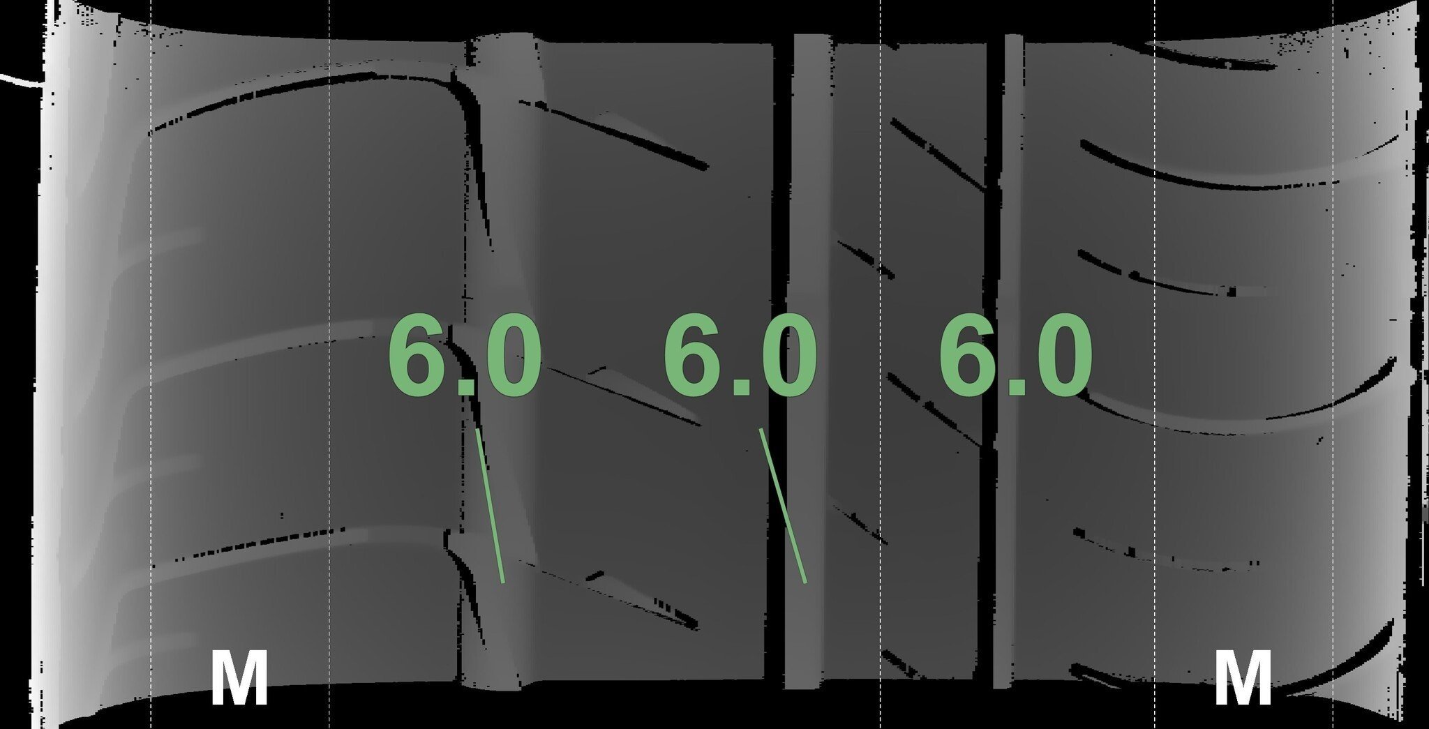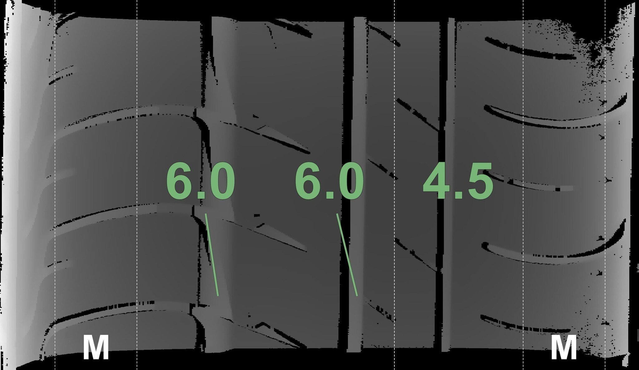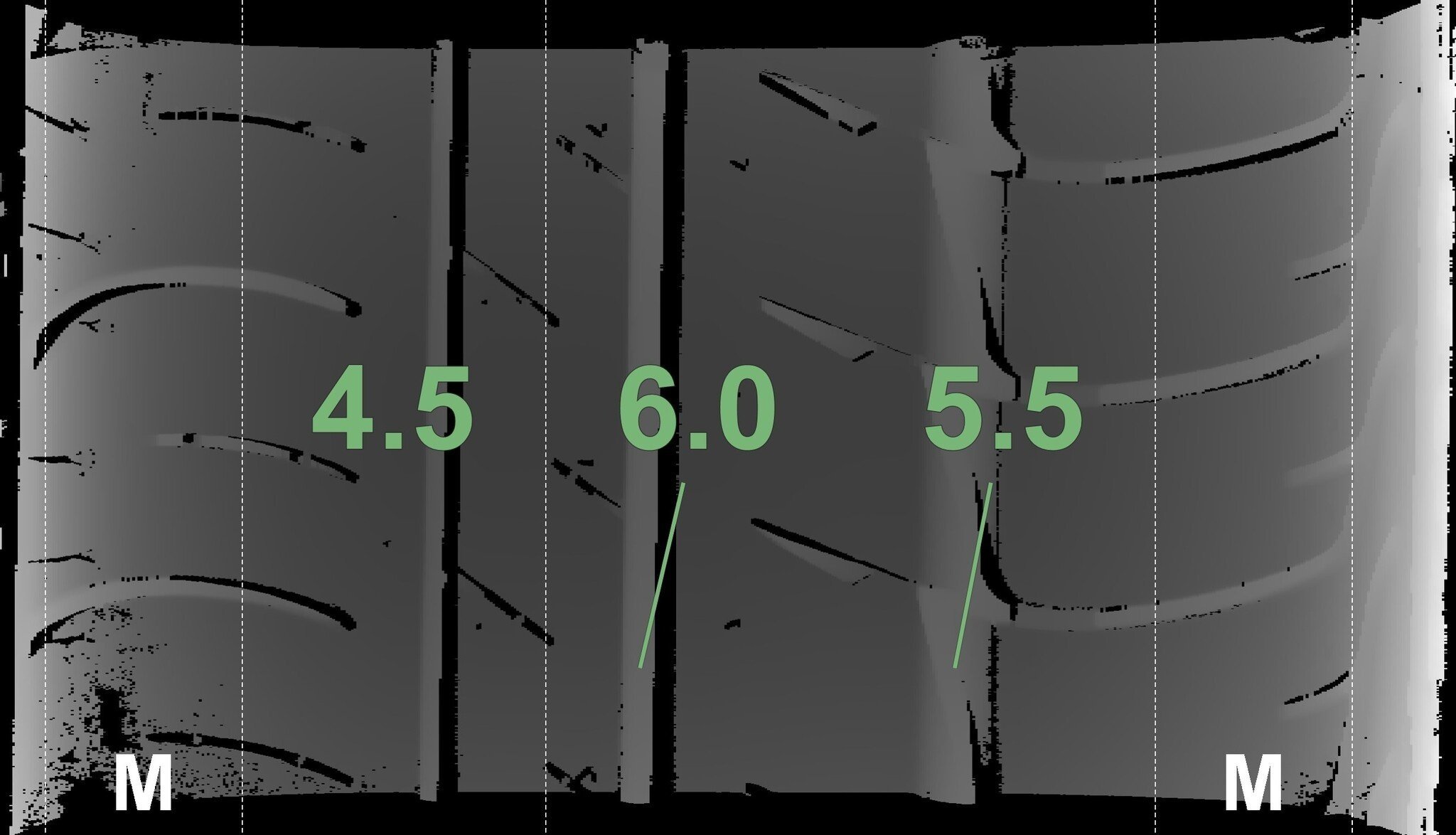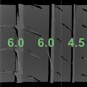 De gemeten profieldieptes en de details van de velgen zijn hierboven weergegeven.