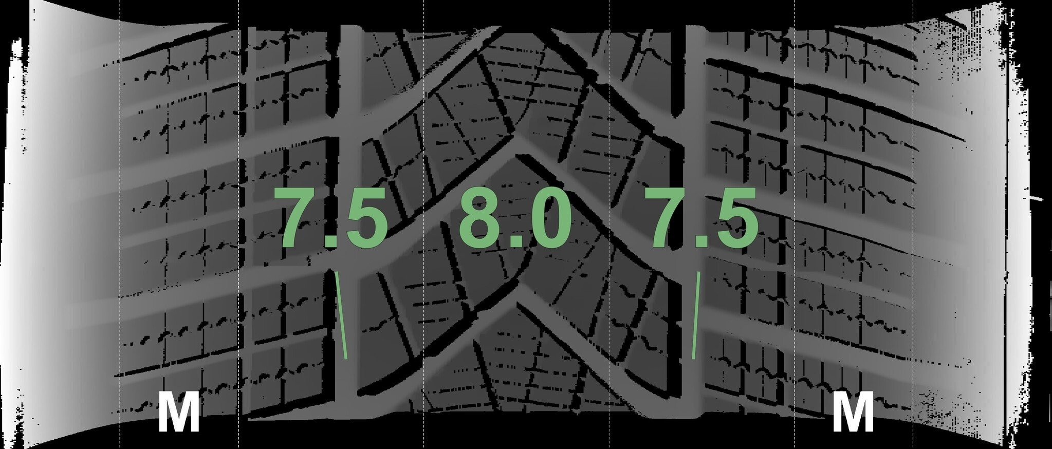 De gemeten profieldieptes en de details van de velgen zijn hierboven weergegeven.