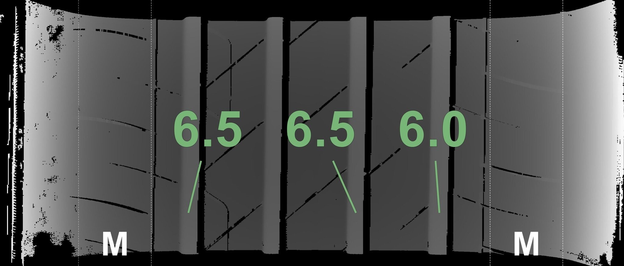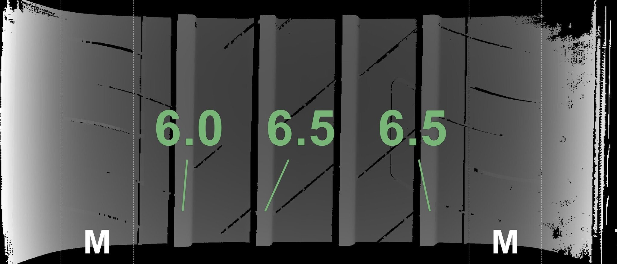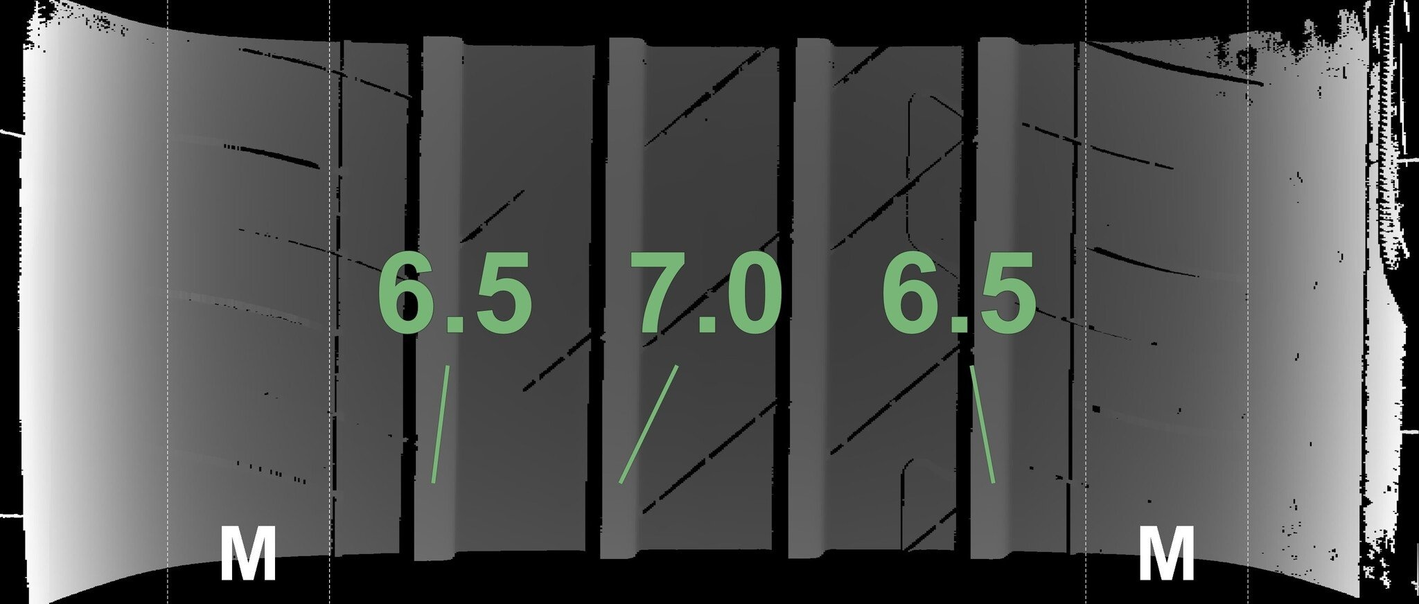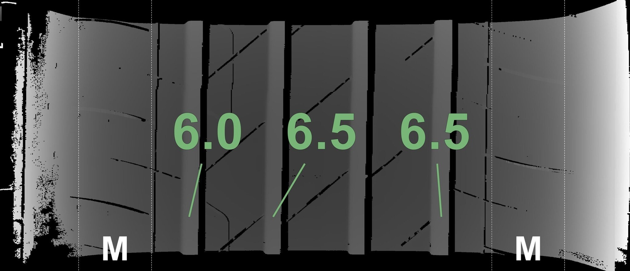 De gemeten profieldieptes en de details van de velgen zijn hierboven weergegeven.
