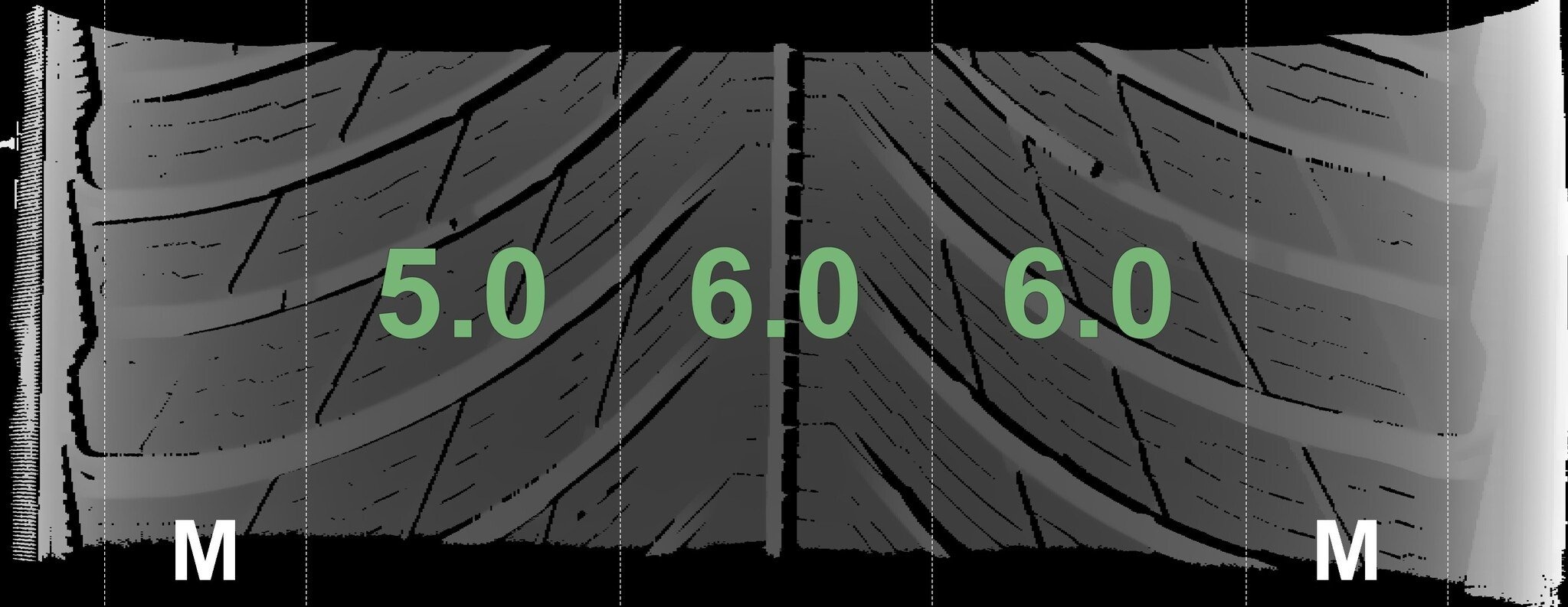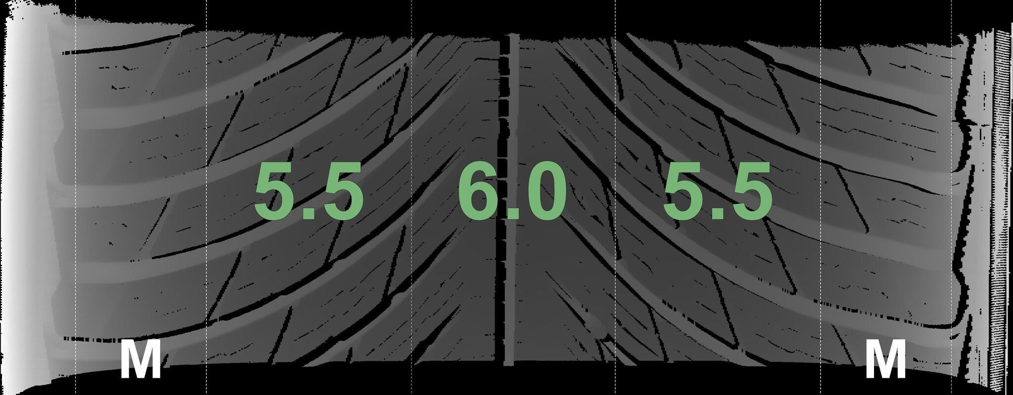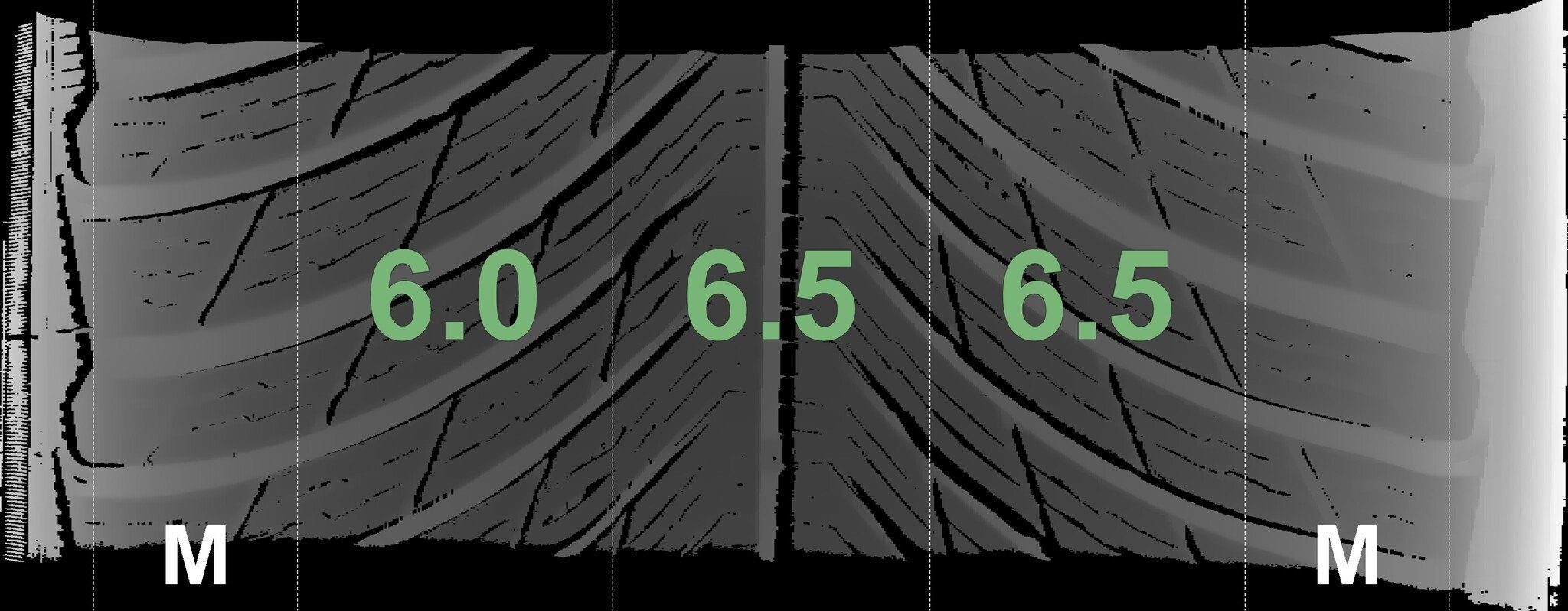 De gemeten profieldieptes en de details van de velgen zijn hierboven weergegeven.