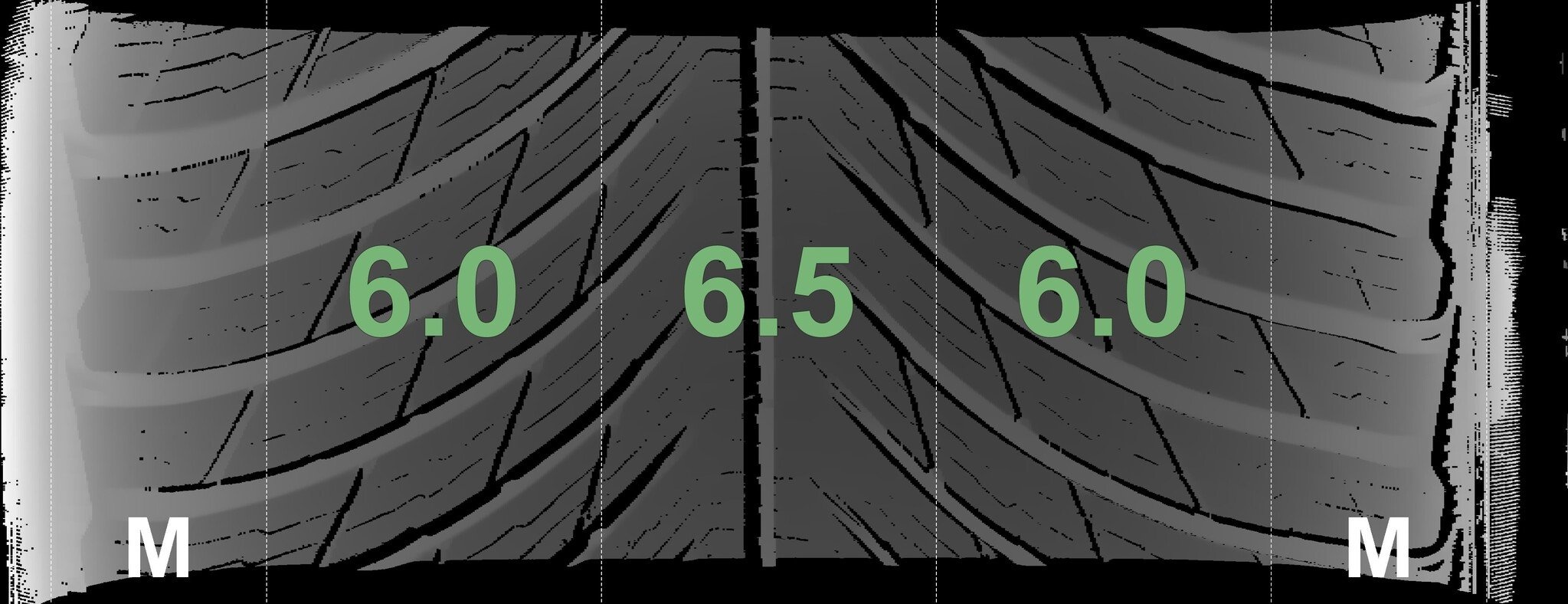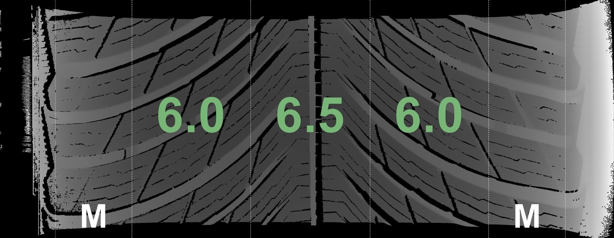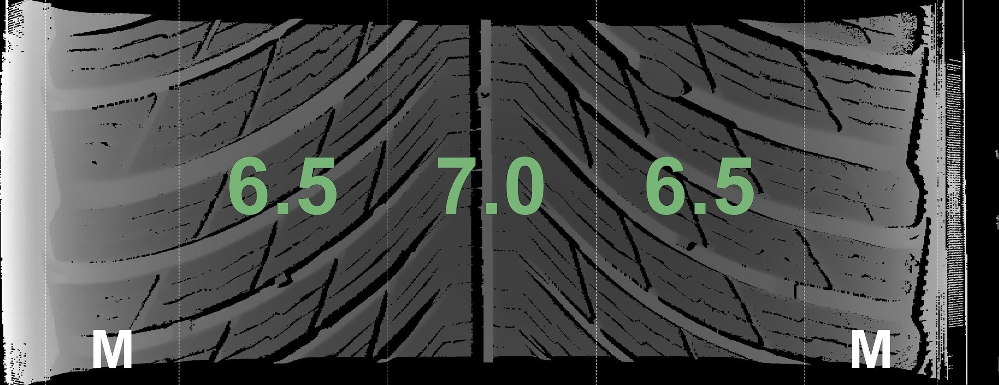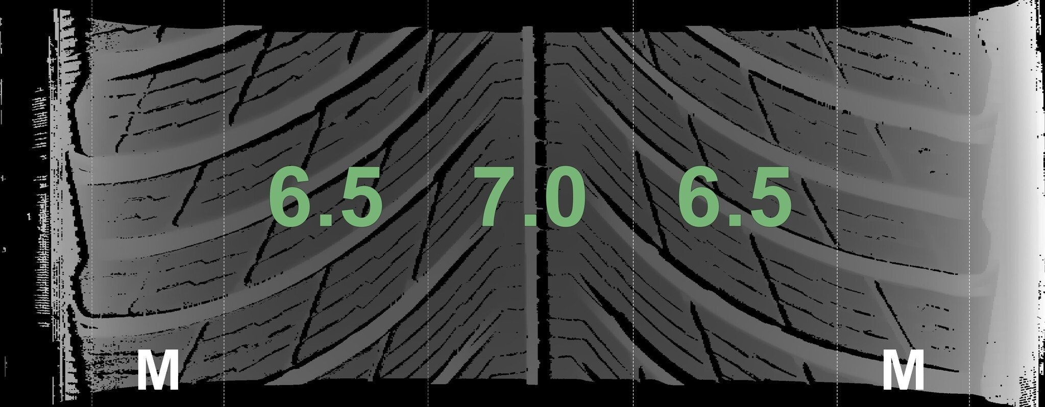 De gemeten profieldieptes en de details van de velgen zijn hierboven weergegeven.