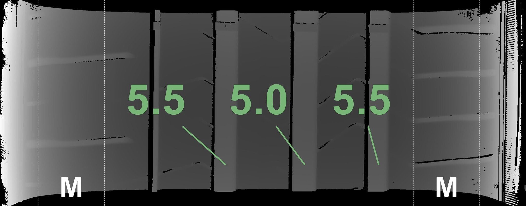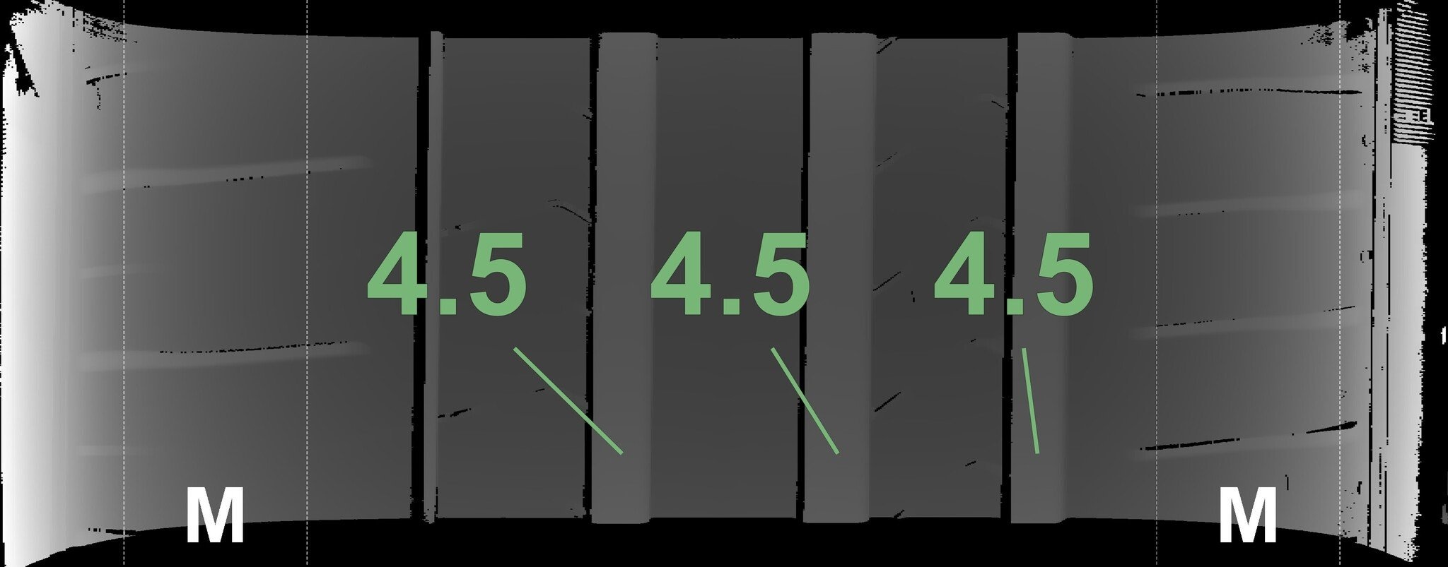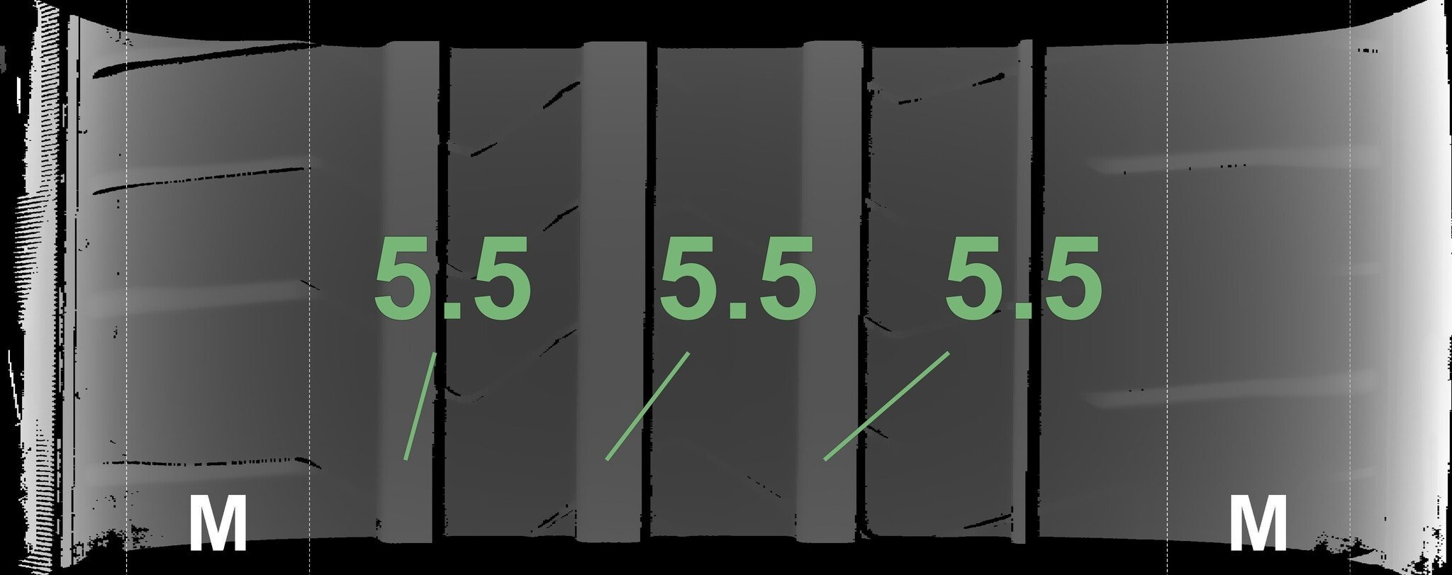 De gemeten profieldieptes en de details van de velgen zijn hierboven weergegeven.