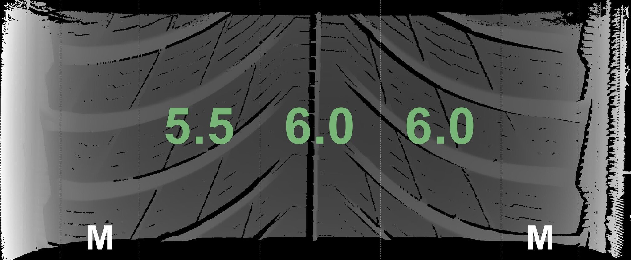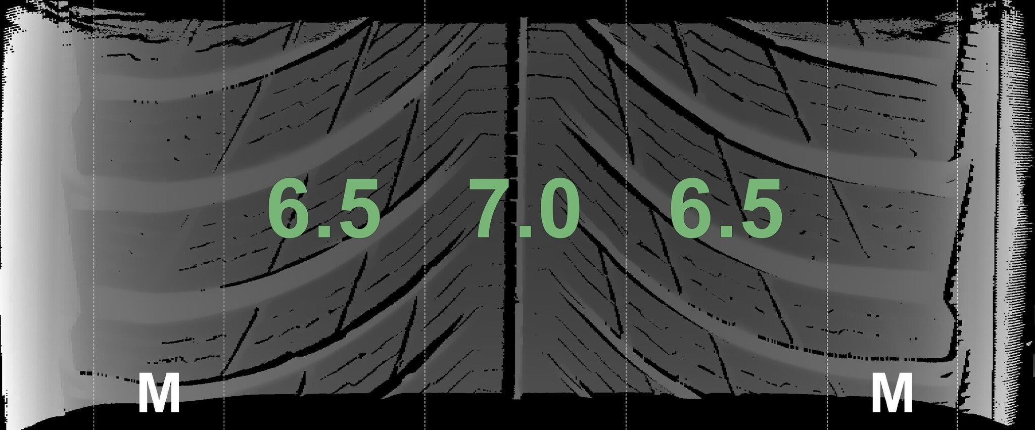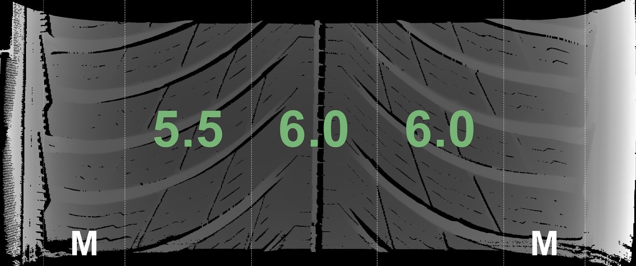 De gemeten profieldieptes en de details van de velgen zijn hierboven weergegeven.