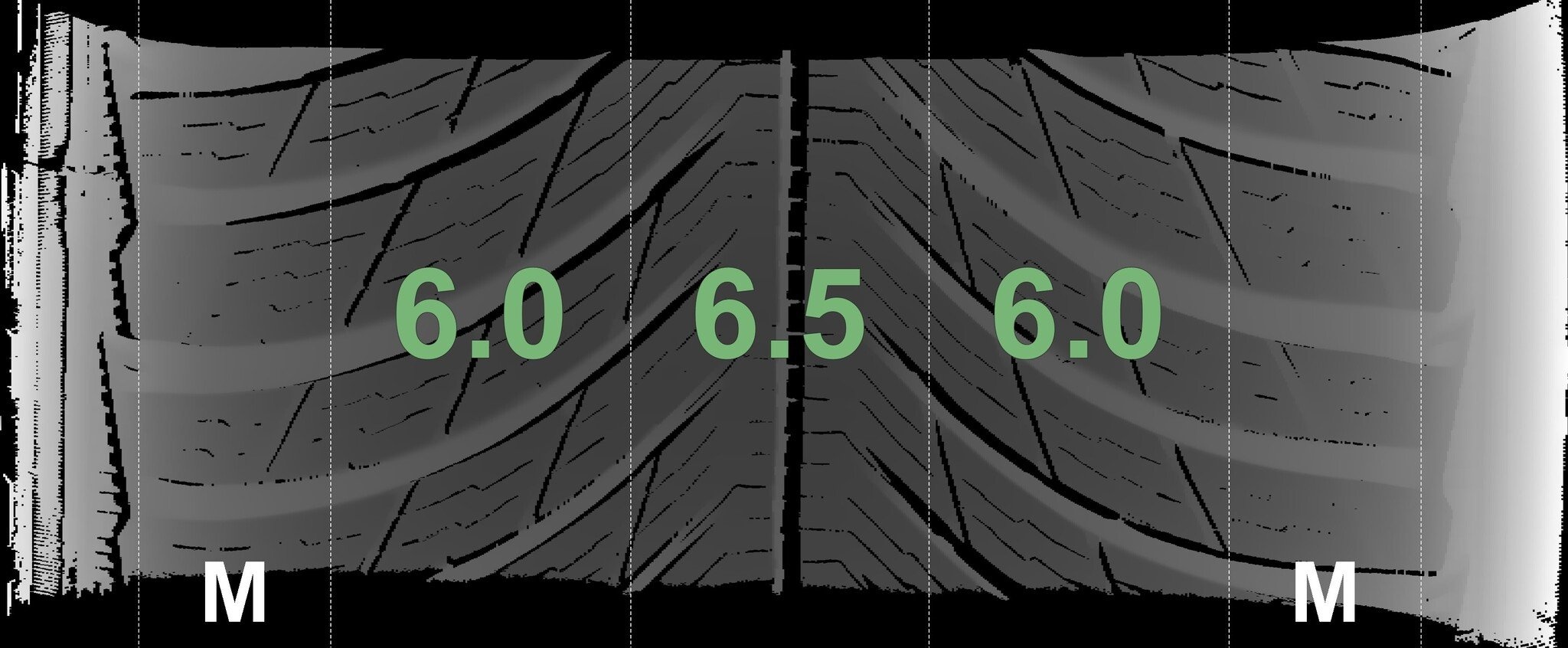 De gemeten profieldieptes en de details van de velgen zijn hierboven weergegeven.