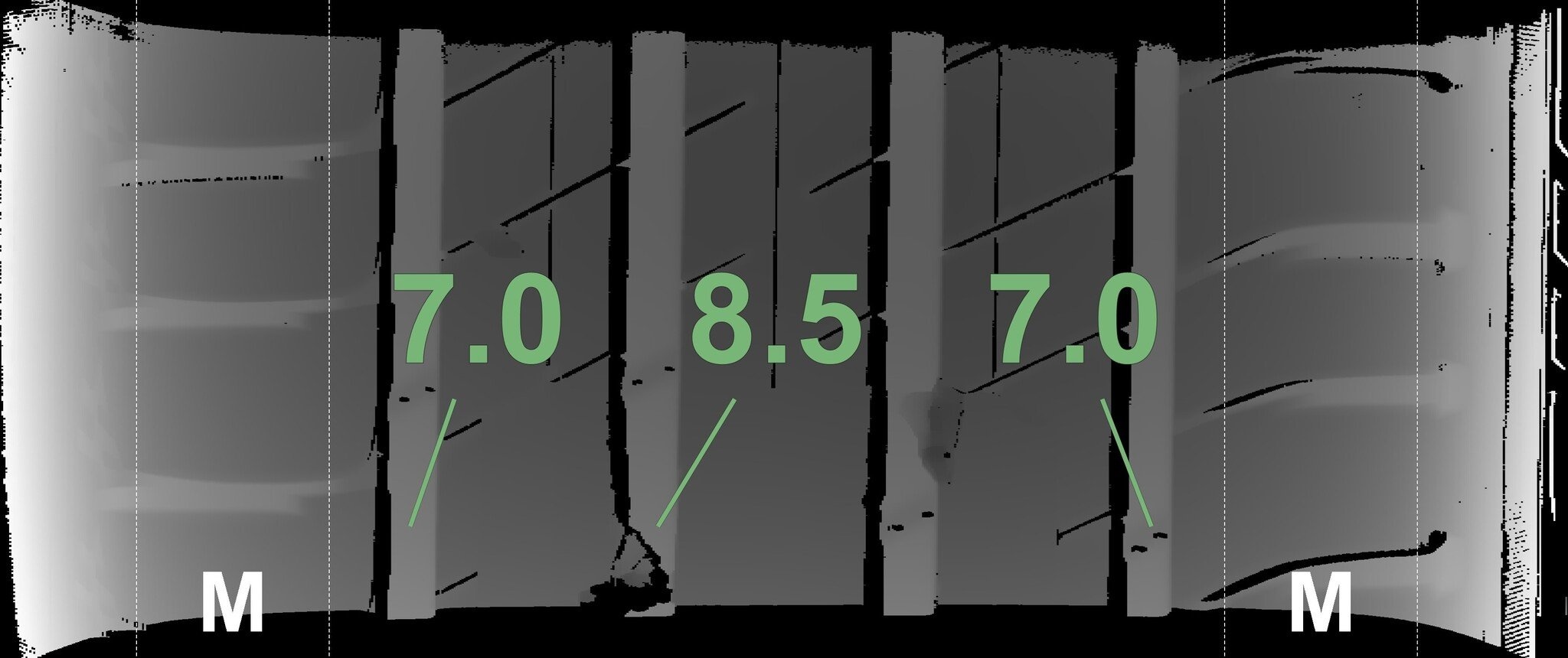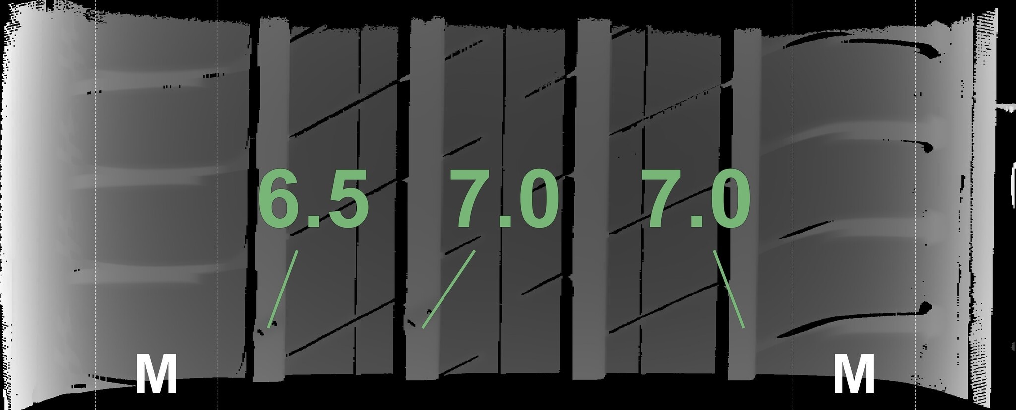 De gemeten profieldieptes en de details van de velgen zijn hierboven weergegeven.