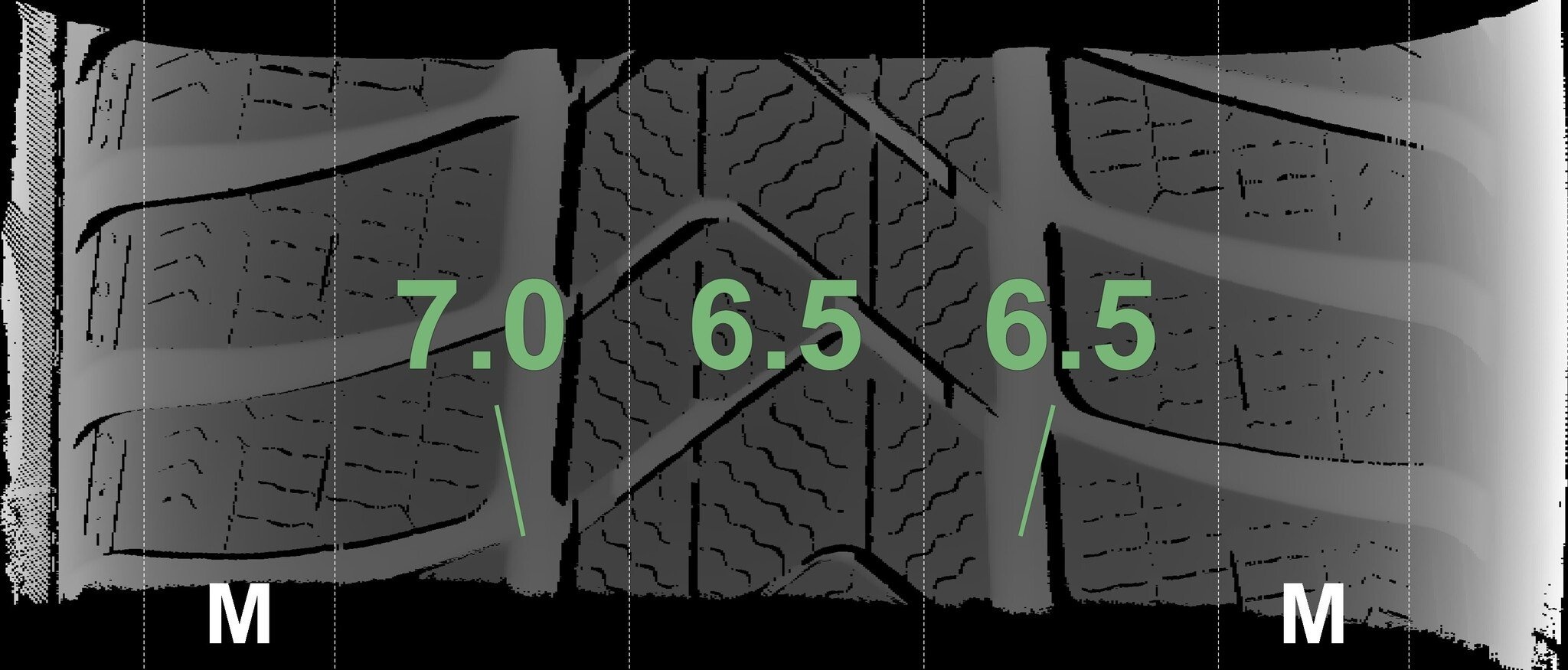 De gemeten profieldieptes en de details van de velgen zijn hierboven weergegeven.