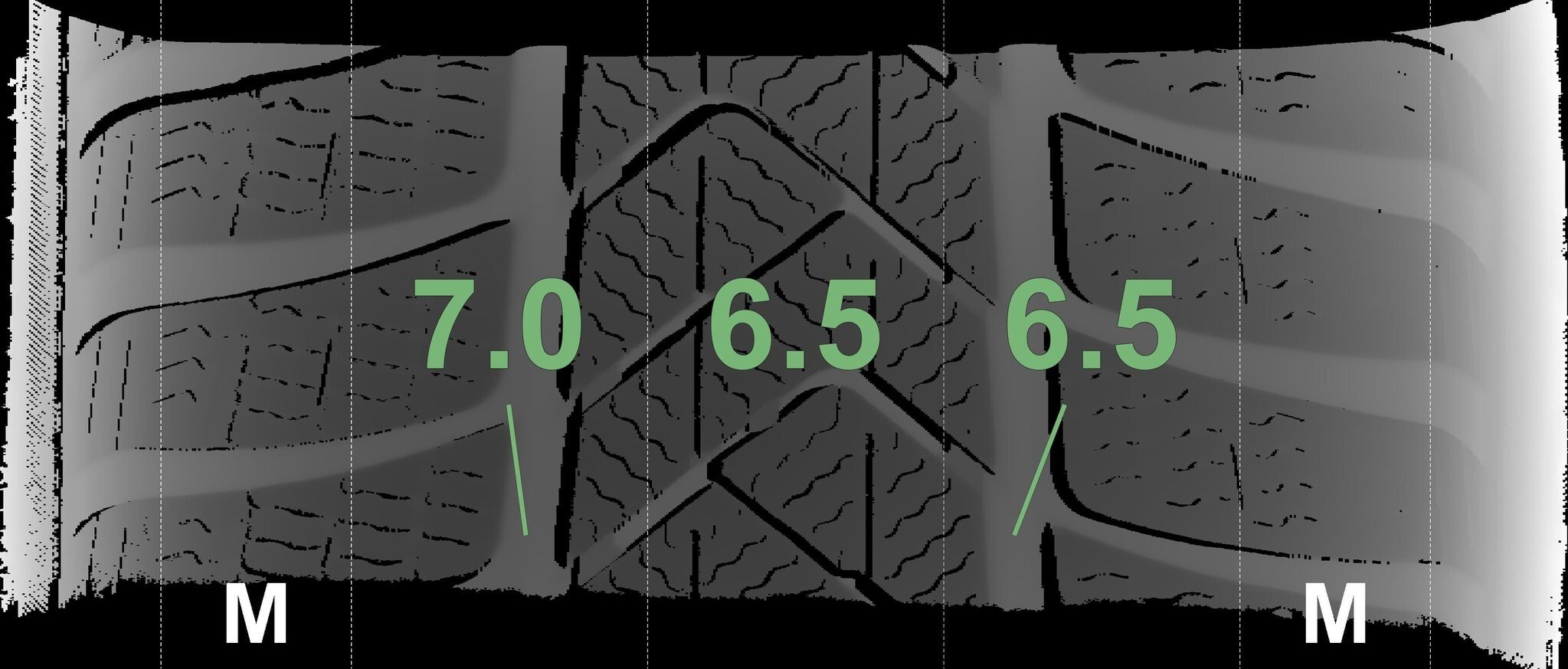 De gemeten profieldieptes en de details van de velgen zijn hierboven weergegeven.