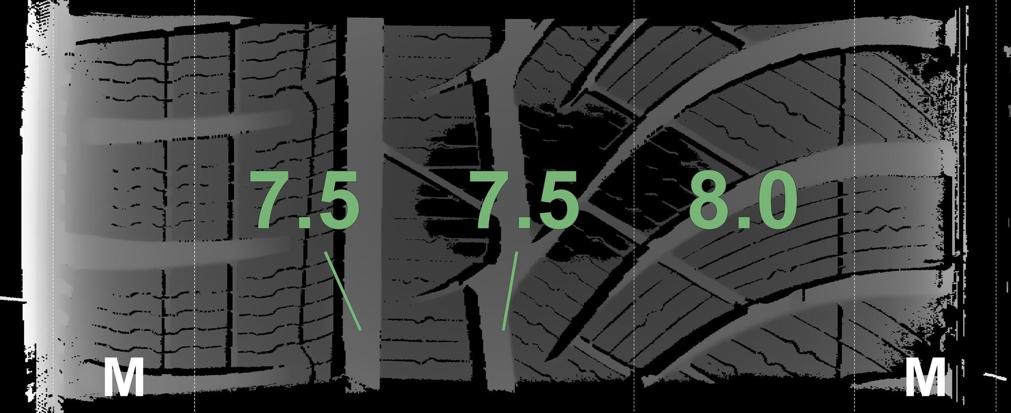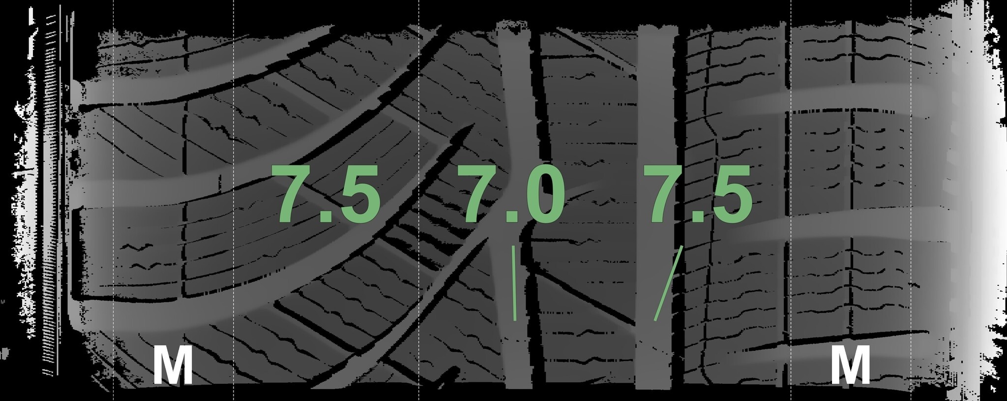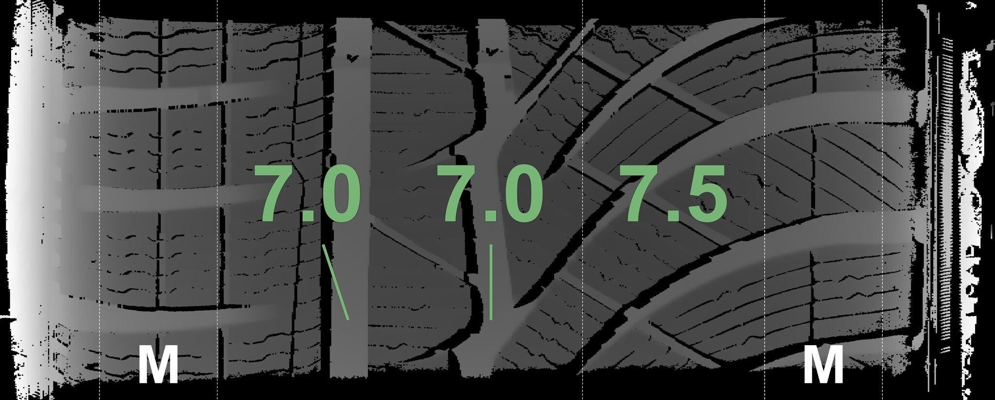 De gemeten profieldieptes en de details van de velgen zijn hierboven weergegeven.