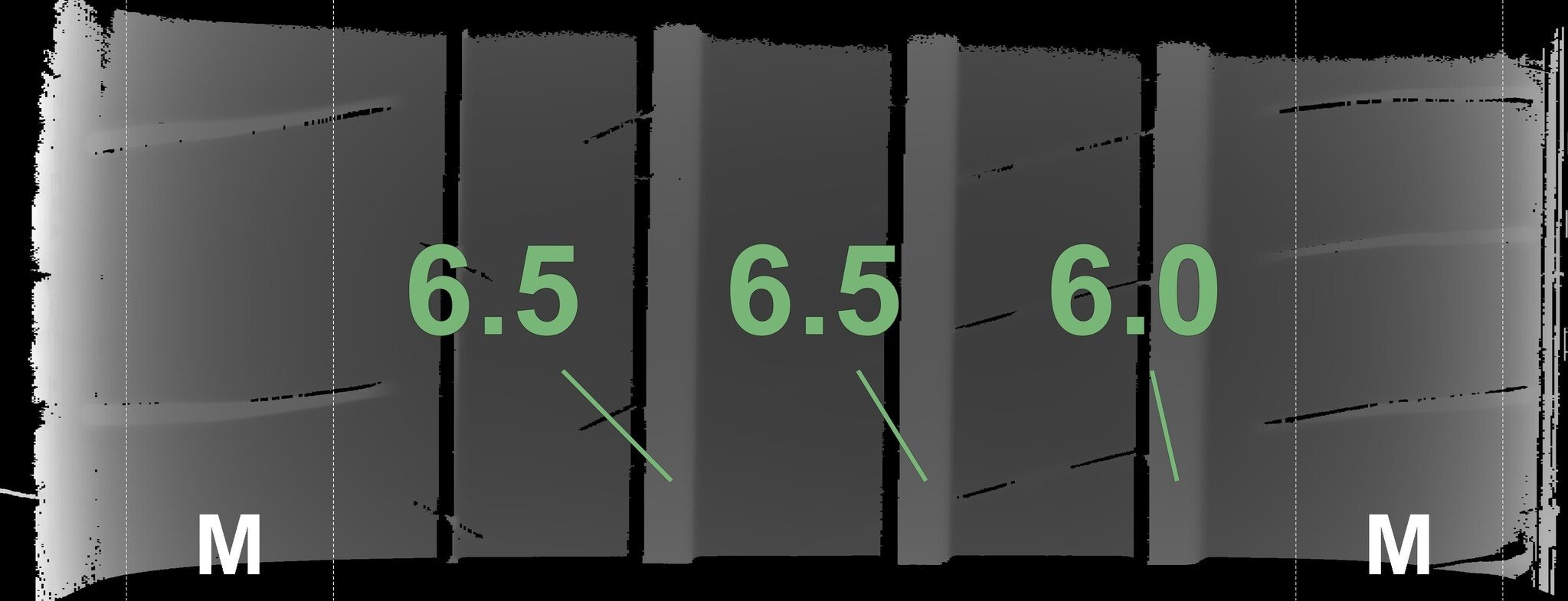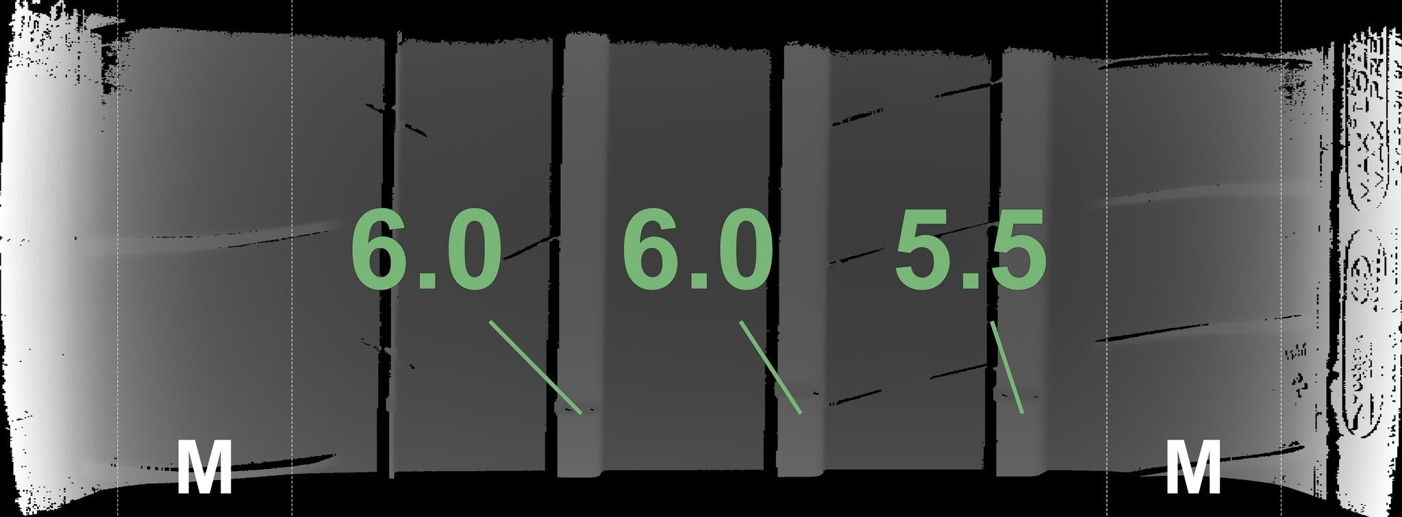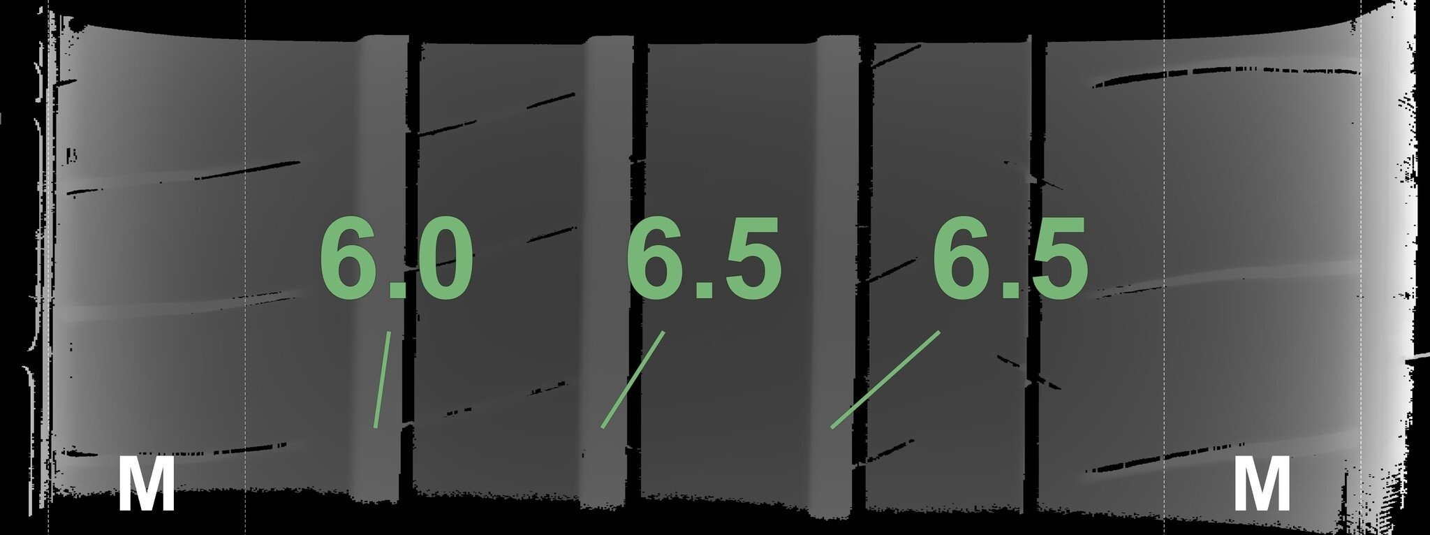 De gemeten profieldieptes en de details van de velgen zijn hierboven weergegeven.