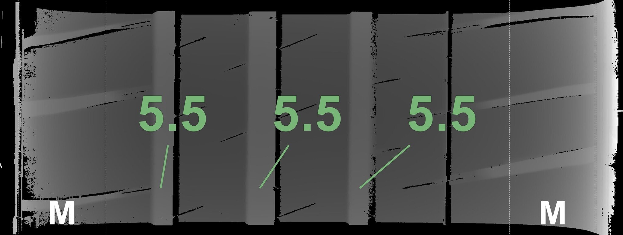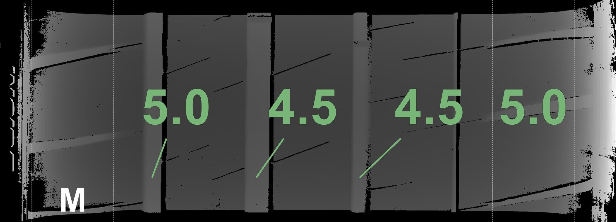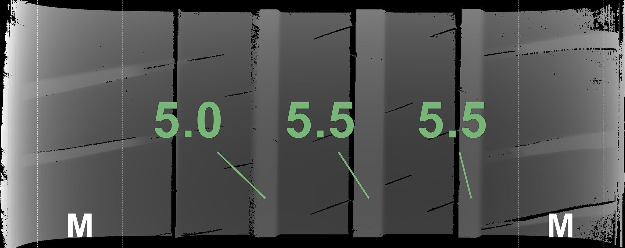 De gemeten profieldieptes en de details van de velgen zijn hierboven weergegeven.