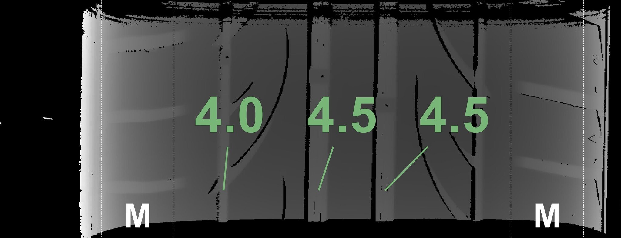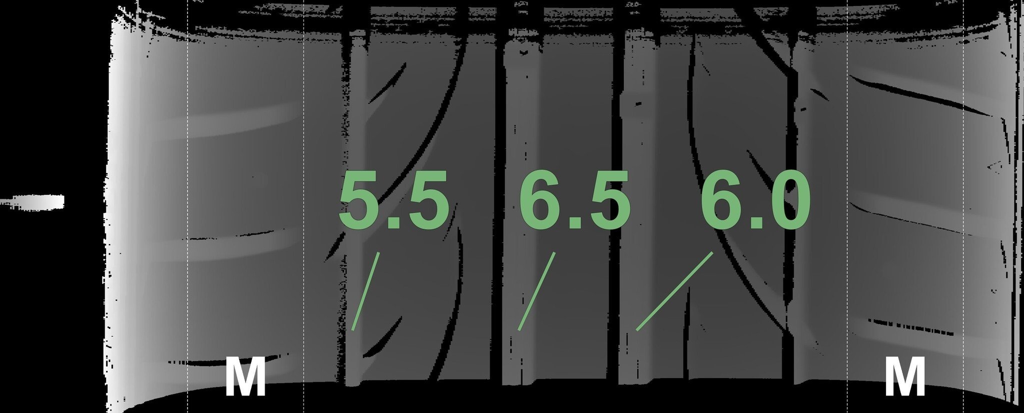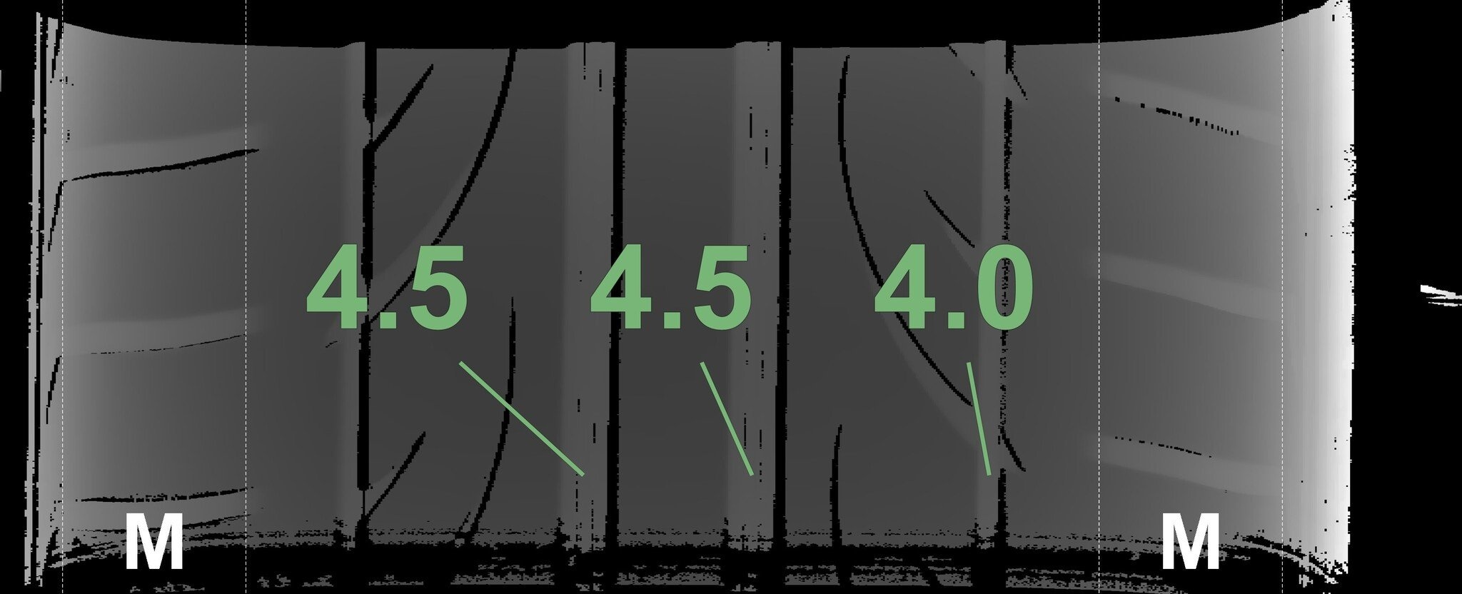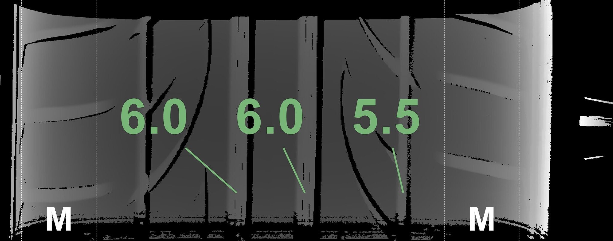 De gemeten profieldieptes en de details van de velgen zijn hierboven weergegeven.