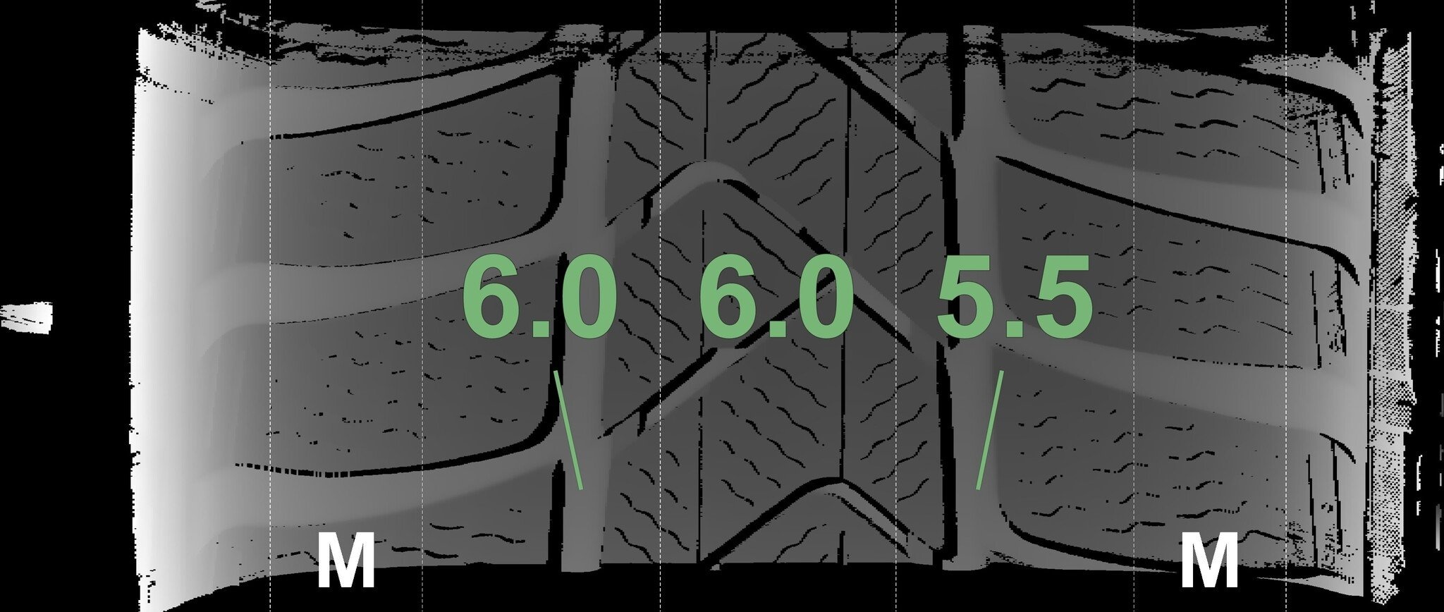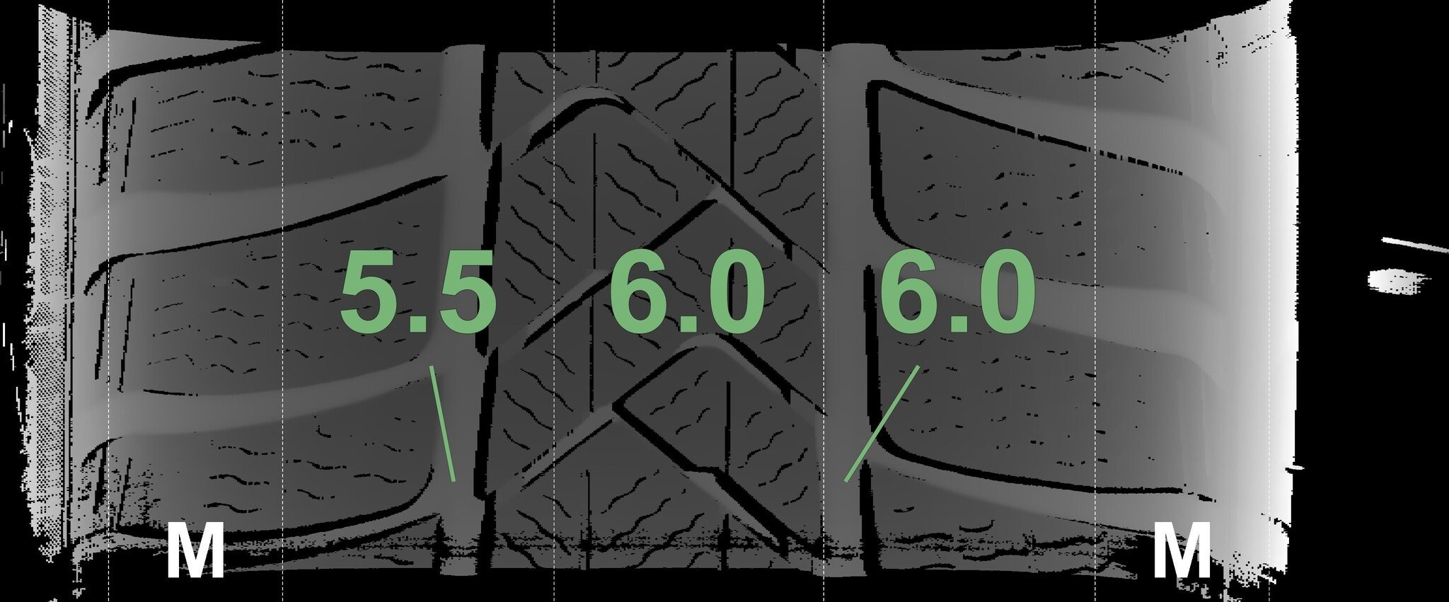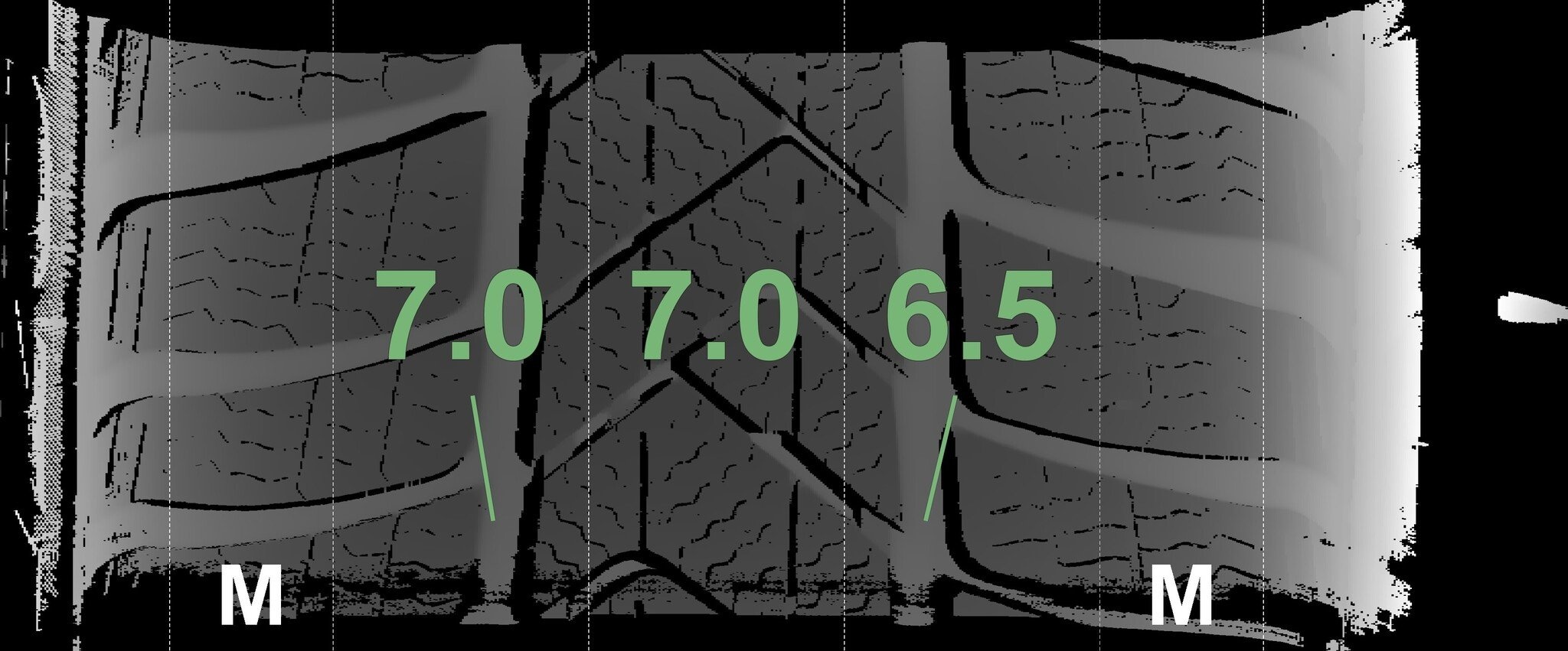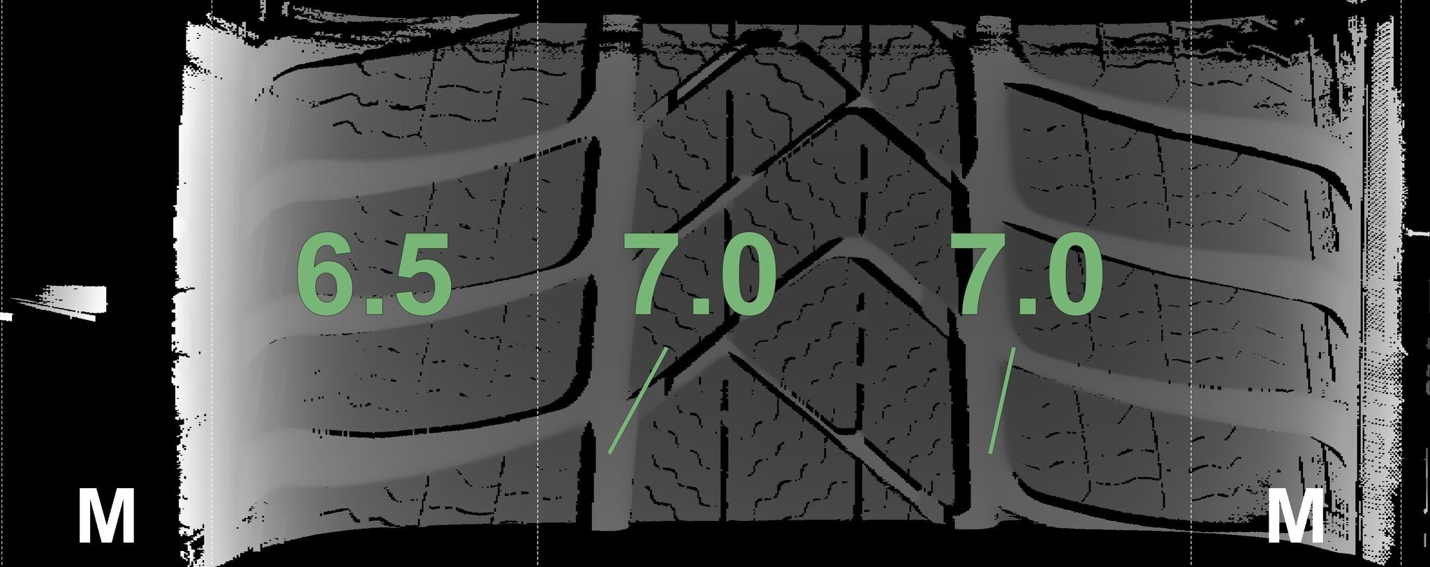 De gemeten profieldieptes en de details van de velgen zijn hierboven weergegeven.