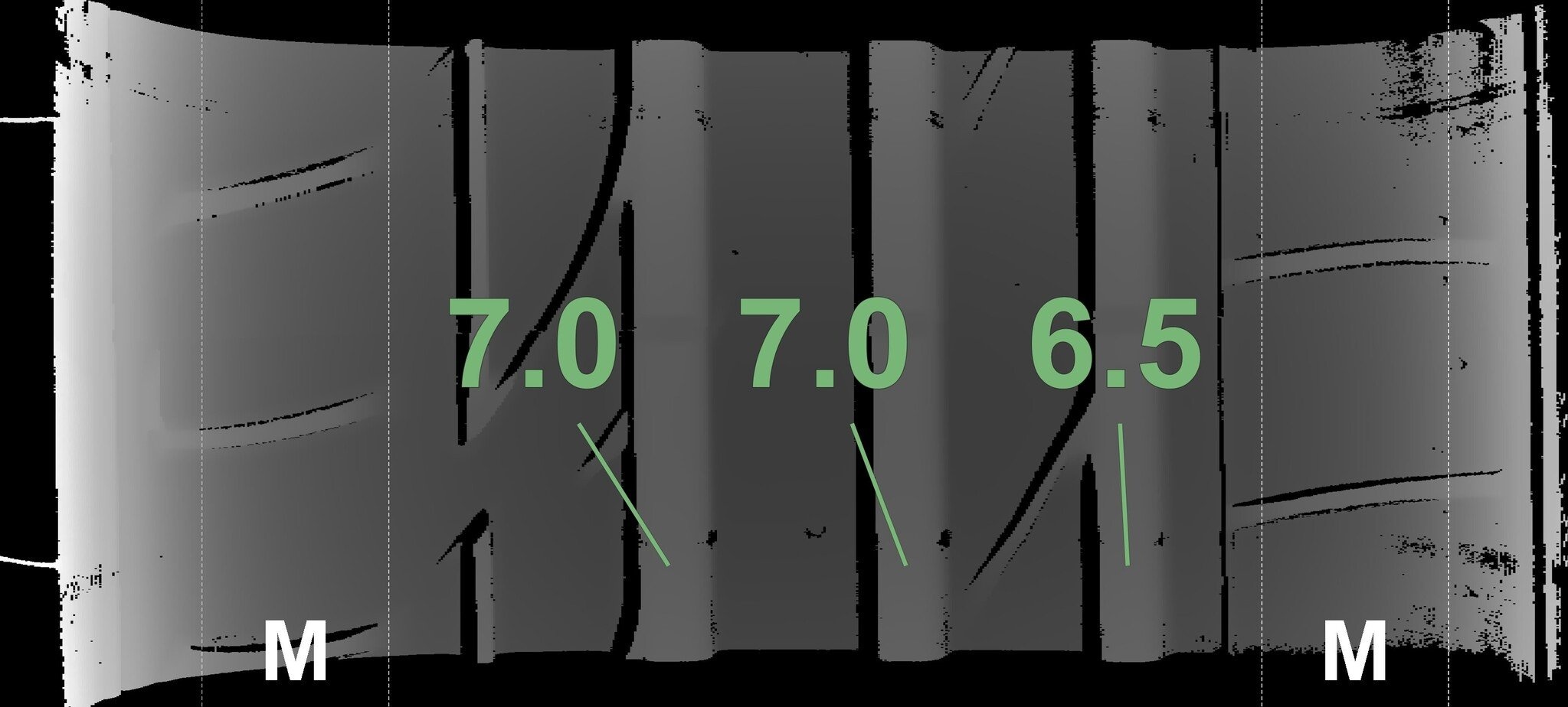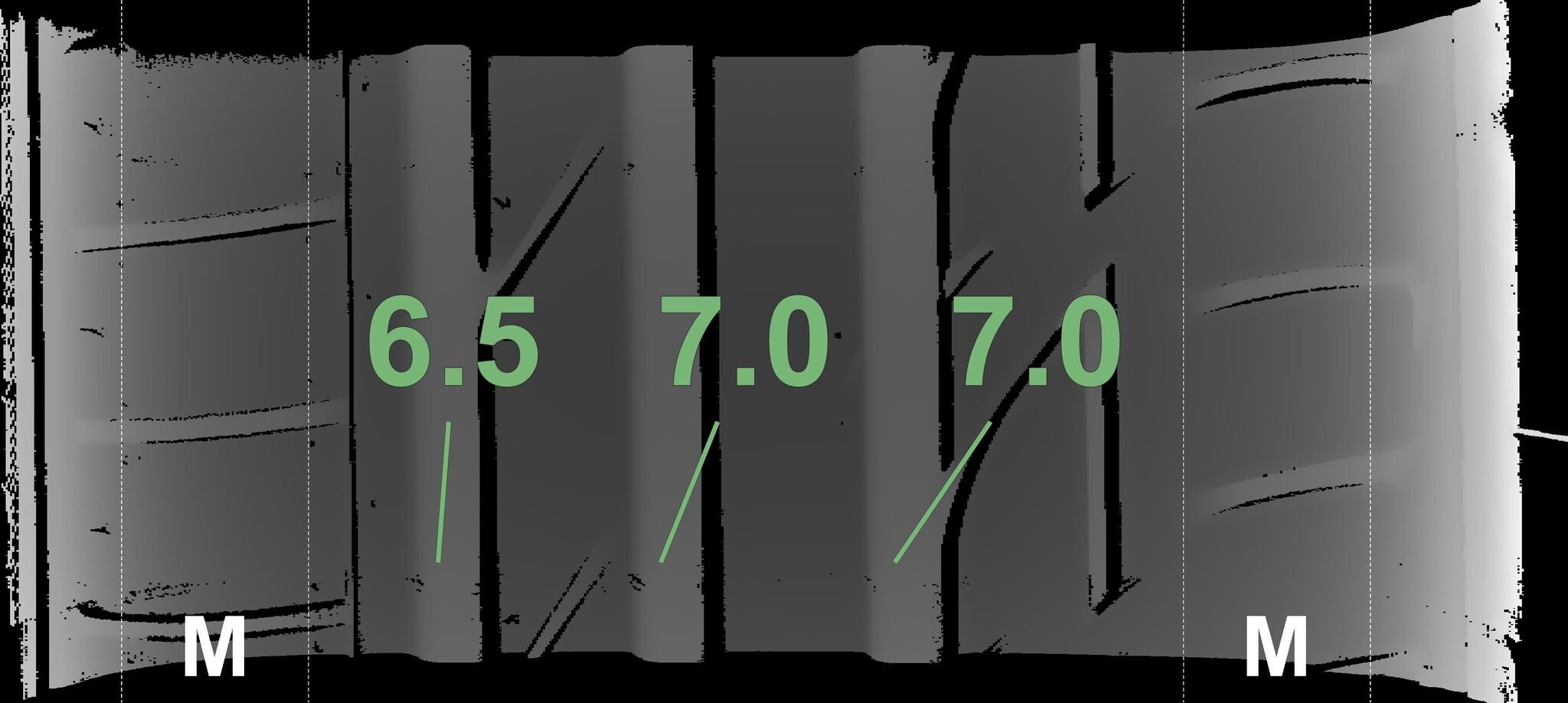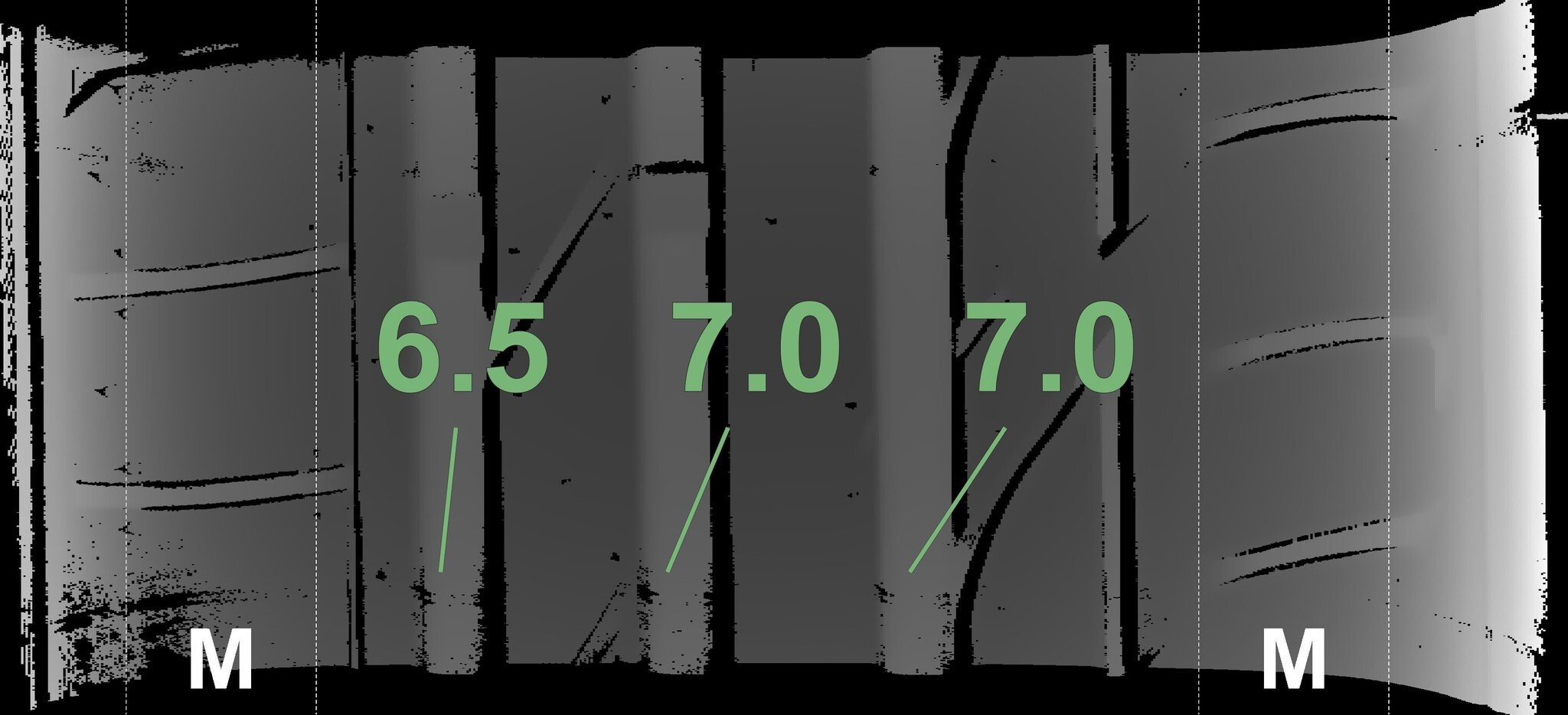 De gemeten profieldieptes en de details van de velgen zijn hierboven weergegeven.