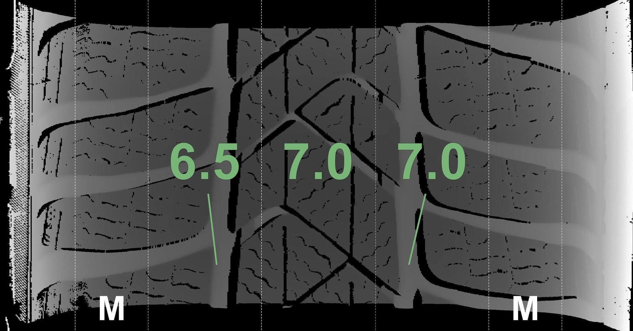 De gemeten profieldieptes en de details van de velgen zijn hierboven weergegeven.