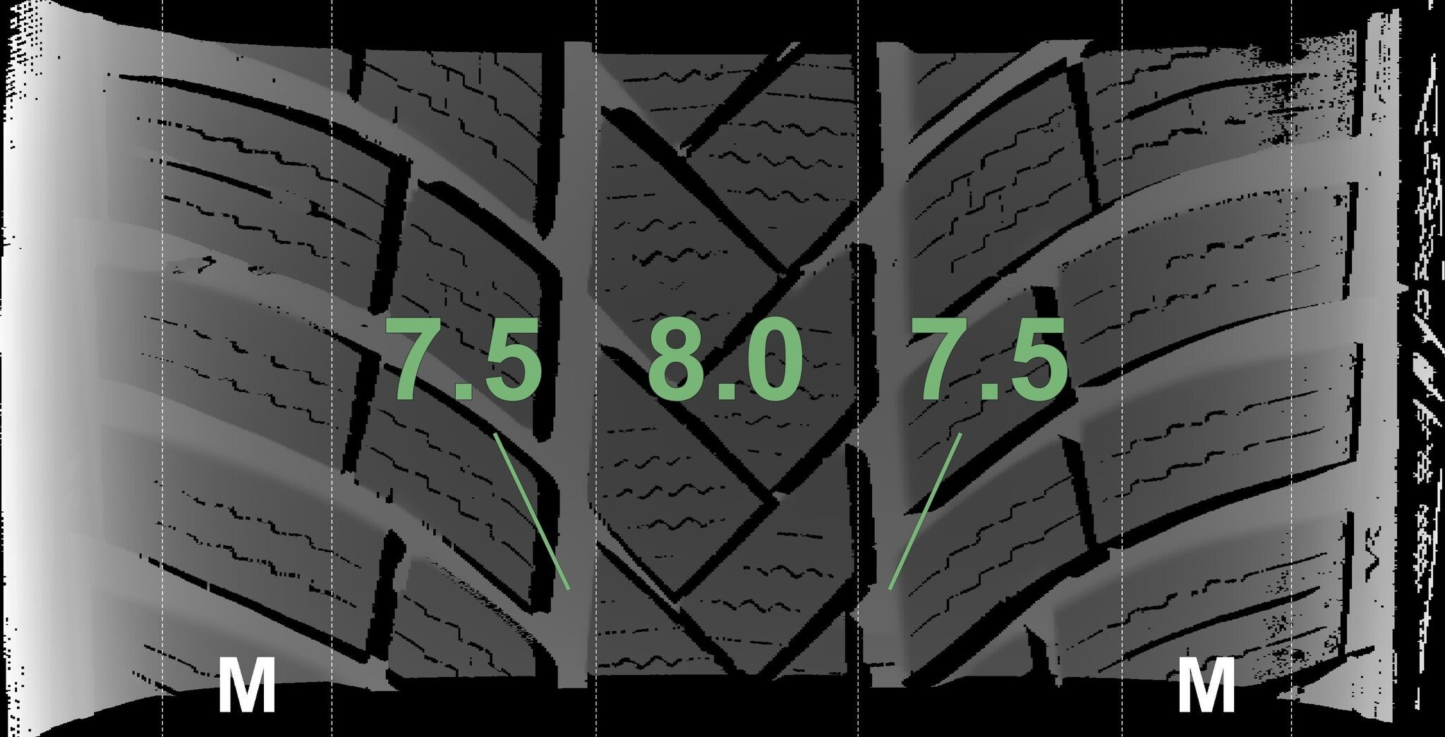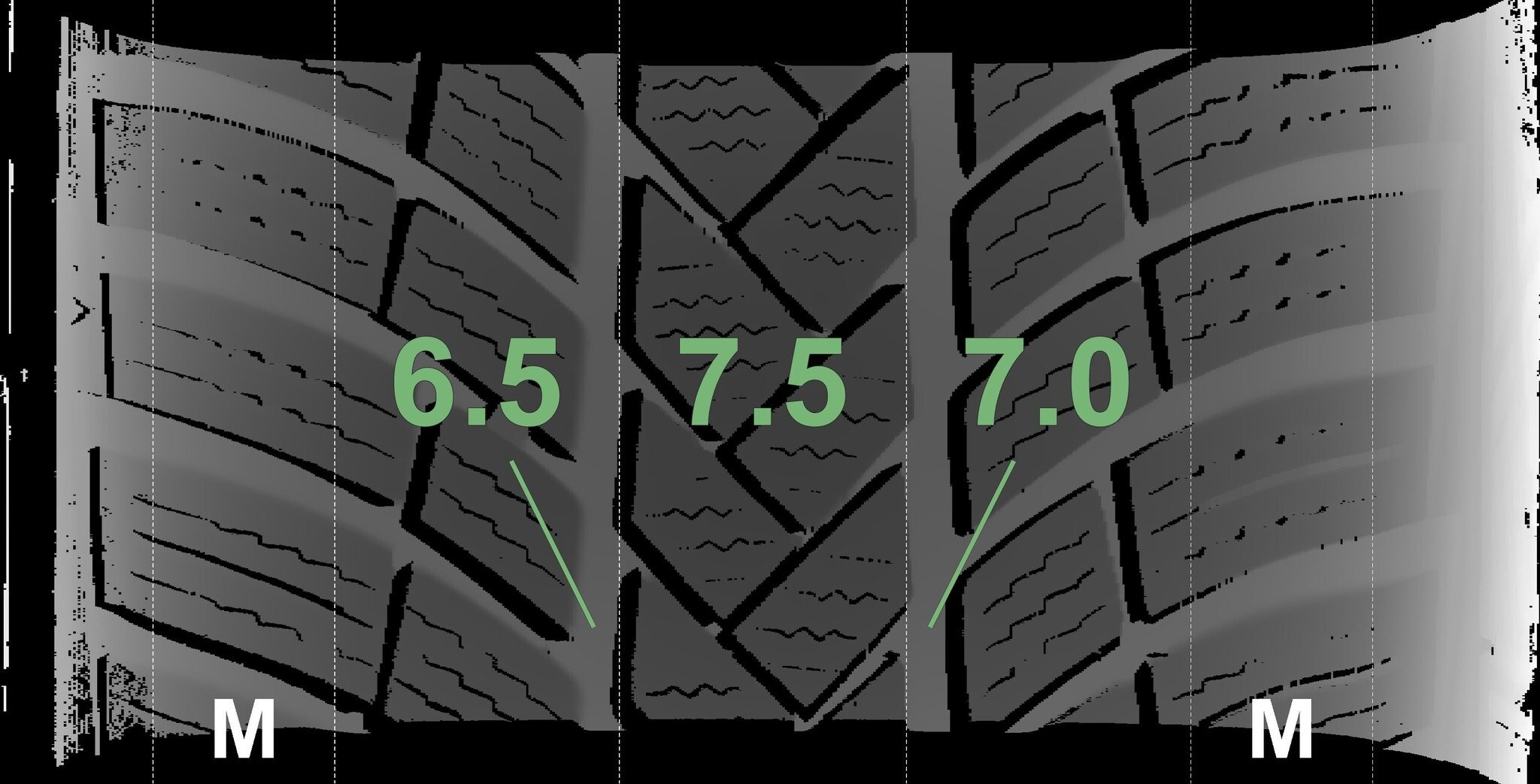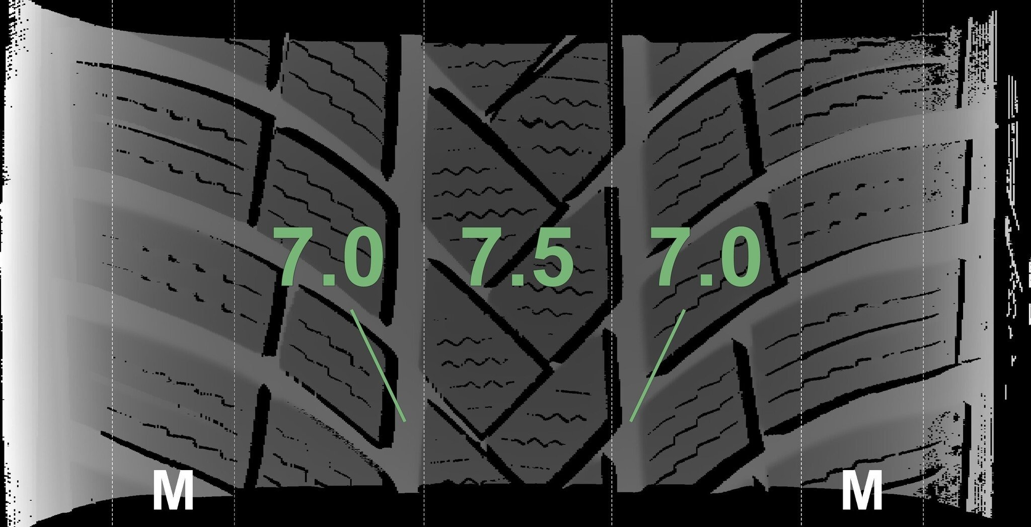 De gemeten profieldieptes en de details van de velgen zijn hierboven weergegeven.