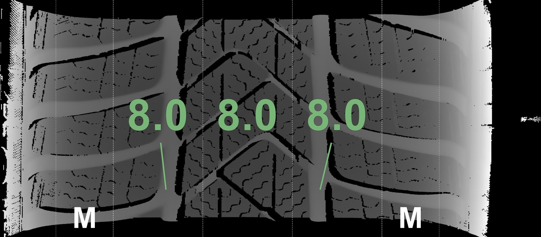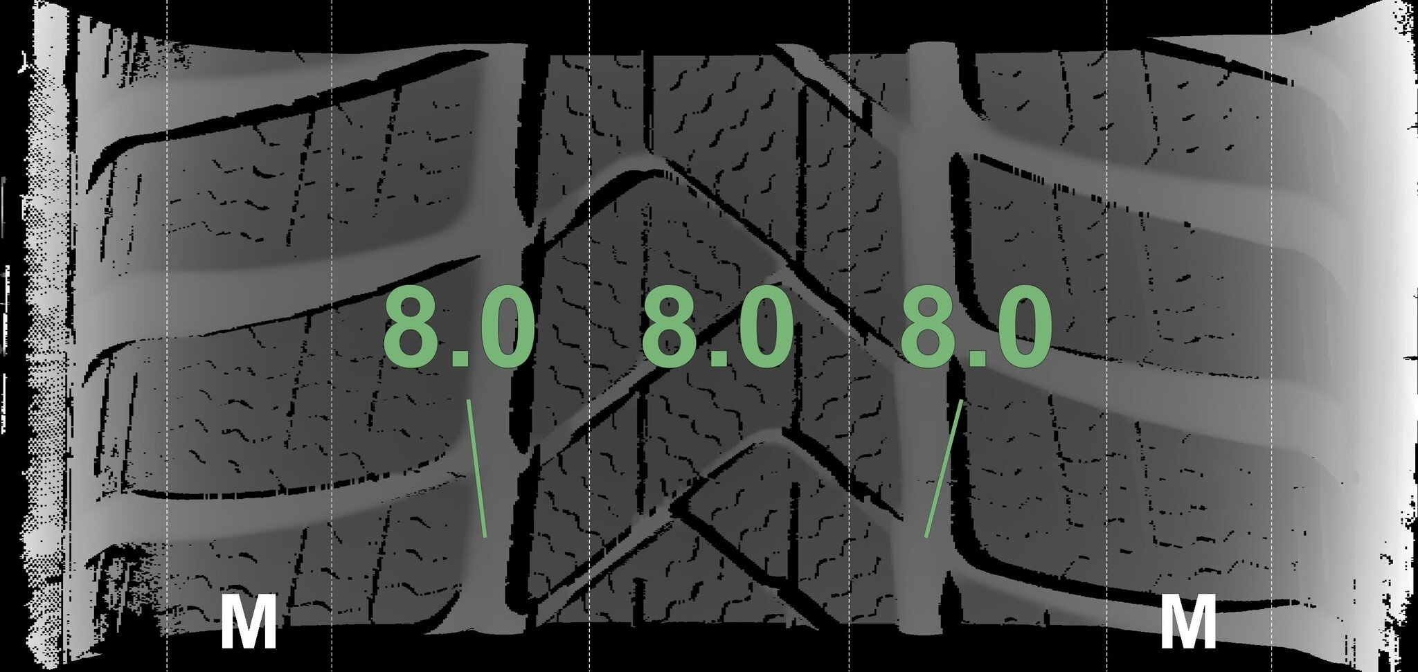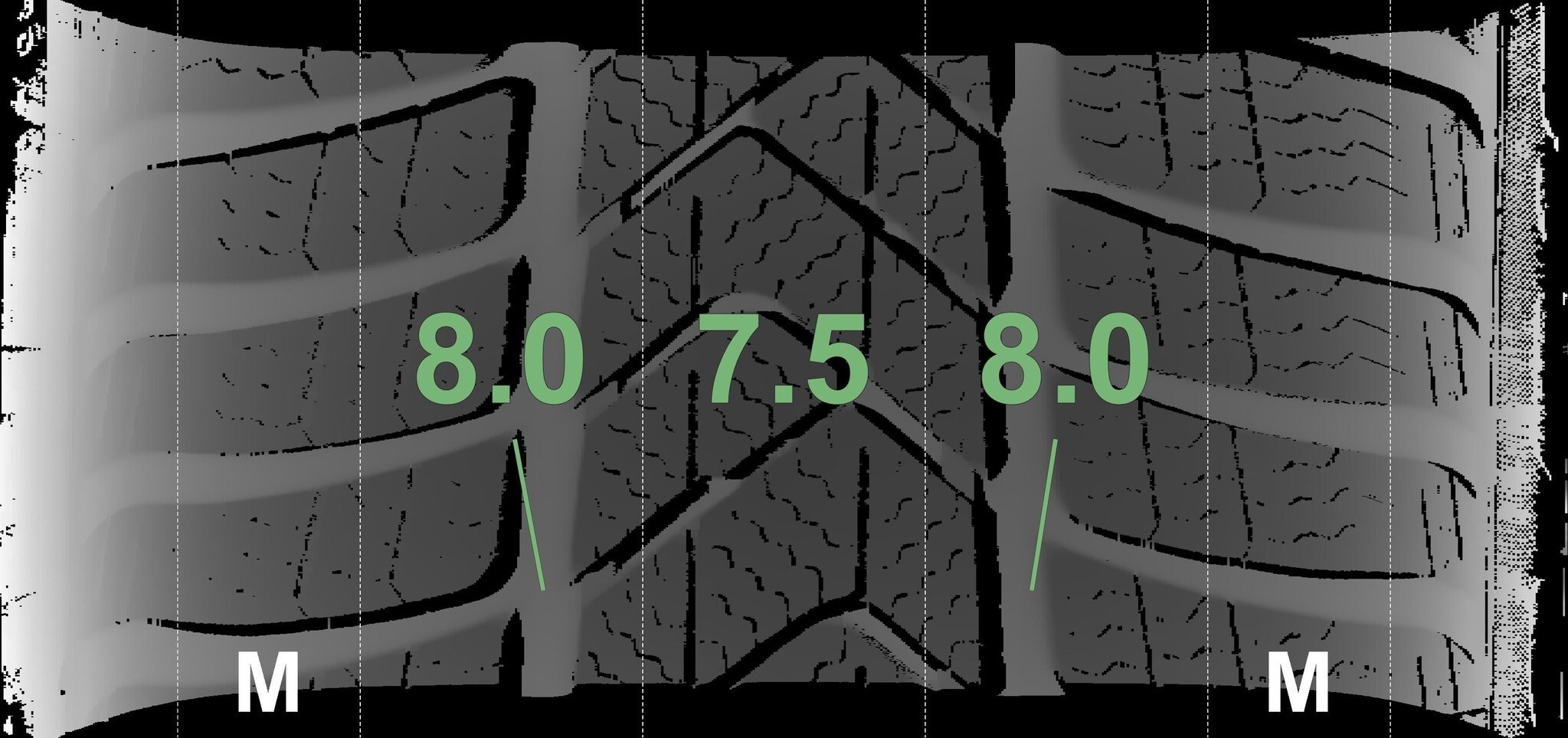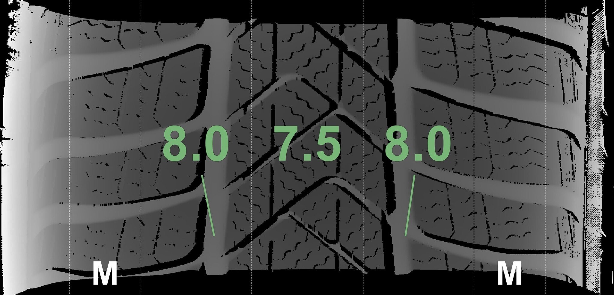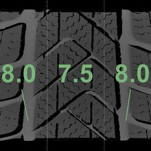De gemeten profieldieptes en de details van de velgen zijn hierboven weergegeven.