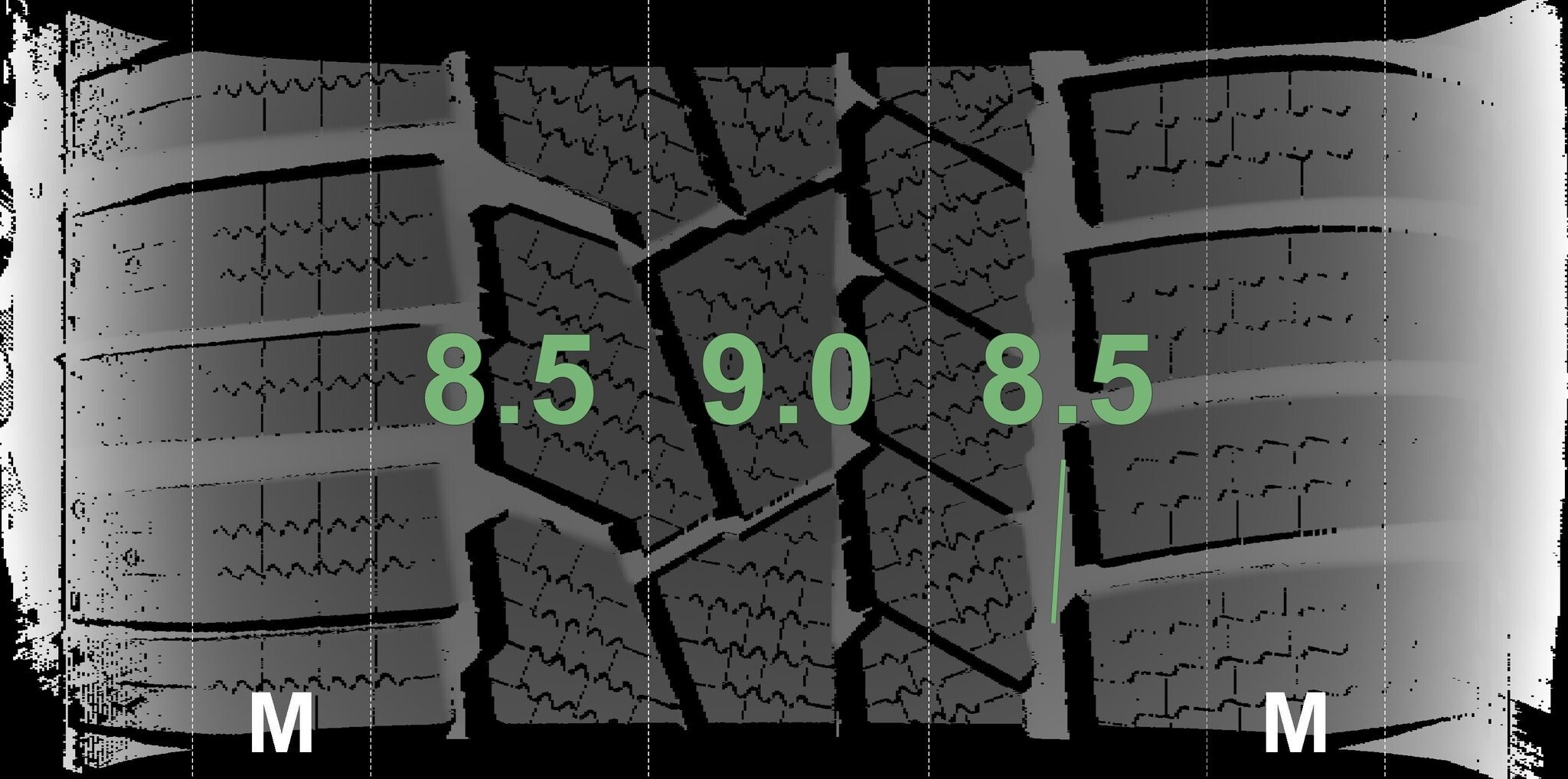 De gemeten profieldieptes en de details van de velgen zijn hierboven weergegeven.