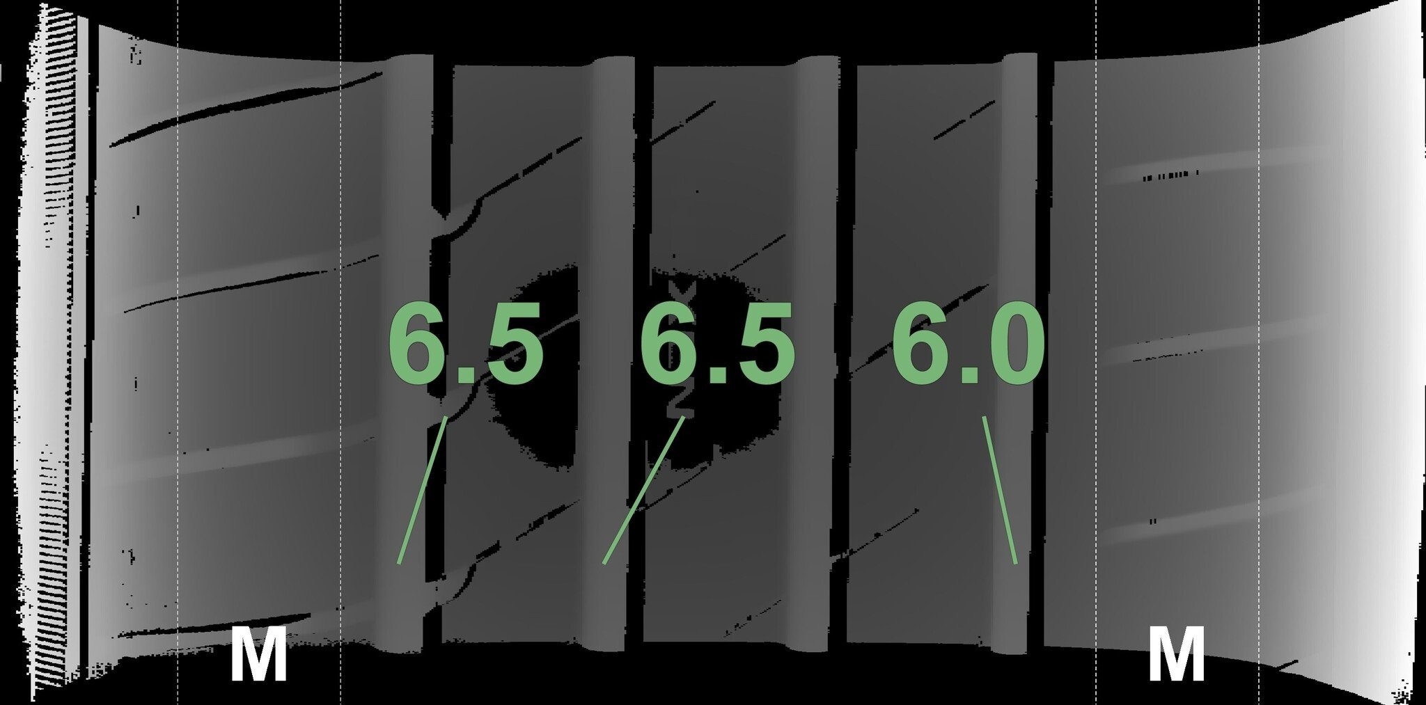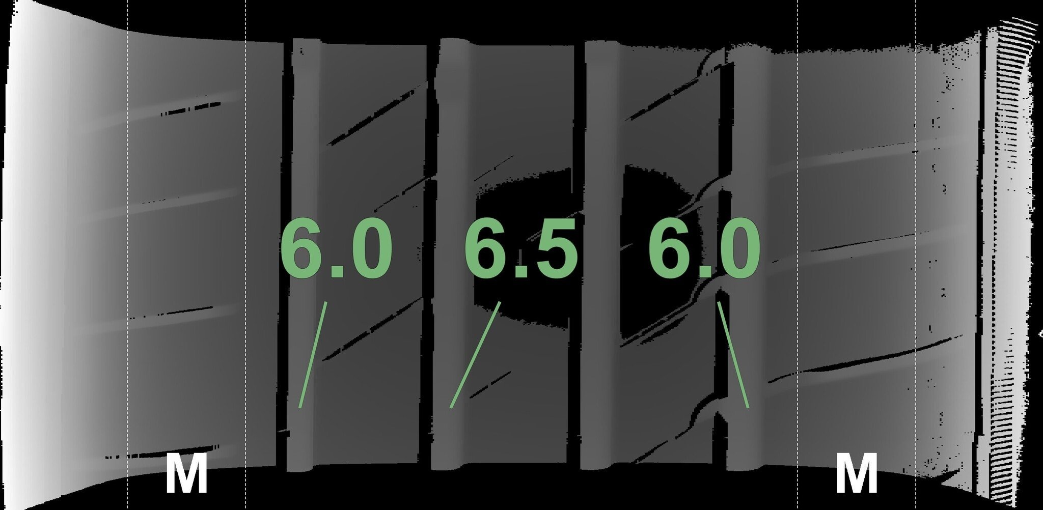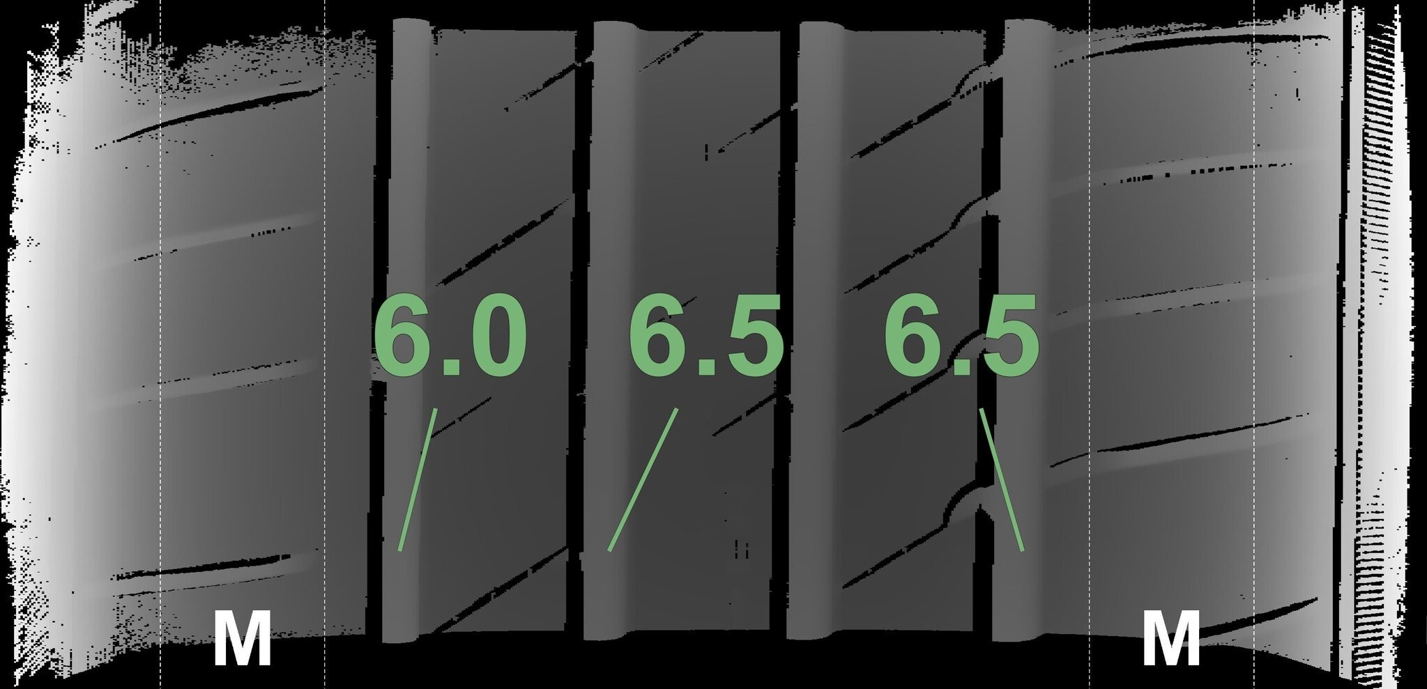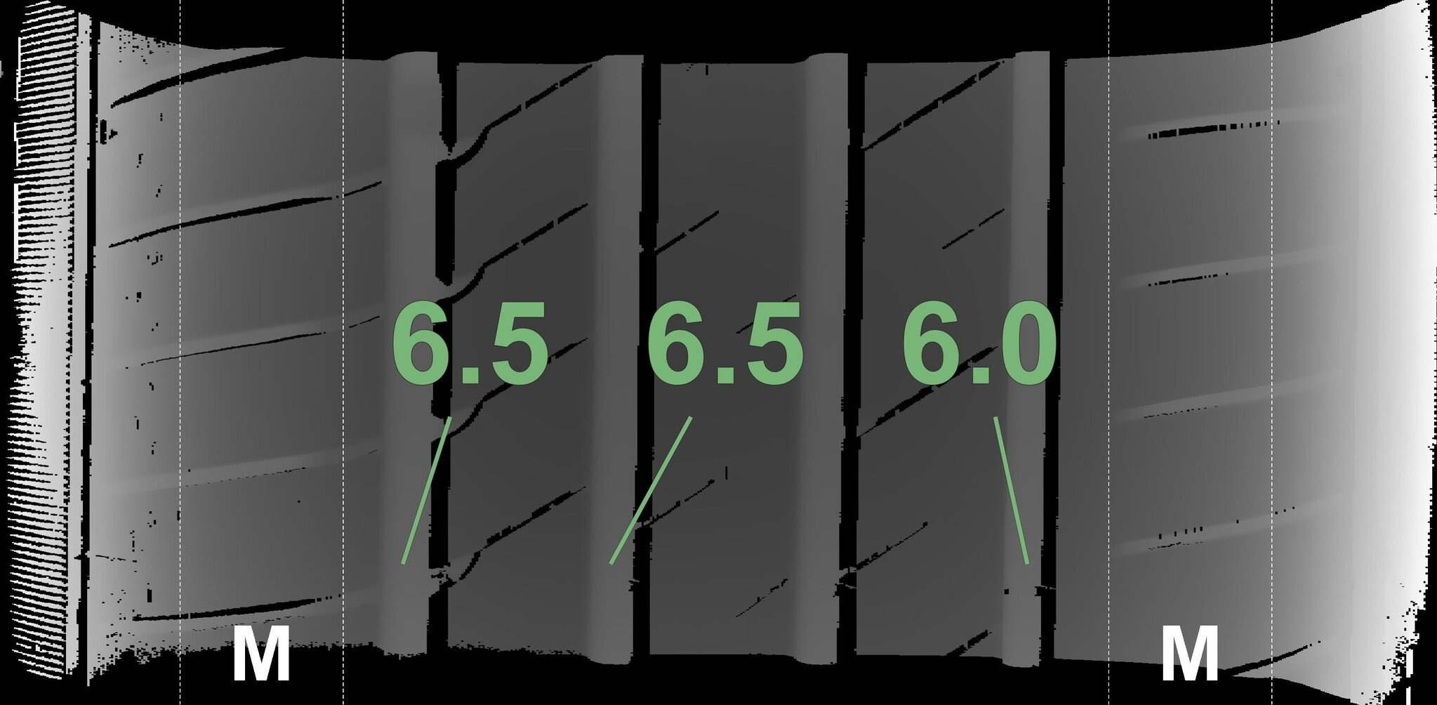 De gemeten profieldieptes en de details van de velgen zijn hierboven weergegeven.