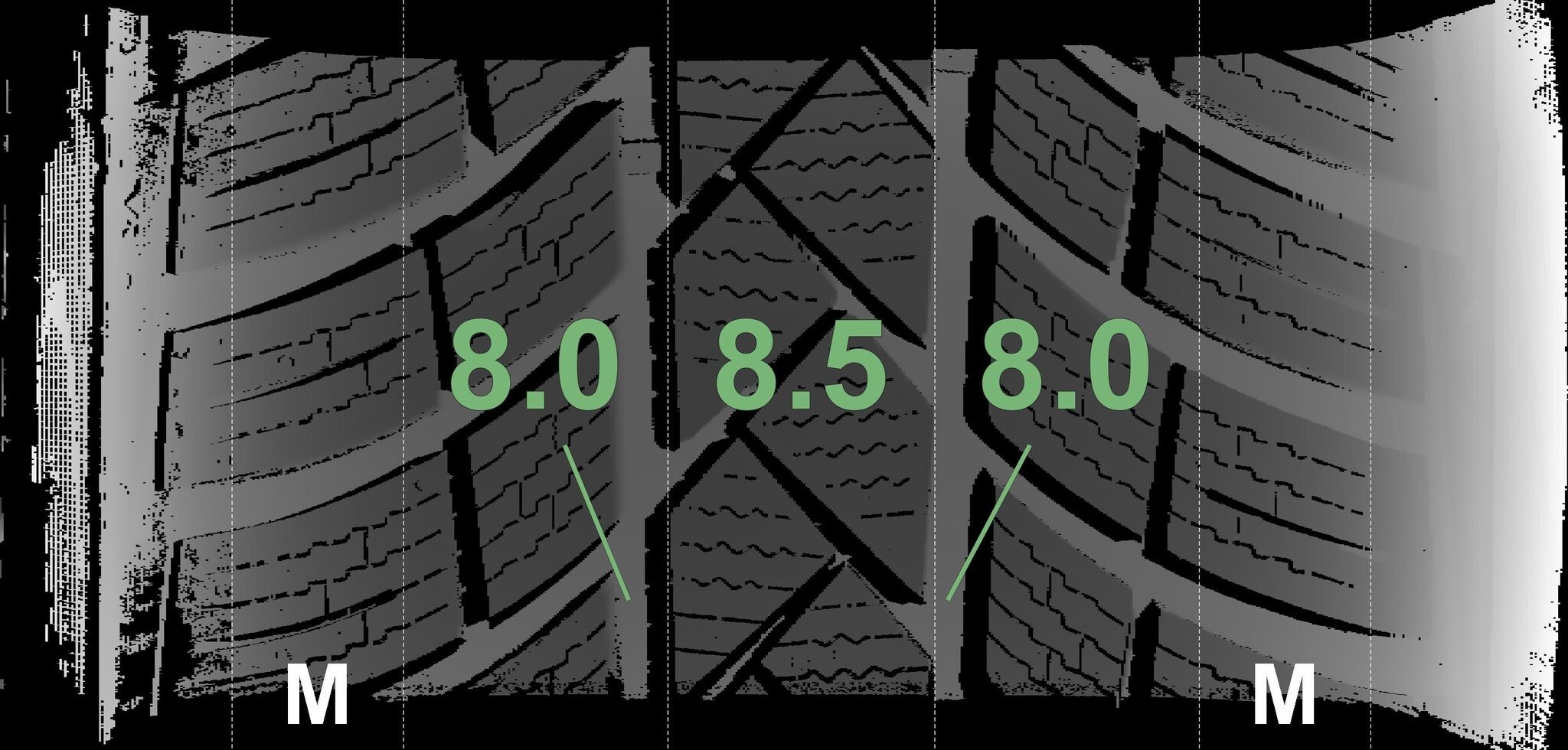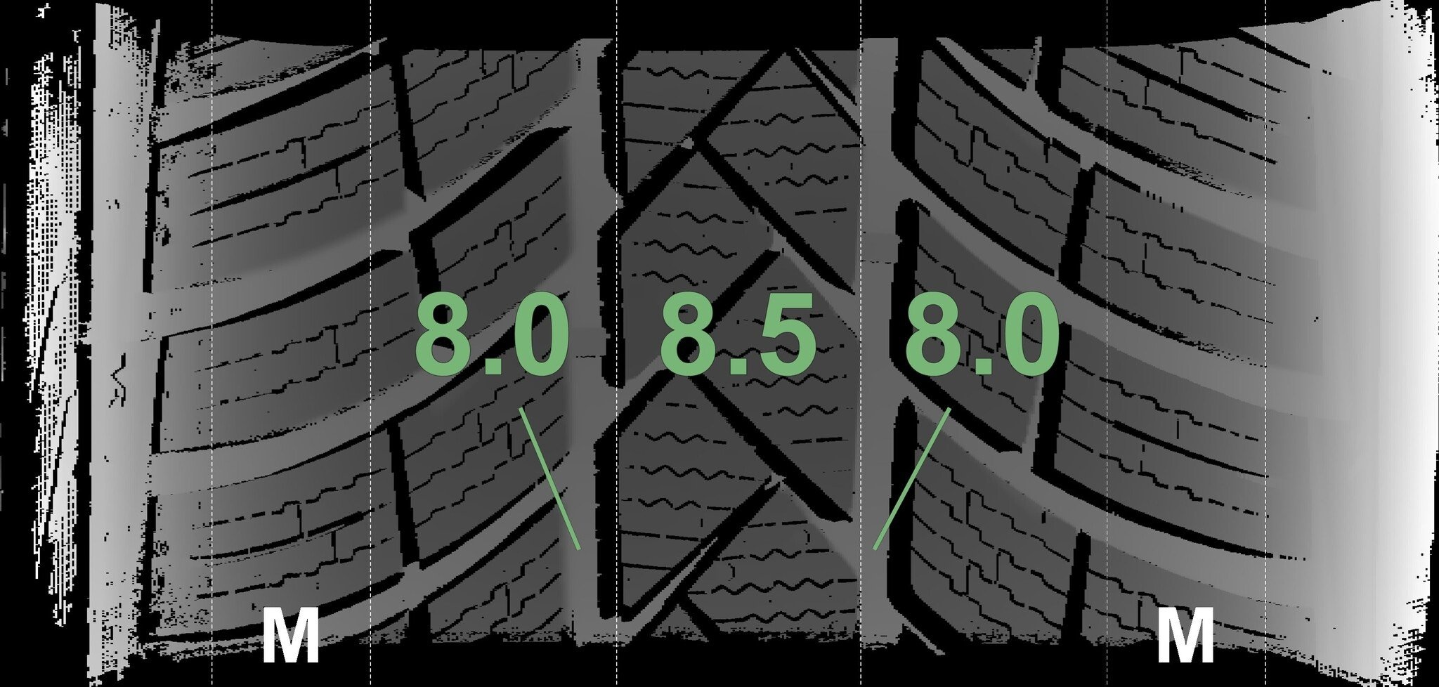 De gemeten profieldieptes en de details van de velgen zijn hierboven weergegeven.