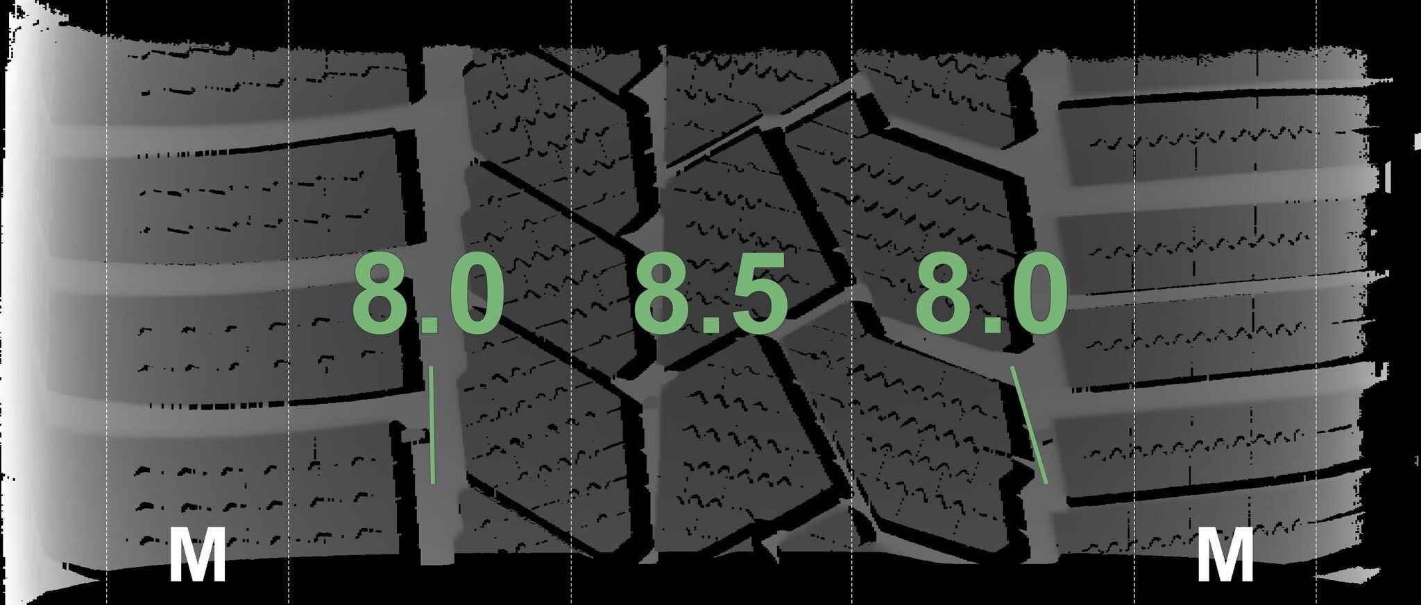 De gemeten profieldieptes en de details van de velgen zijn hierboven weergegeven.