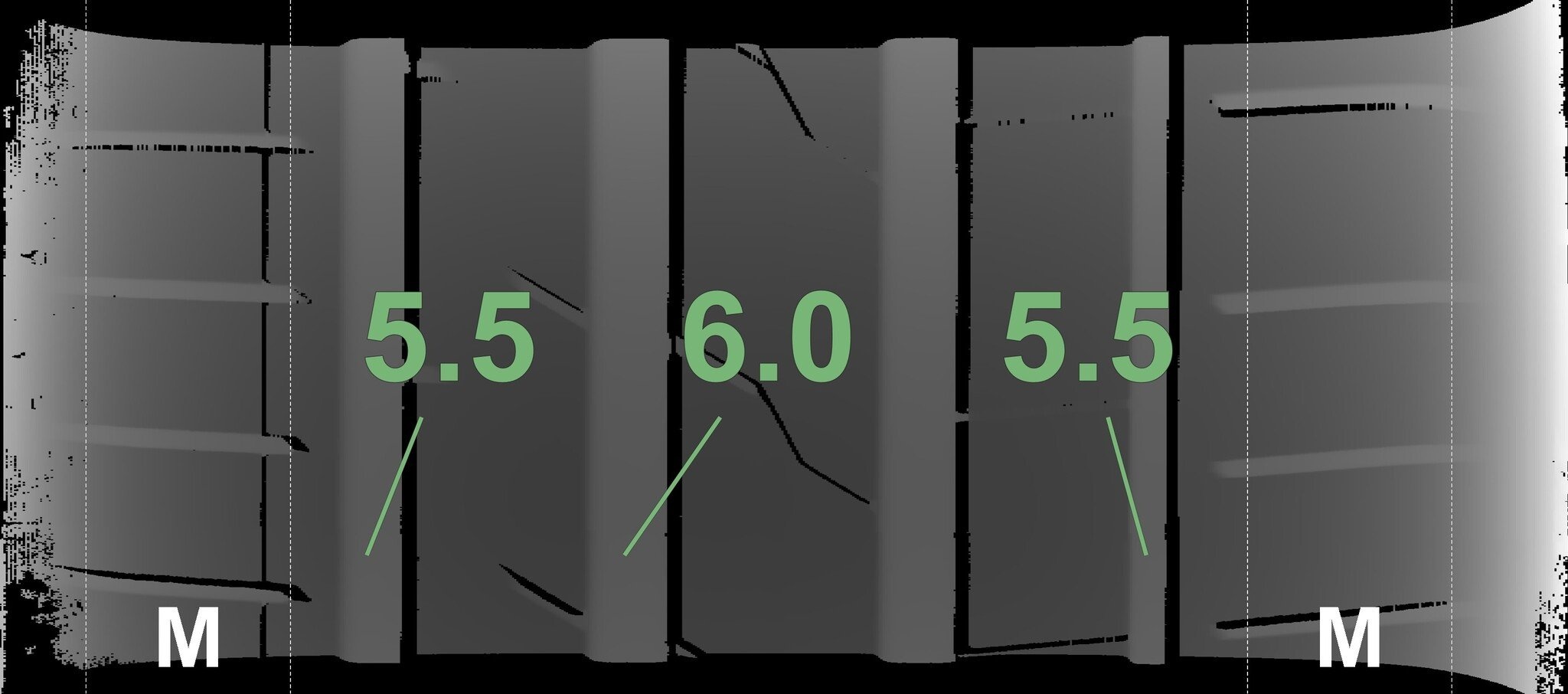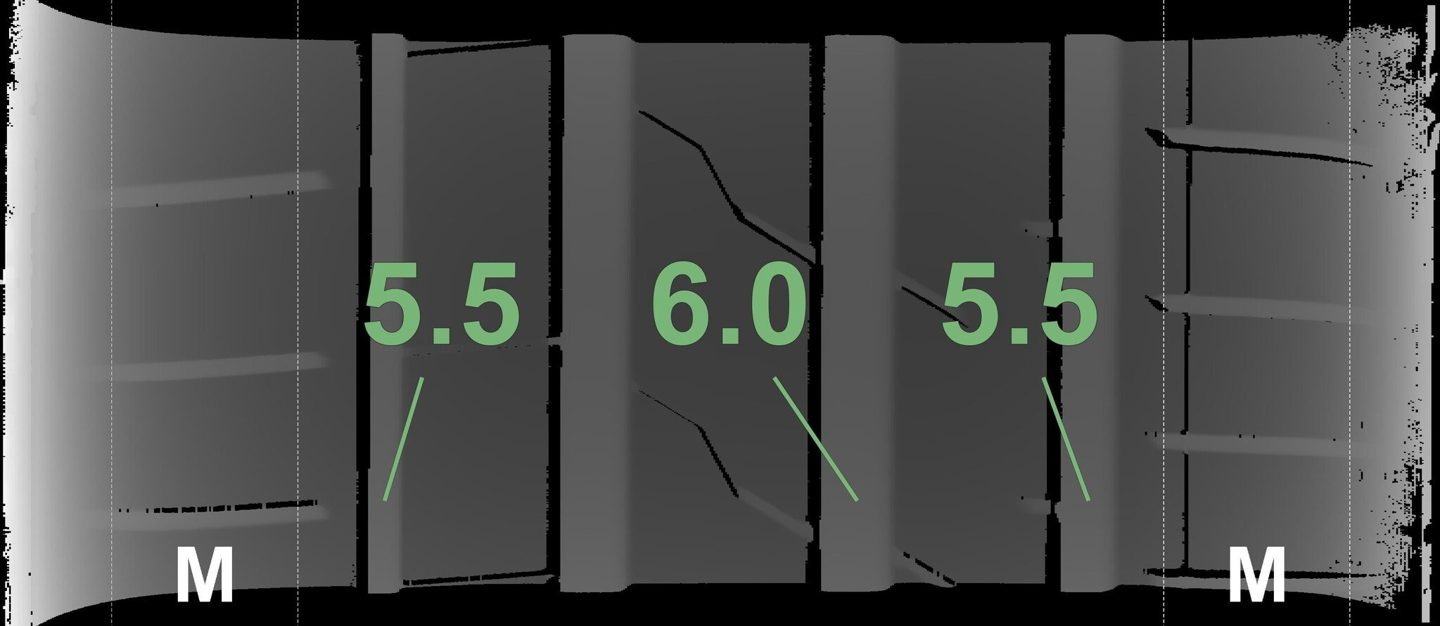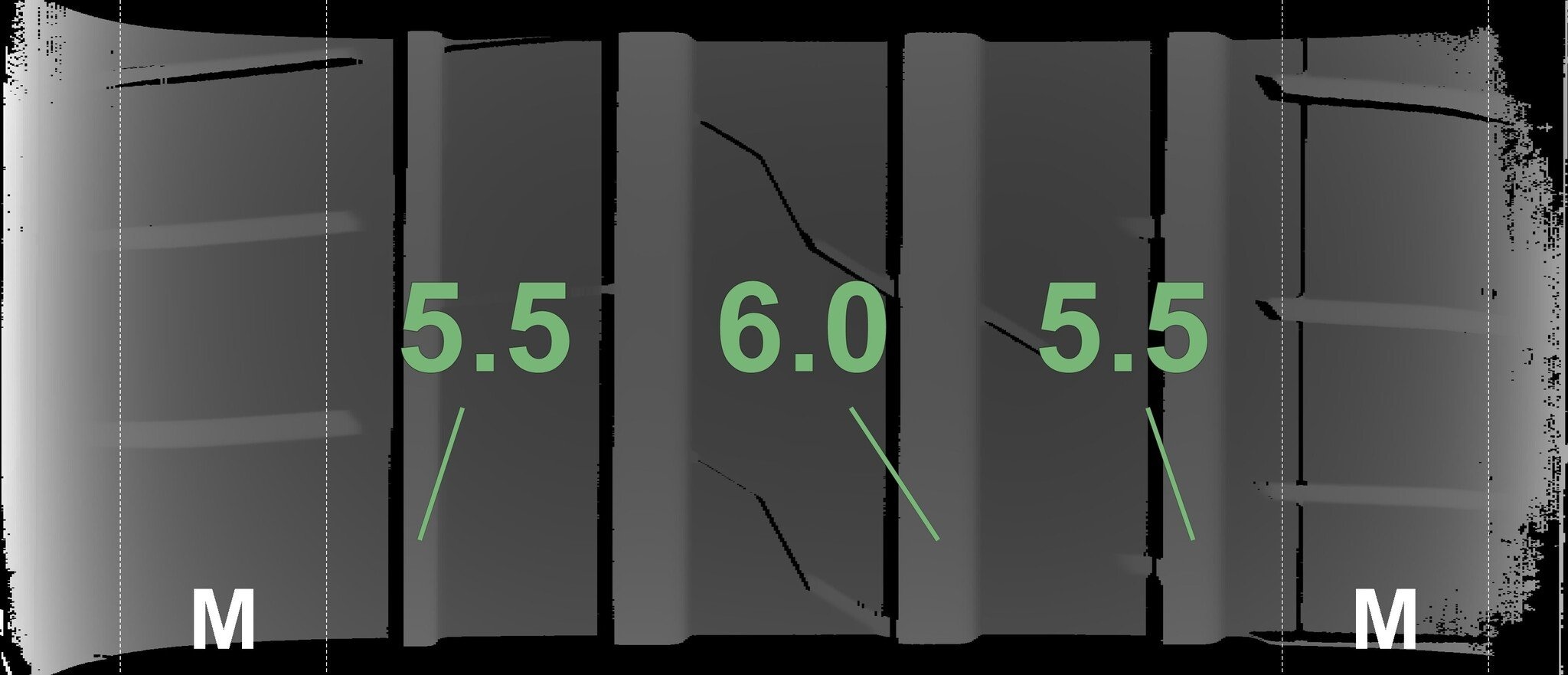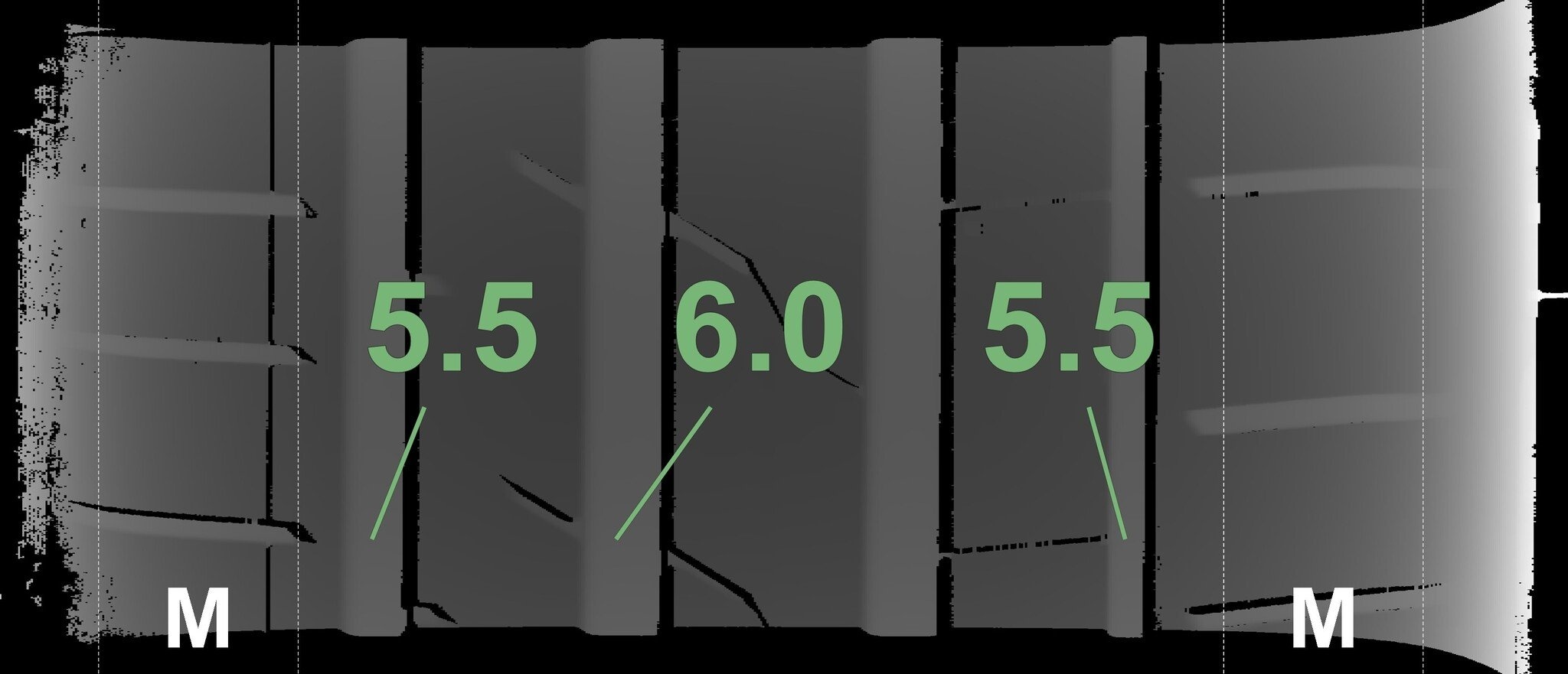 De gemeten profieldieptes en de details van de velgen zijn hierboven weergegeven.