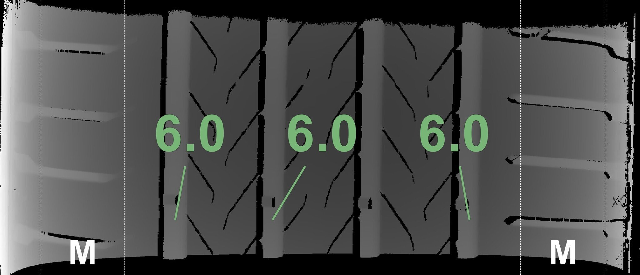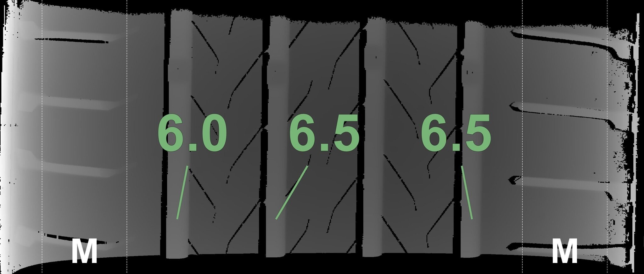 De gemeten profieldieptes en de details van de velgen zijn hierboven weergegeven.
