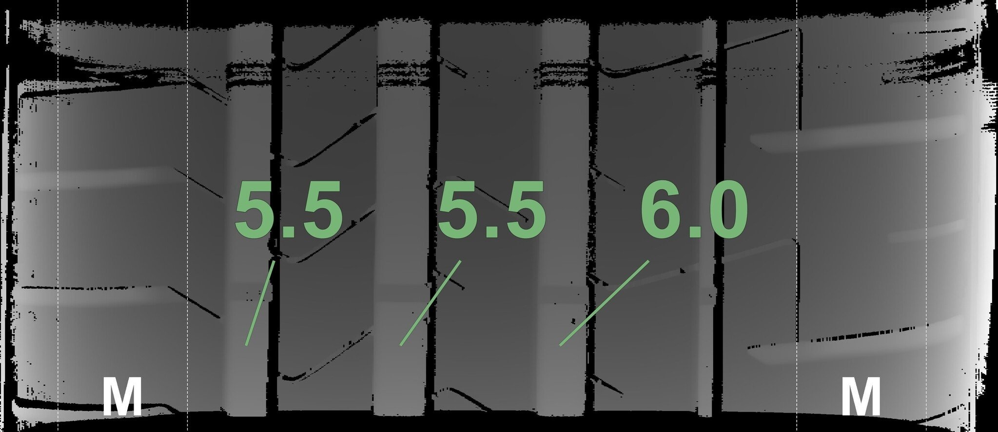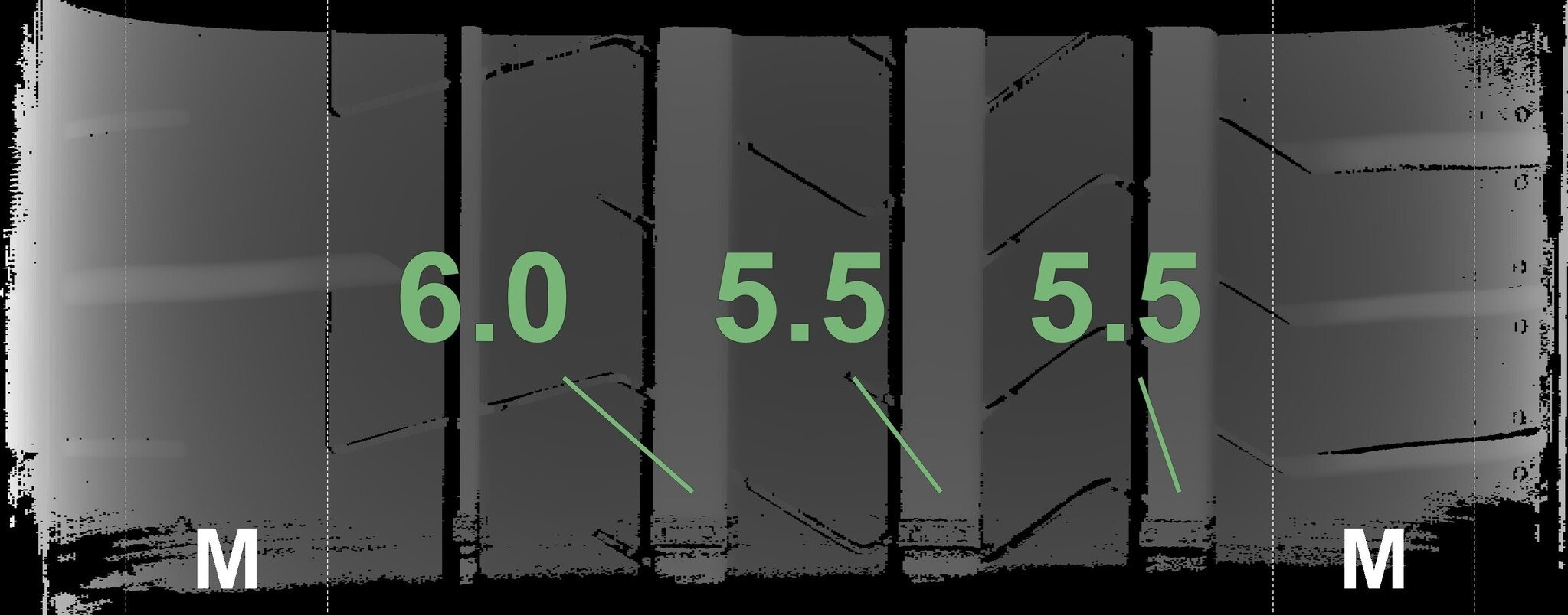 De gemeten profieldieptes en de details van de velgen zijn hierboven weergegeven.