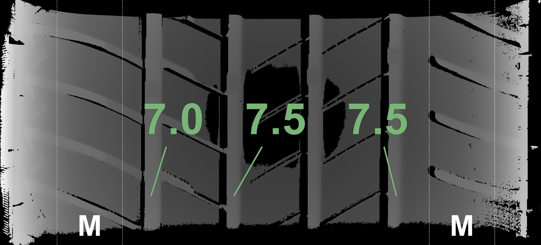 De gemeten profieldieptes en de details van de velgen zijn hierboven weergegeven.
