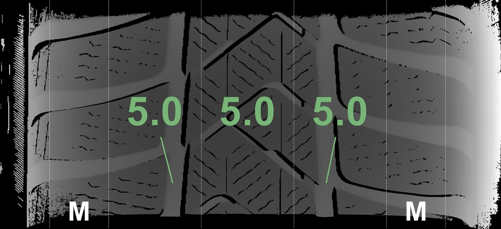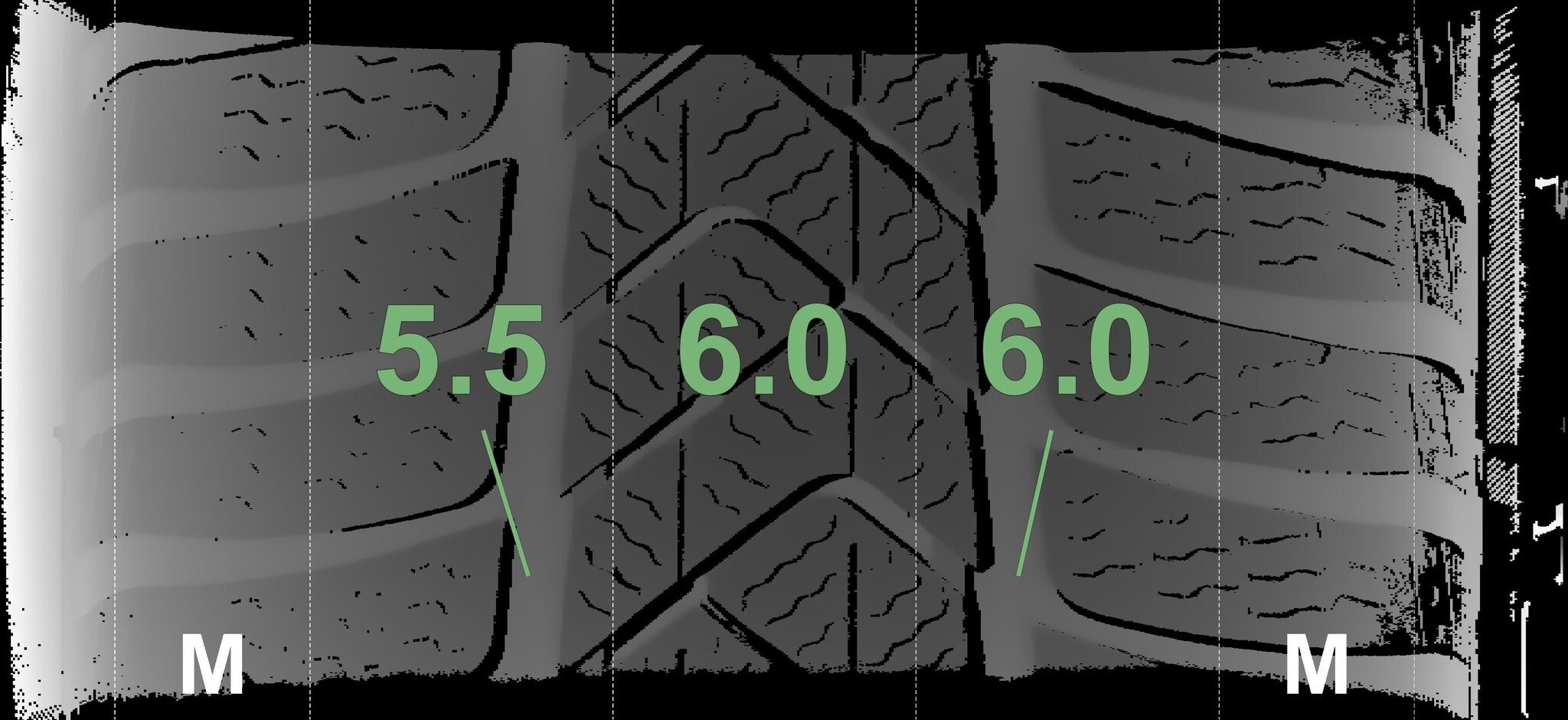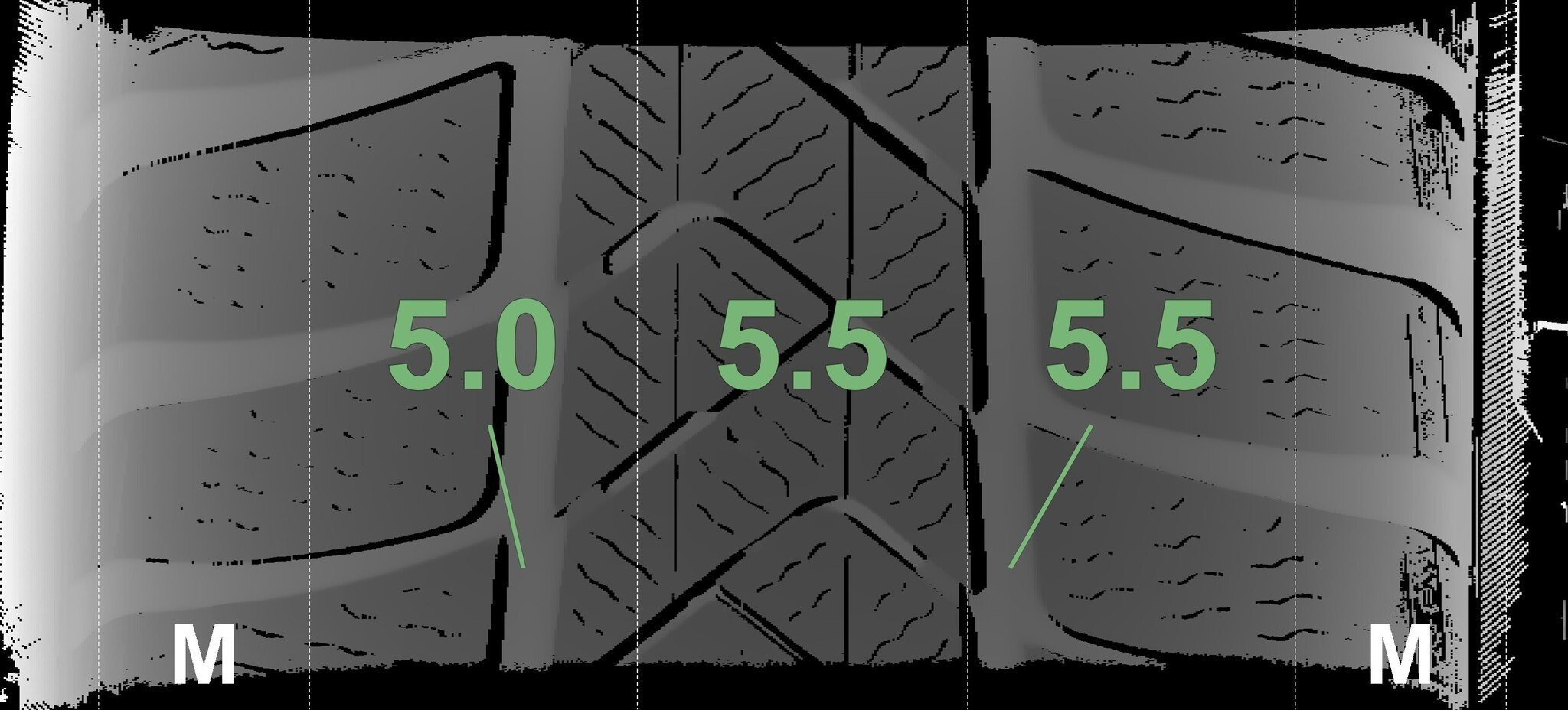 De gemeten profieldieptes en de details van de velgen zijn hierboven weergegeven.