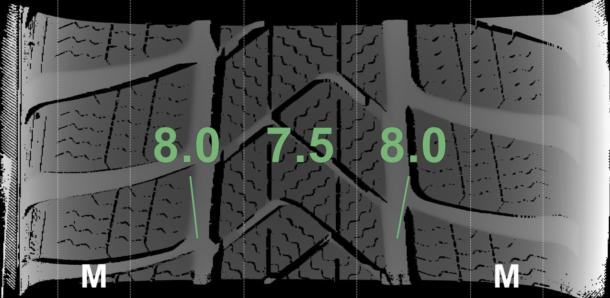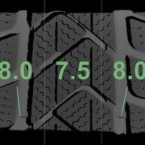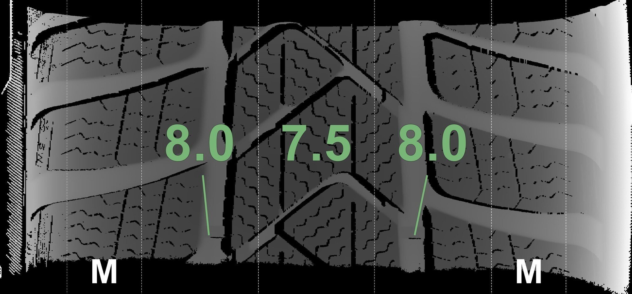 De gemeten profieldieptes en de details van de velgen zijn hierboven weergegeven.