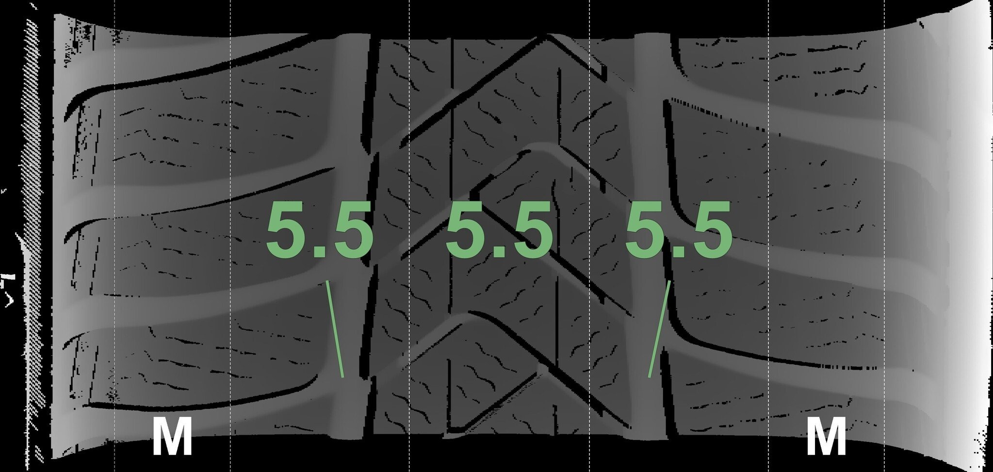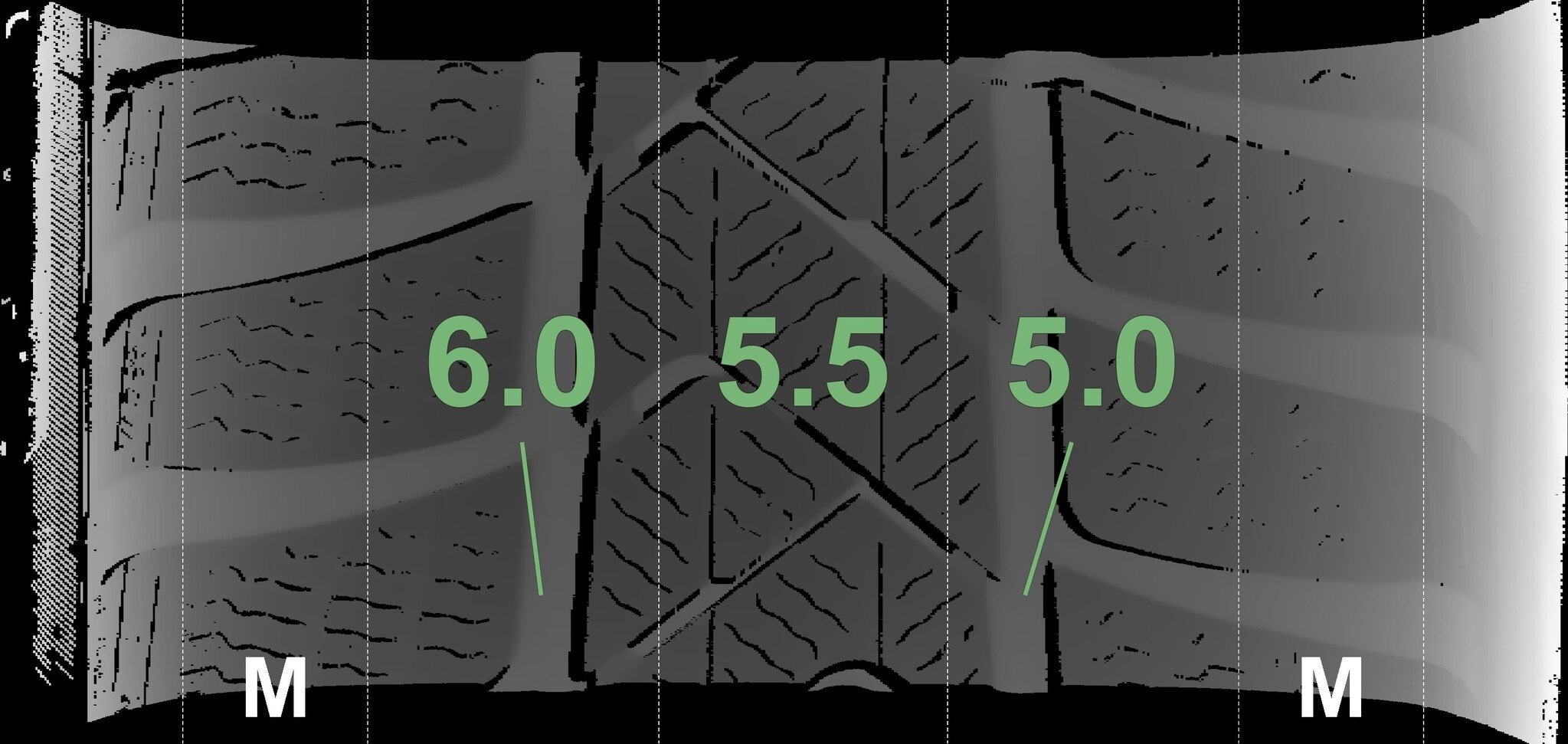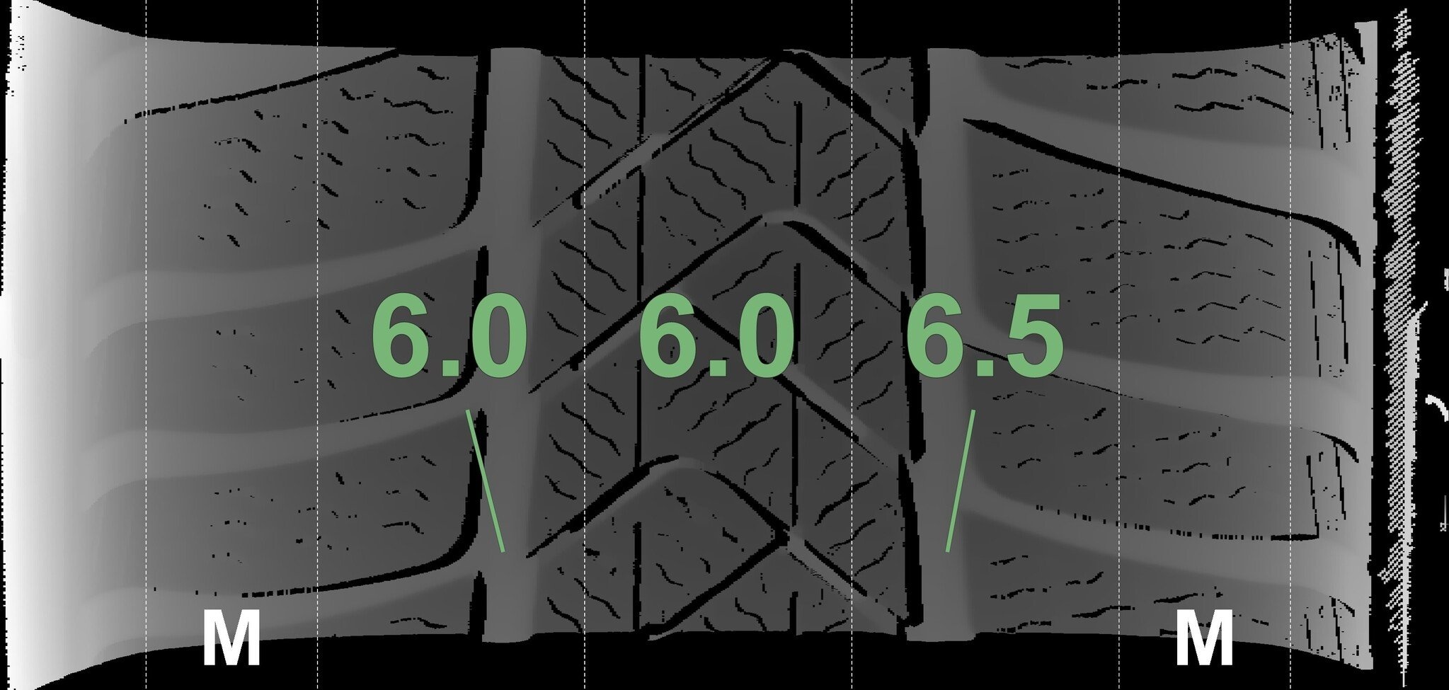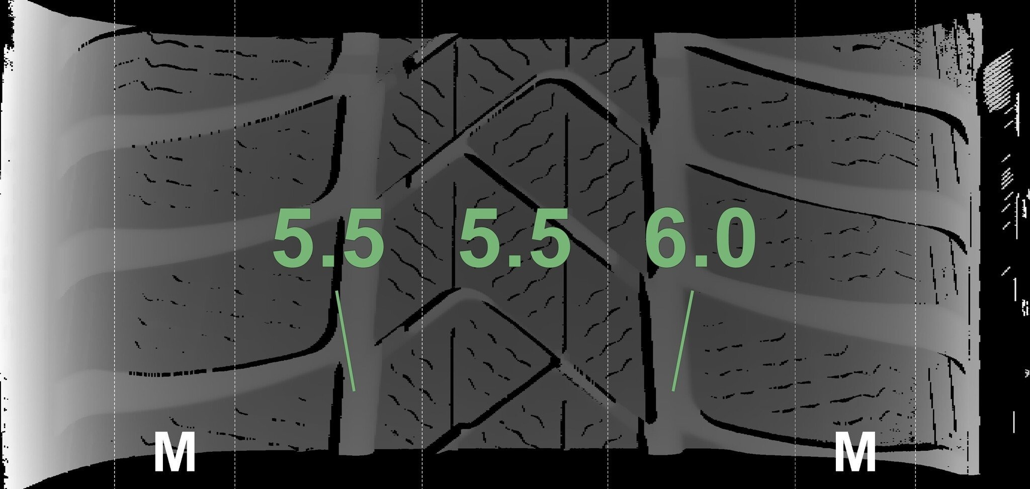 De gemeten profieldieptes en de details van de velgen zijn hierboven weergegeven.