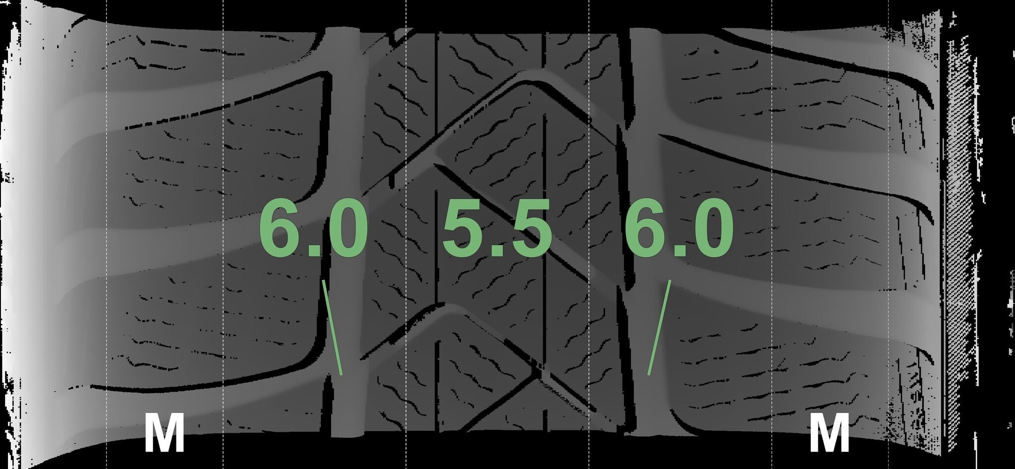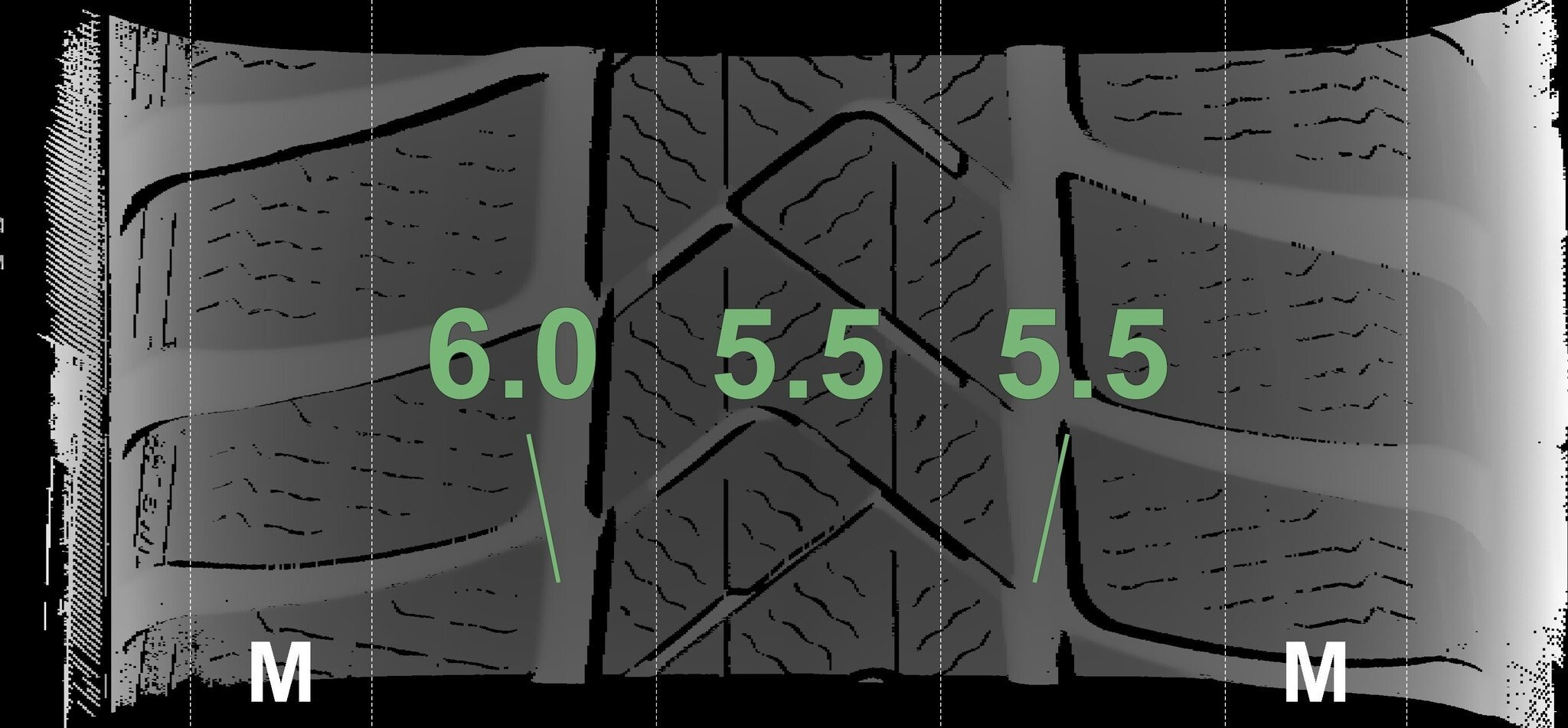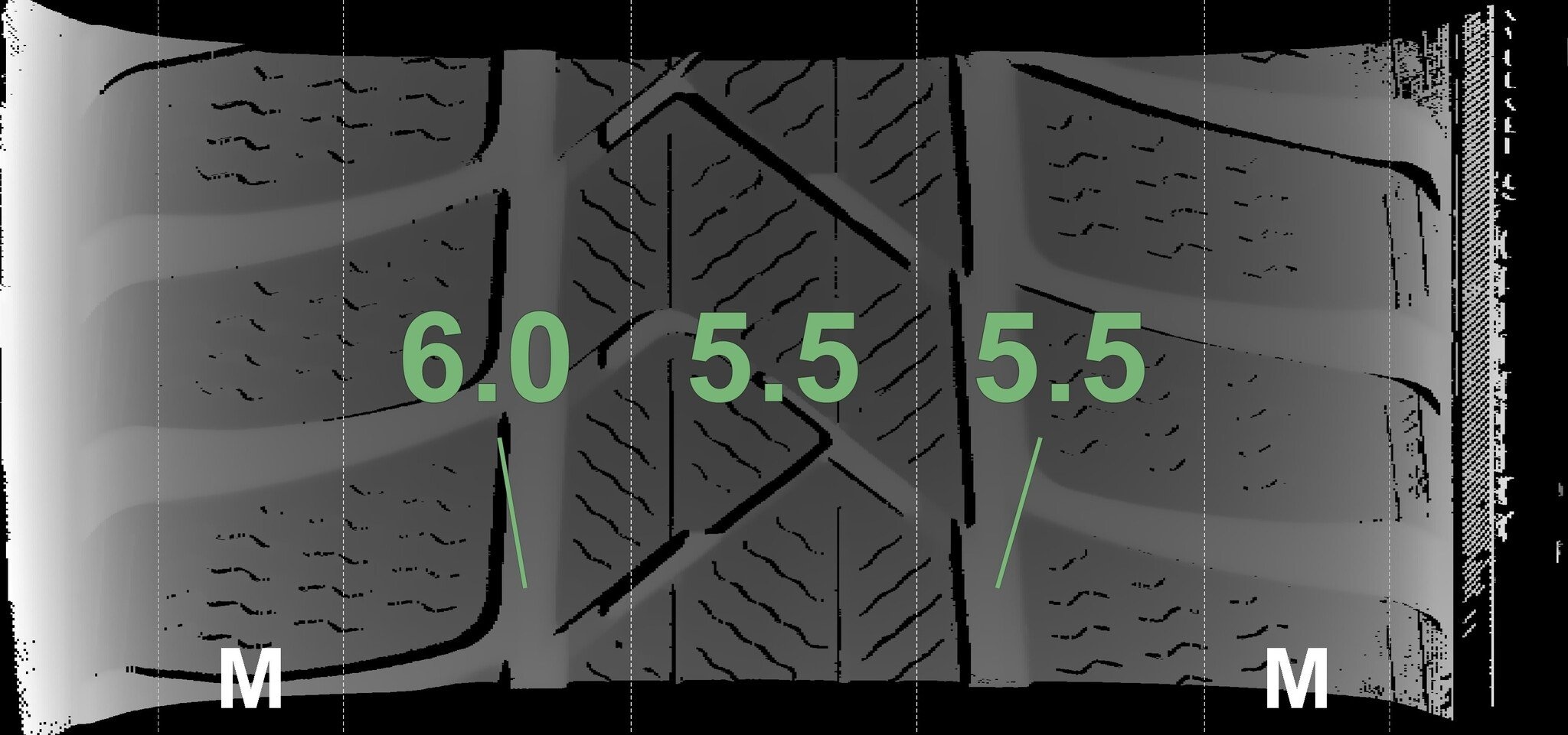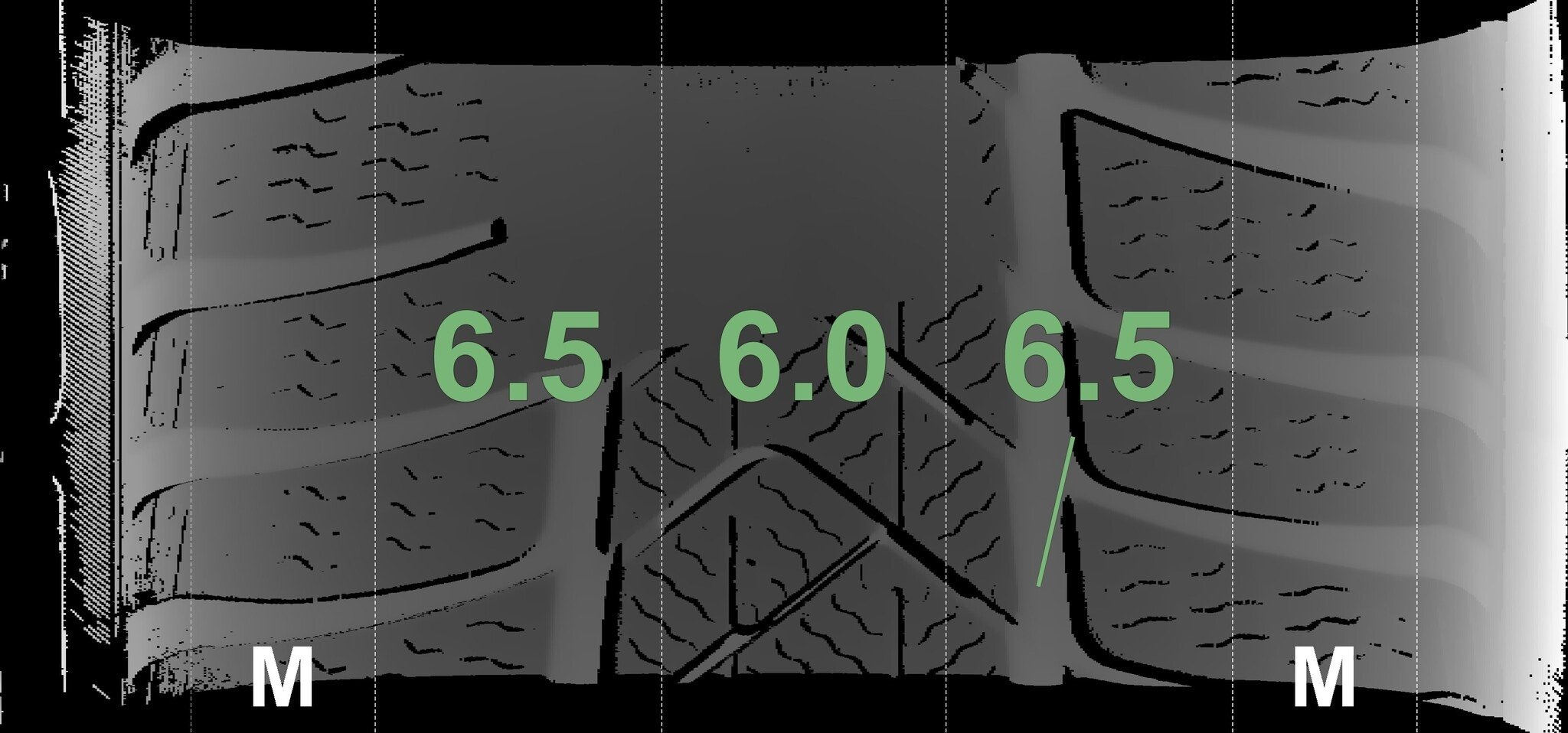 De gemeten profieldieptes en de details van de velgen zijn hierboven weergegeven.