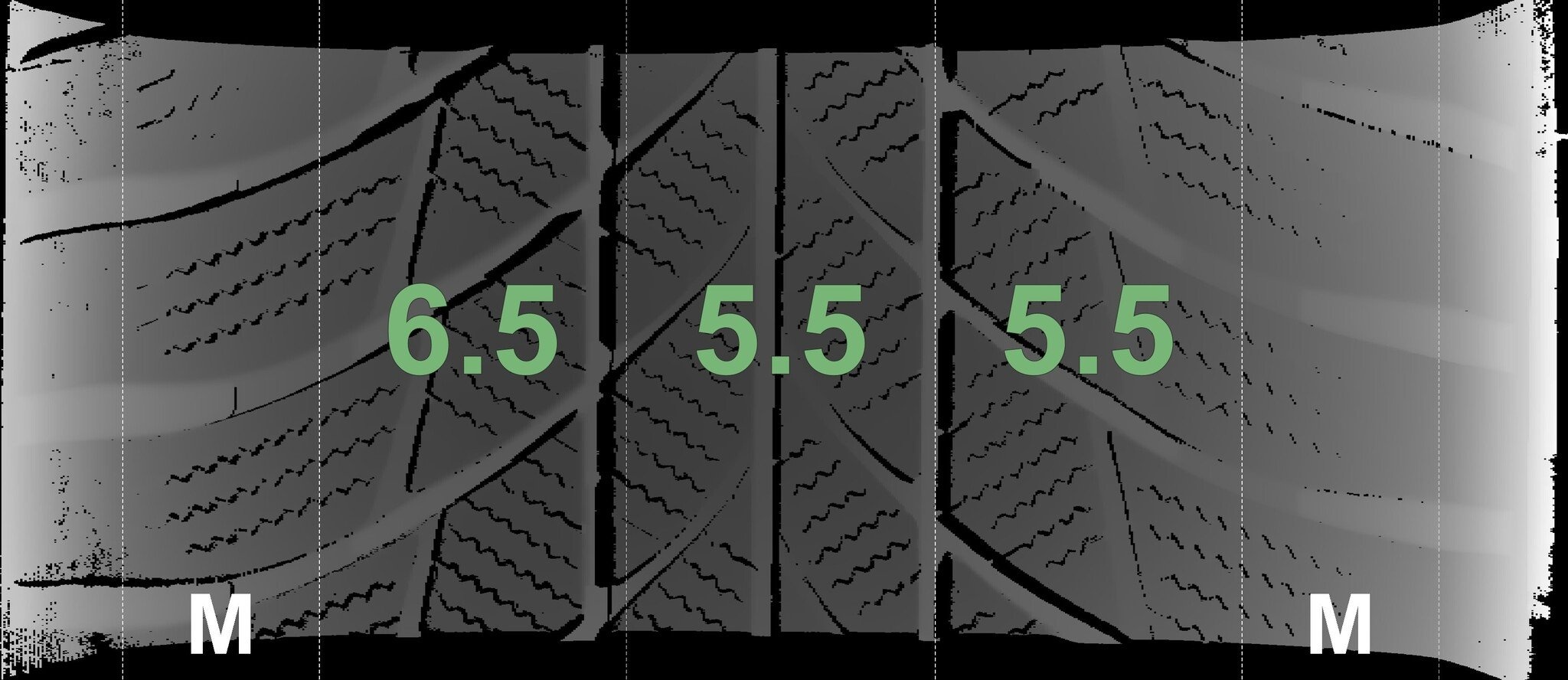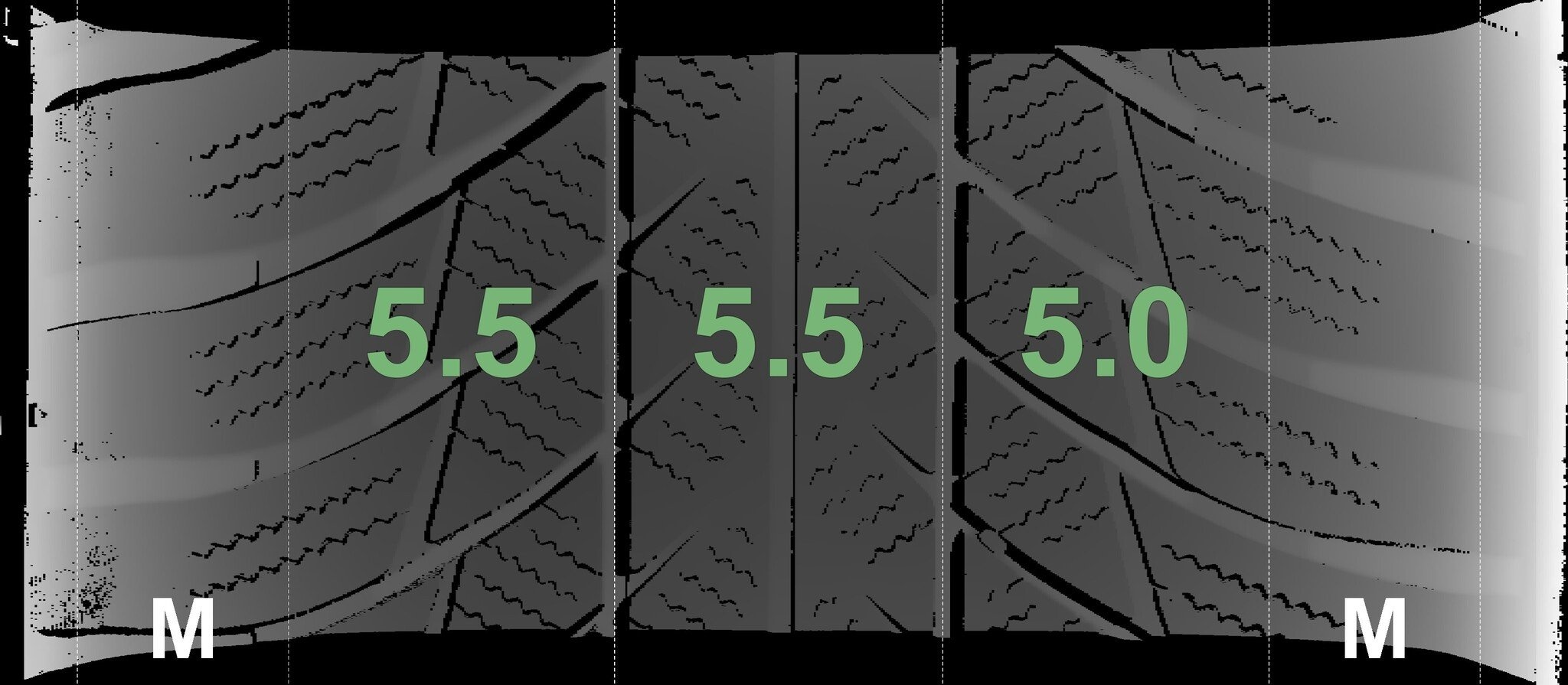 De gemeten profieldieptes en de details van de velgen zijn hierboven weergegeven.