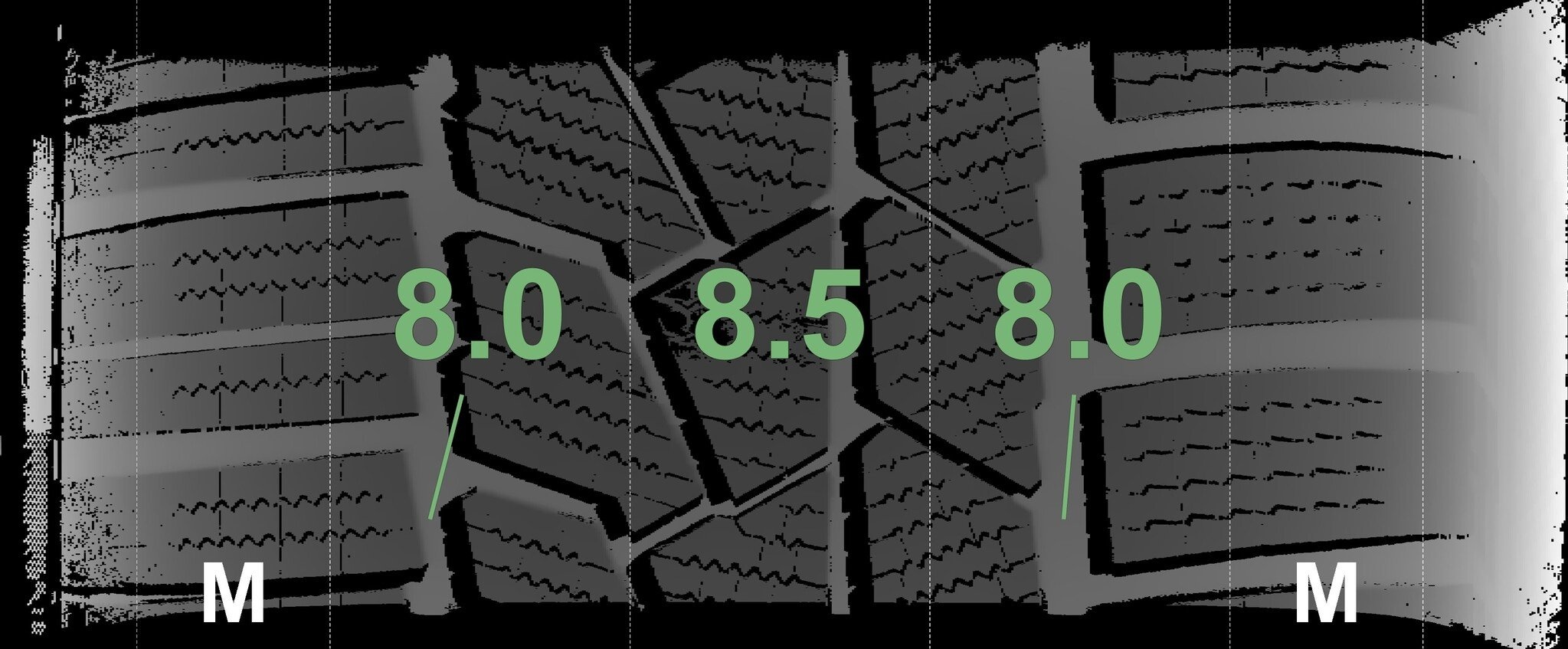 De gemeten profieldieptes en de details van de velgen zijn hierboven weergegeven.